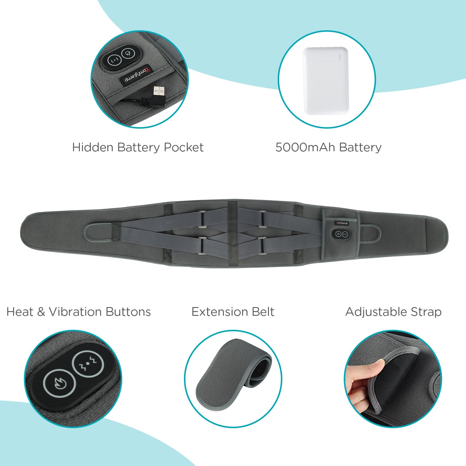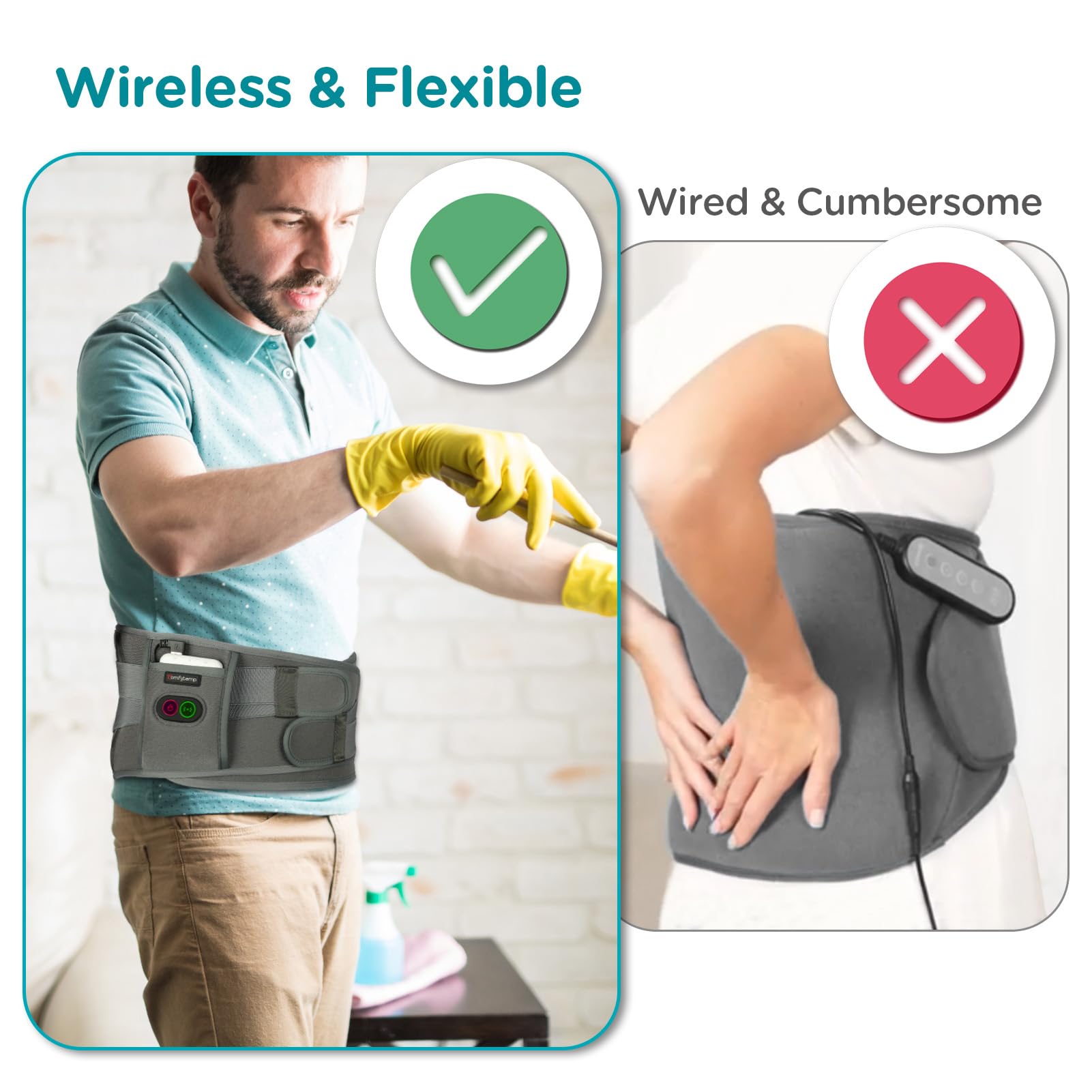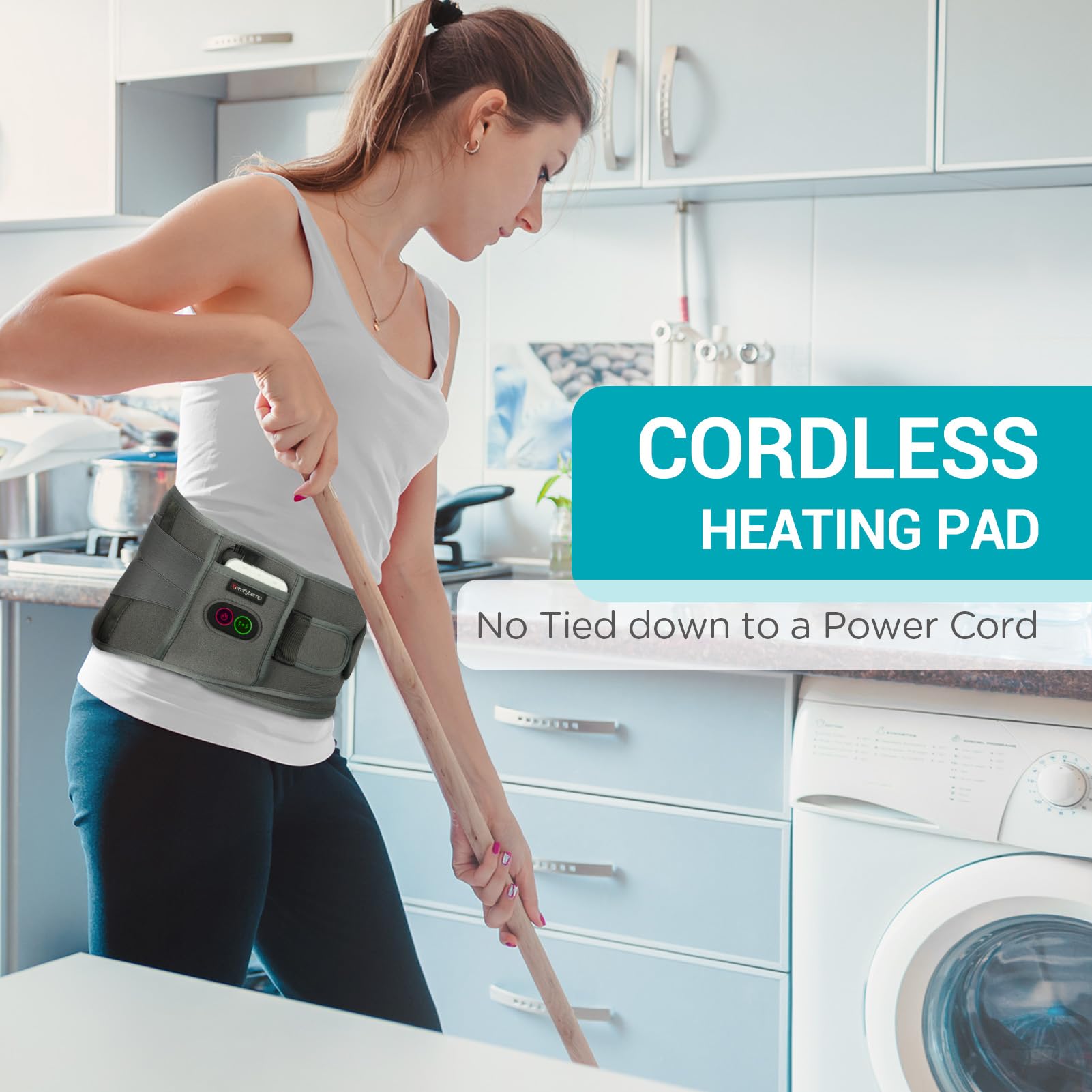 Cordless and Portable: Comfytemp portable heating pad is 5000mAh battery operated (included). It's not to be tied down to a power cord anymore. Use it freely when doing housework, driving a car, or working on the computer.