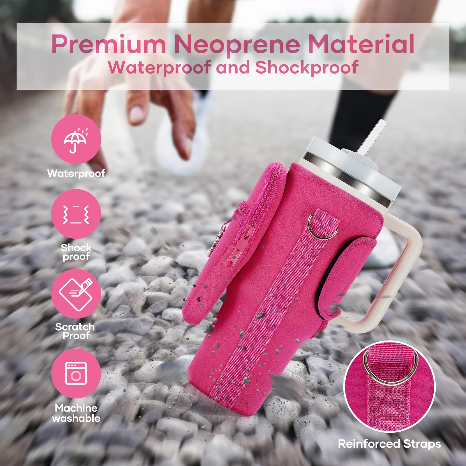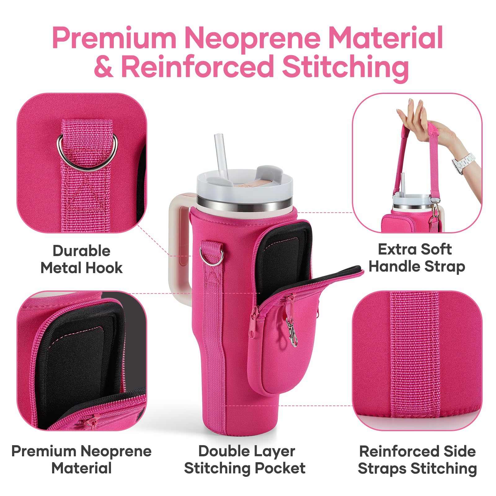 Premium Neoprene Material & Reinforced Stitching Strap : This Bottle carrier bag for 40/30oz Stanley is made of neoprene material, features soft outer texture, waterproof, shock absorption, protect your Stanley cup from collision, and scratches, Premium Neoprene material enhance the insulation function (whether hot or cold)! Reinforced Stitching Strap will keep the perfect shape of the carrier bag fits your Stanley cup and supports it more durable and stable when you hang out, easier to carry.