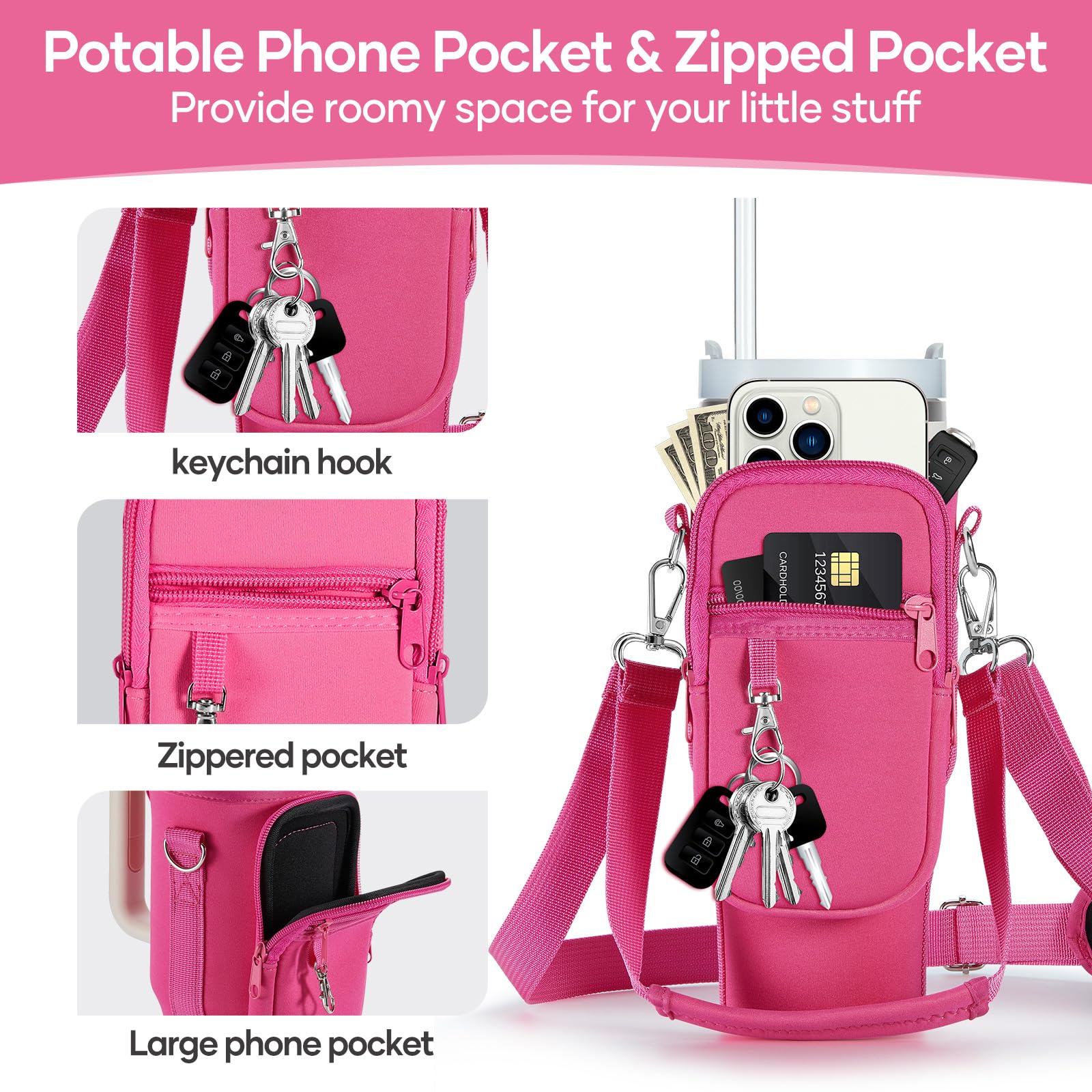 Multiple Pockets Free Your Hands: The stanley cup holder bag designed with two zippered pocket, including a upgraded phone pocket which could let one hand get the phone in-and-out easier, while another zippered pocket provide enough room for little stuff as cash, ID, credit card, work badge, chapstick, pen, and earbuds in the pockets. The keychain hook for attaching your key and other little accessories. Let's go out with this hands free Stanley Carry All bag.