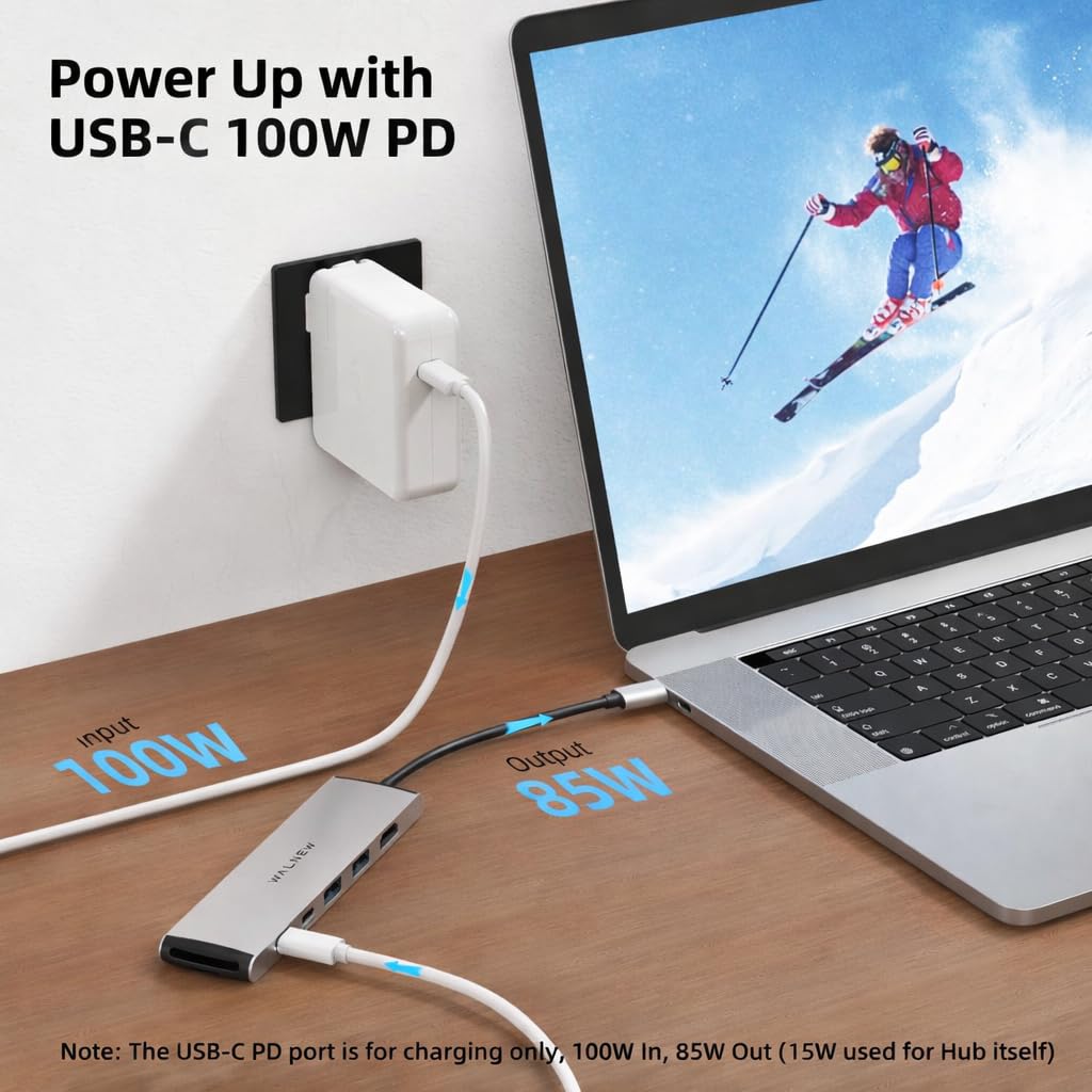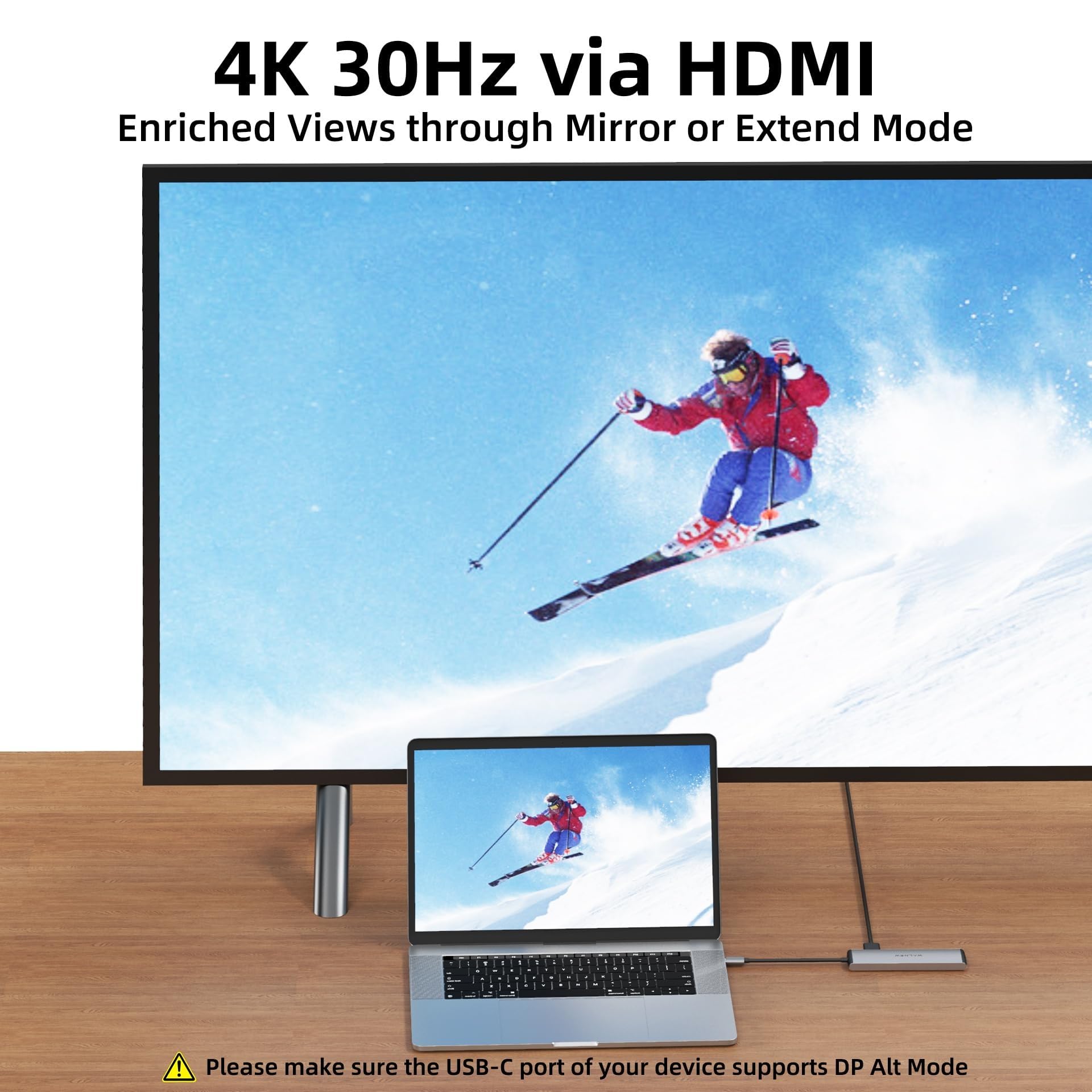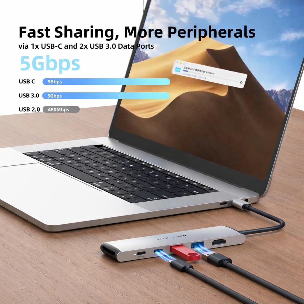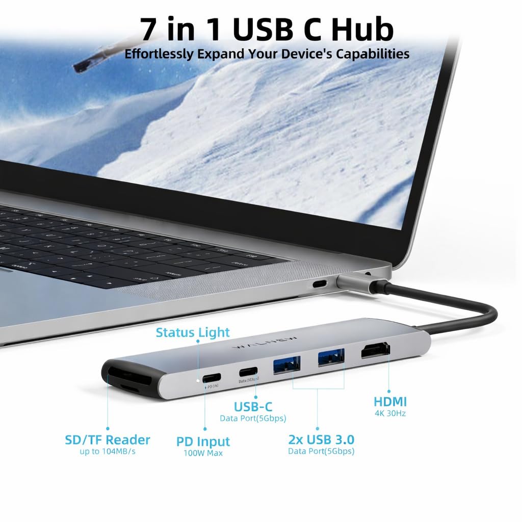 [7-in-1 USB-C Hub] USB Hub with 1* HDM port, 1*100W USB-C Power Delivery (PD) input port, 1* USB-C and 2 *USB 3.0 5Gbps data ports, 1*MicroSD card slot, and 1*SD card slot, multiport connectivity to satisfy all your expansion needs, and provide your work efficiency at home ,in the office or on the go.