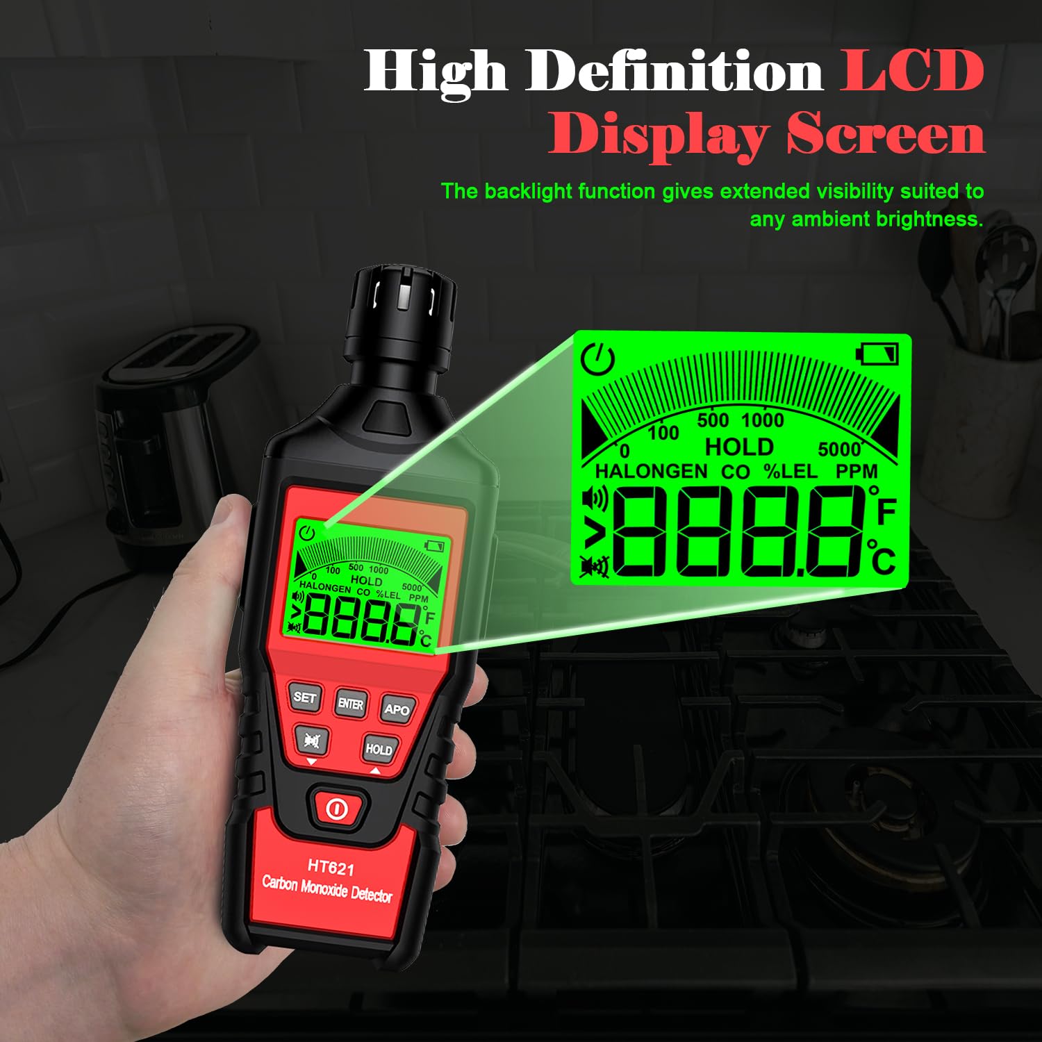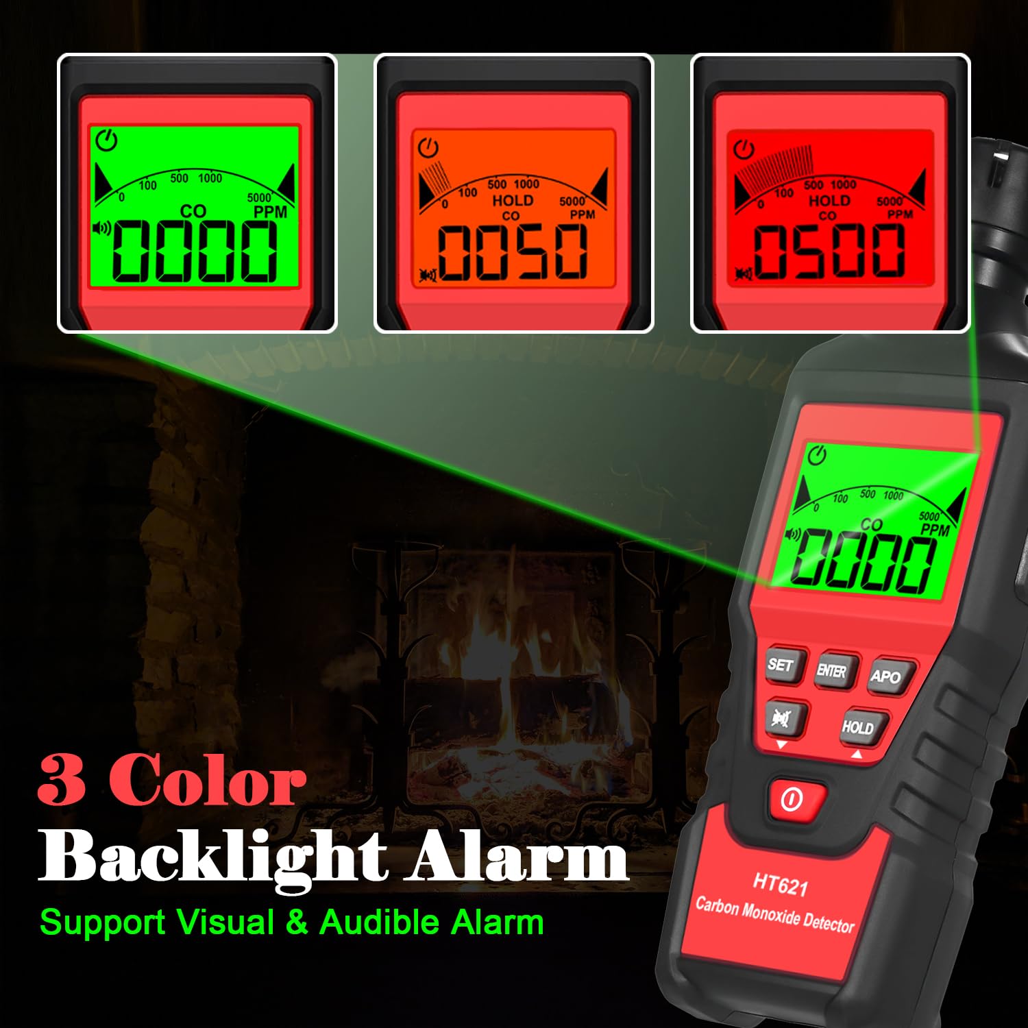 【Visual & Audible】This portable CO detector uses both visual and audible display. When the concentration of CO is detected to be greater than the preset value (low value 50PPM, high value 500PPM, can be manually adjusted), the co detector will emit a beeping sound and the screen red light flashing. The sound can be manually turned off.