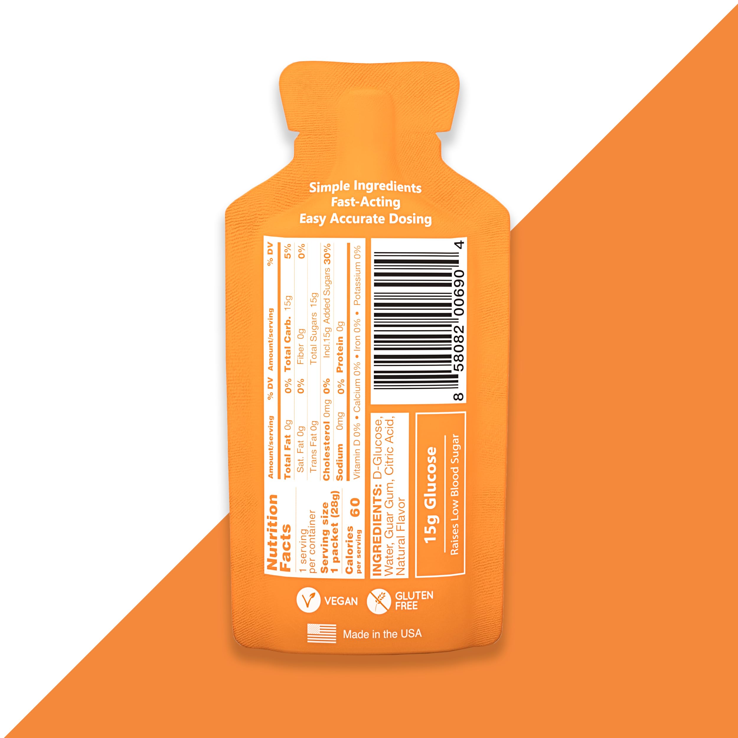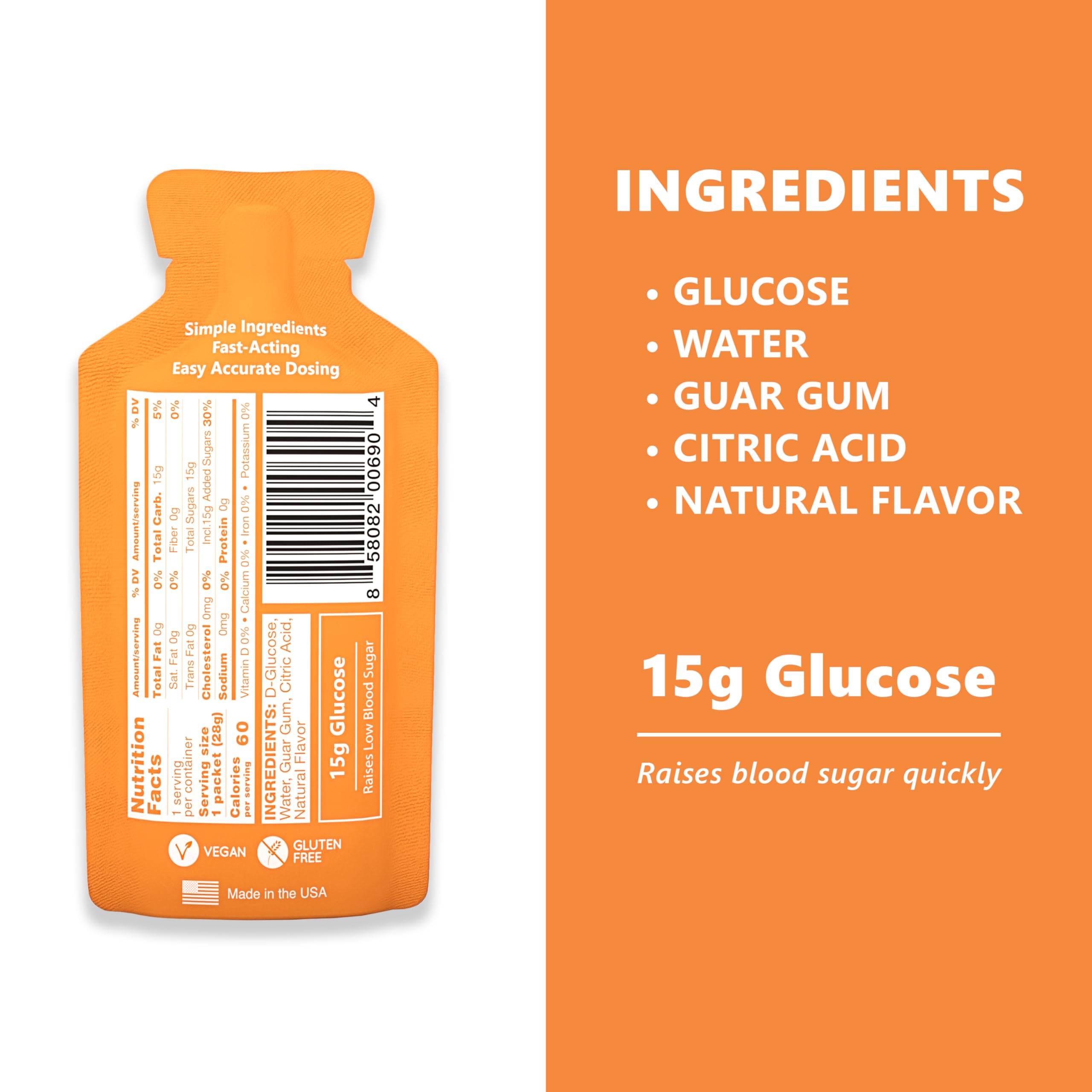 15 grams of fast-acting glucose in a quick-to-eat liquid gel form. Vegan, gluten free, and no preservatives.