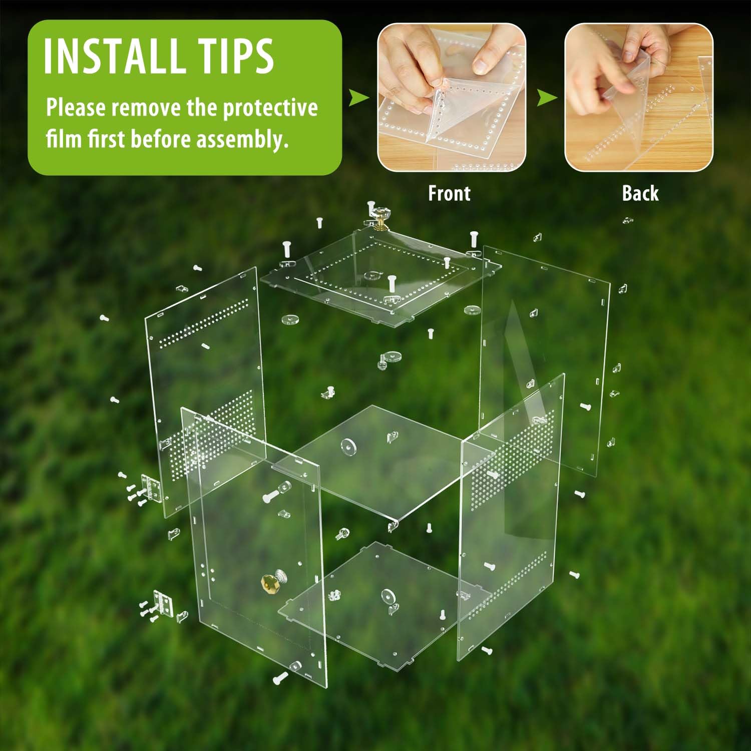 【 DIY Installation & Pro Tip 】 Assemble the spider terrarium is hassle-free in minutes. Peel off the protective films on both sides before setup. For dual spiders, change the orientation of the side panels during assembly to maximize air circulation