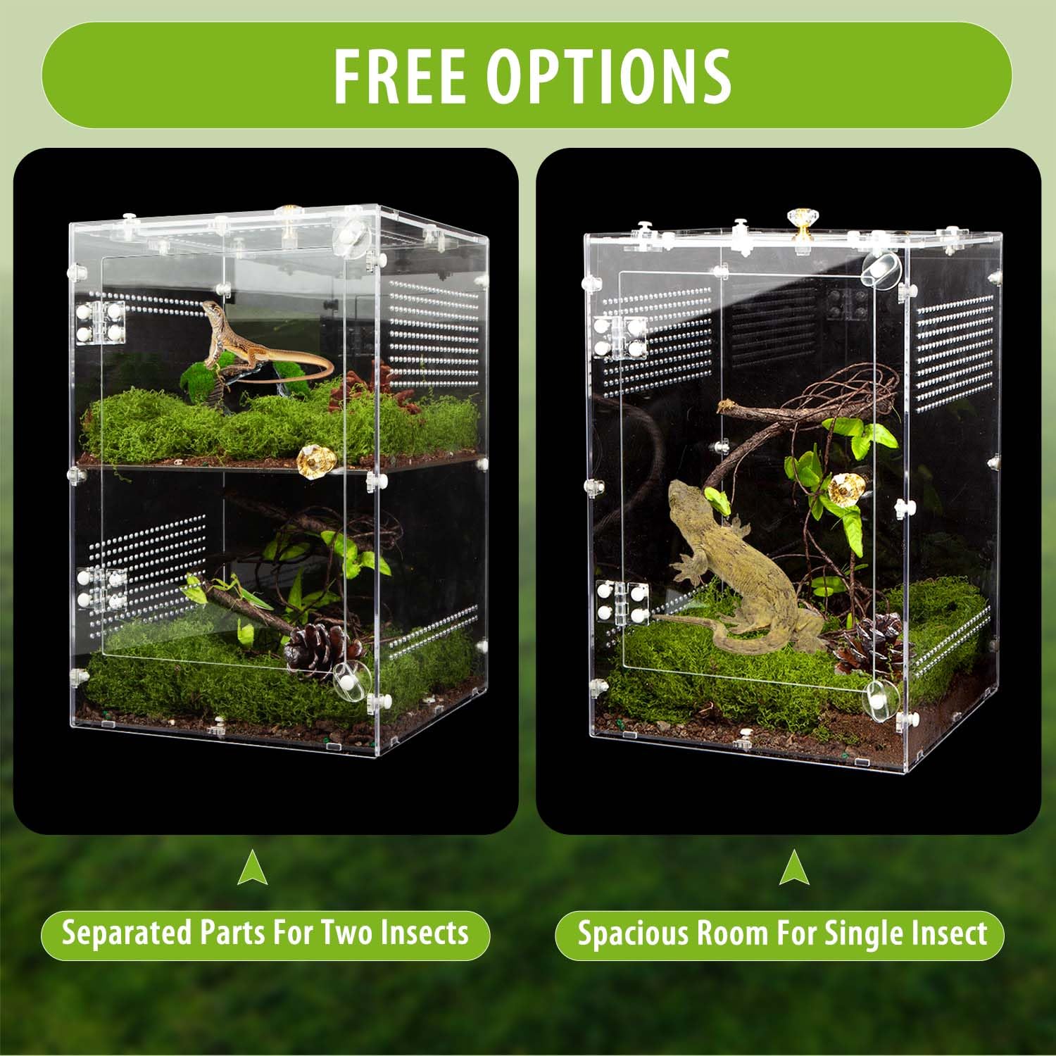 【 Spacious Dual-Layer Design 】Measuring 12"H x 8"L x 8"W, this large reptile terrarium provides roomier living space for one small pet, or use the divider to house two smaller reptiles or insects comfortably and seperately. Hope your friend enjoy and love a new home