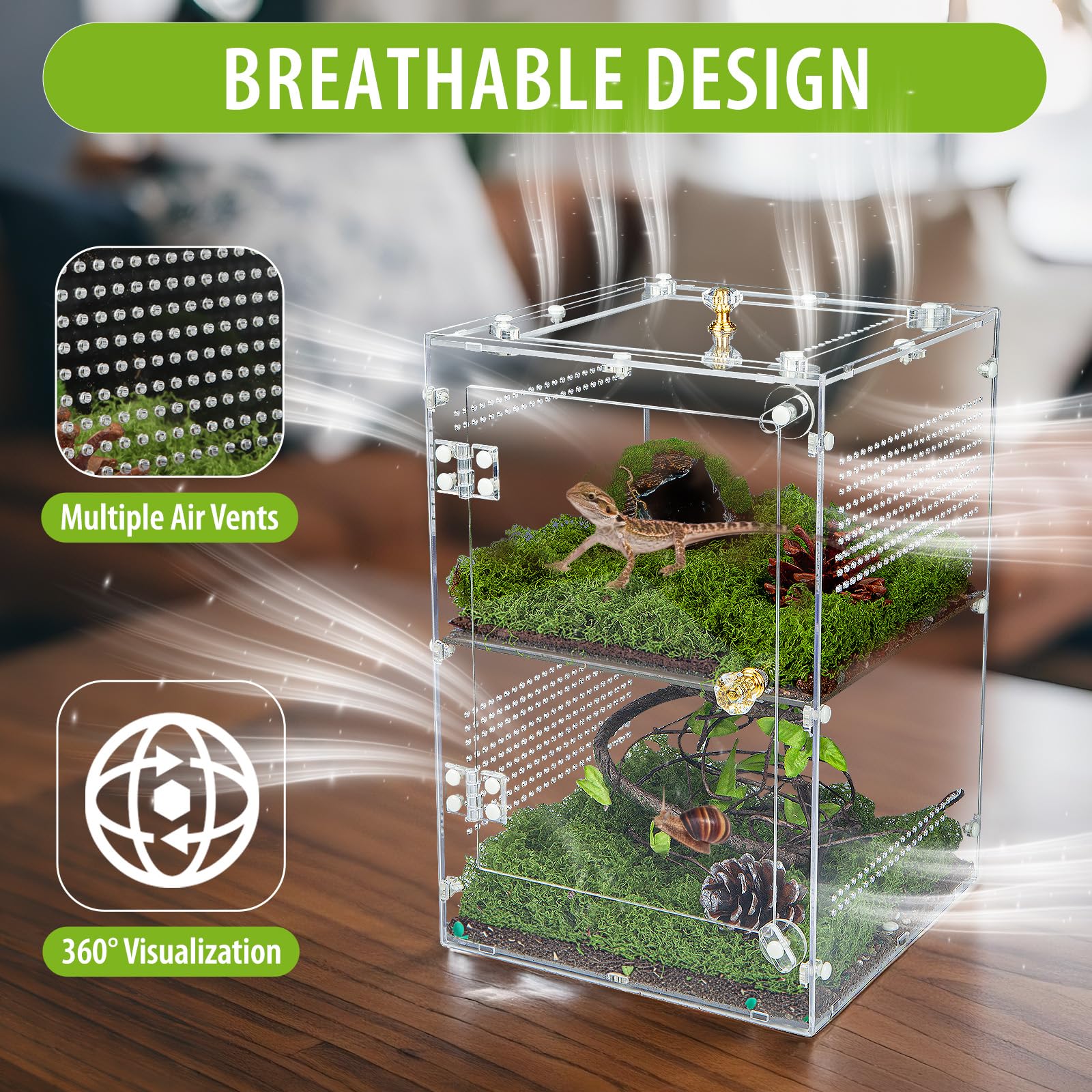 【 Premium Material 】This tarantula enclosure is crafted from thick, scratch-resistant acrylic for long-lasting use. Features front and top openings for easy feeding and cleaning. and the rotatable lock insurance of two locks for doors and multiple rivets prevent pets from escaping well