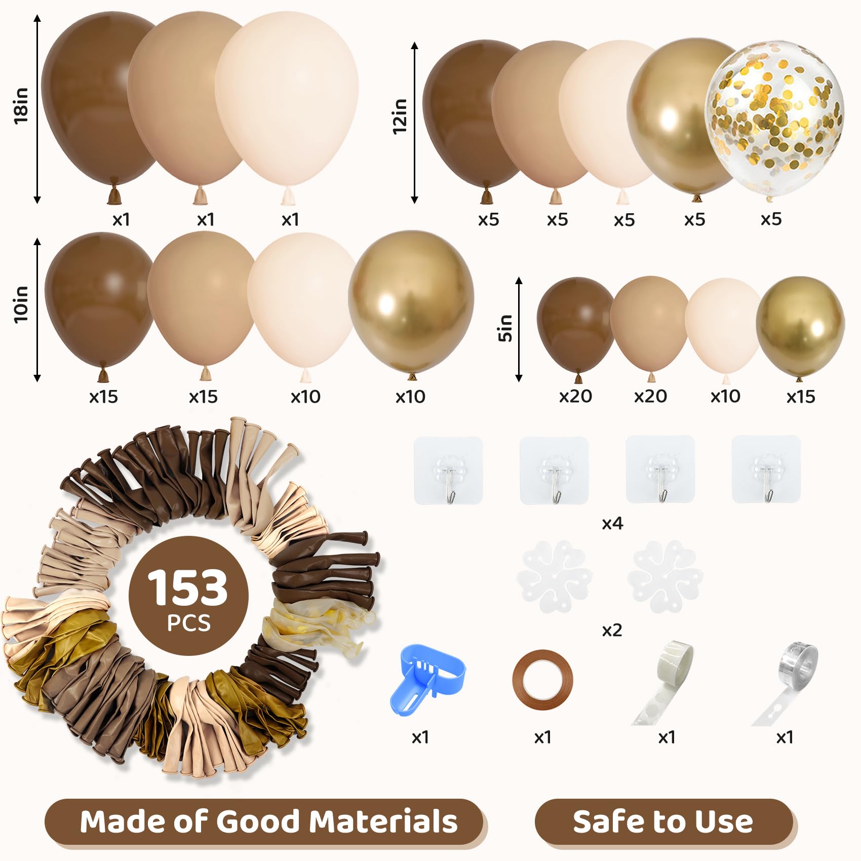Sufficient Quantity of Brown Balloons: The brown balloon arch kit includes 18” brown/coffee brown/nude balloons(3 pcs), 12” brown/coffee brown/nude/metallic gold/ confetti gold balloons(25 pcs), 10”brown/coffee brown/nude/metallic gold balloons(50 pcs), 5”brown/coffee brown/nude/metallic gold balloons(65 pcs) and 10 pcs balloon tools(balloon arch strips, tying tool, 100 glue points, ribbon, flower balloon clip, hook)