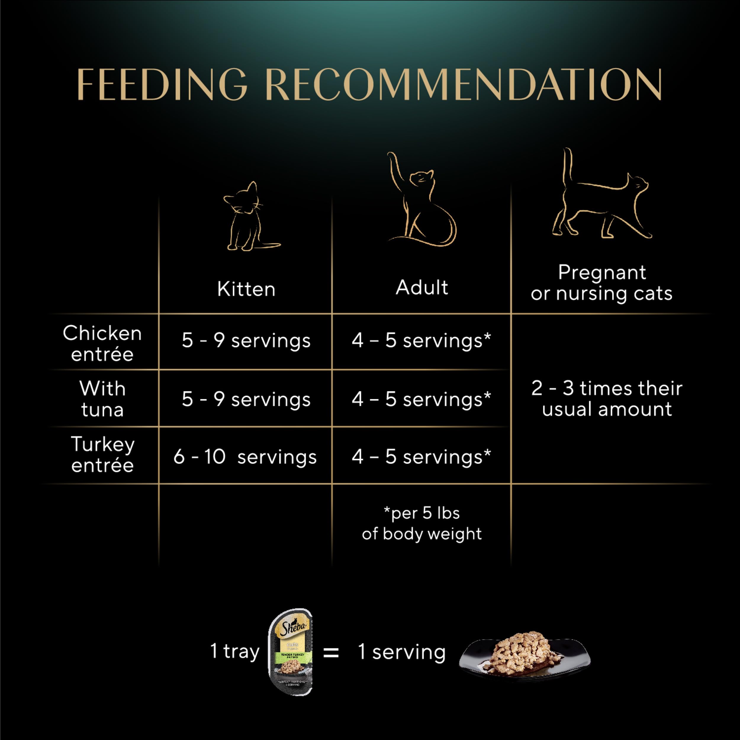 Cats know what they want: the delicious taste of Sheba Perfect Portions Wet Cat Food Cuts In Gravy. The succulent cuts of roasted Chicken, with sustainable Tuna, or tender Turkey in a delicious gravy deliver a wet cat food your feline will love. Sheba Perfect Portions Wet Cat Food has two convenient, portioned trays for a delicious serving with zero messy leftovers every time. Sheba Wet Cat Food is formulated without grains, corn, or soy and contains no artificial flavors or preservatives; although trace amounts may be present due to cross-contact during manufacturing. Even the pickiest cat is sure to enjoy it. Savor every delicious moment with Sheba Wet Cat Food Cuts in Gravy.