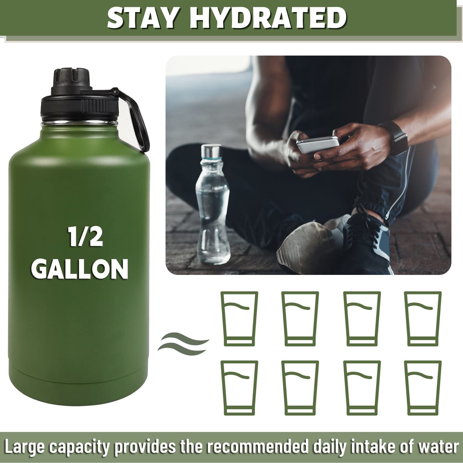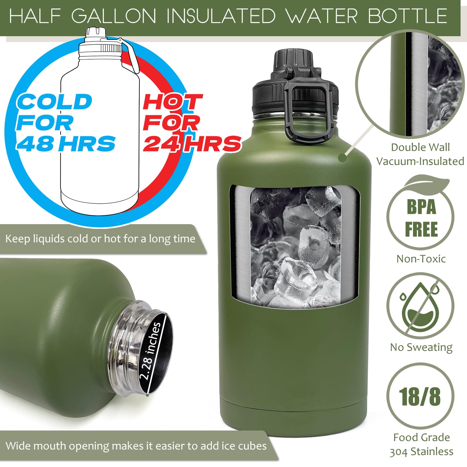64 oz Large Capacity for Constant Hydration ◊ If you want to stay hydrated, this 1/2 gallon water bottle saves you the trouble of refilling water. By using this insulated water jug and filling it only 1-2 times, you can easily accomplish your goal of drinking water for the day.