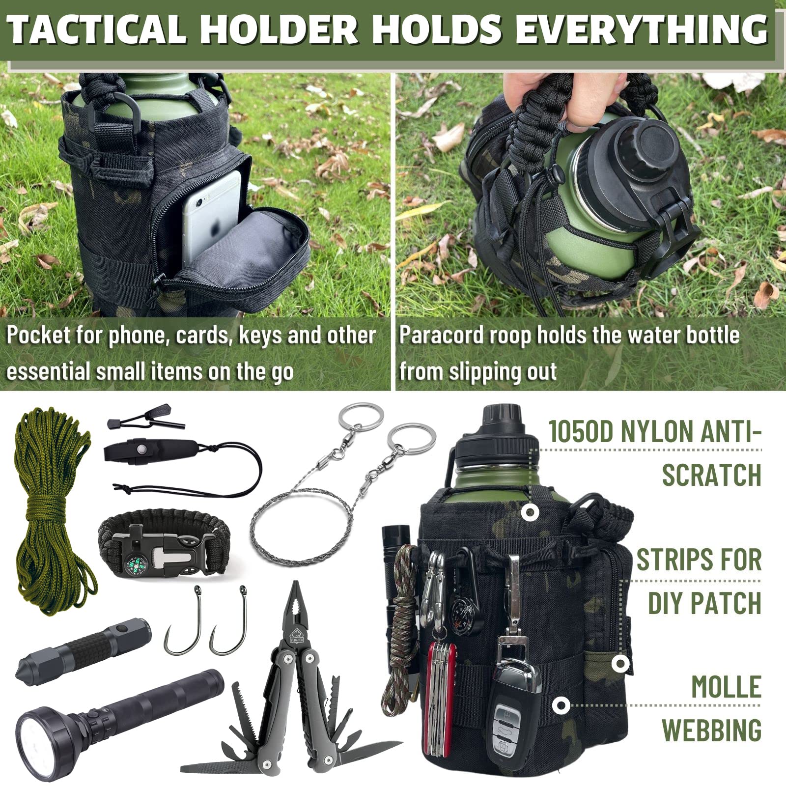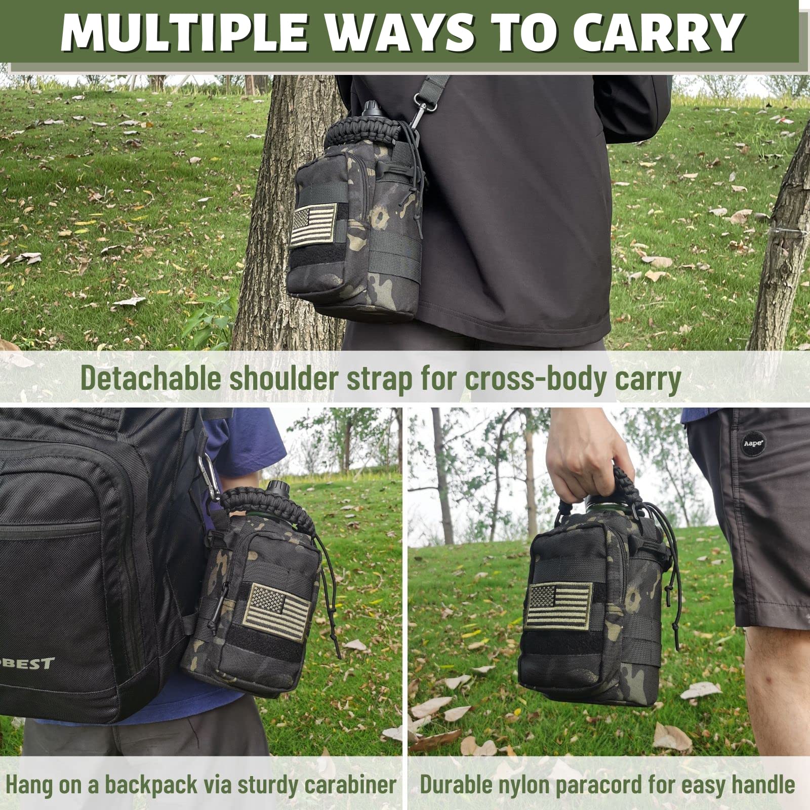 Tactical Sports Bottle with Holder ◊ The lid with handle, the paracord handle on the water bottle sleeve, and the detachable shoulder strap provide you with a variety of carrying options and travel convenience. The front pocket can hold your cell phone, keys, and other essentials. The MOLLE system offers more possibilities to carry more things with you.