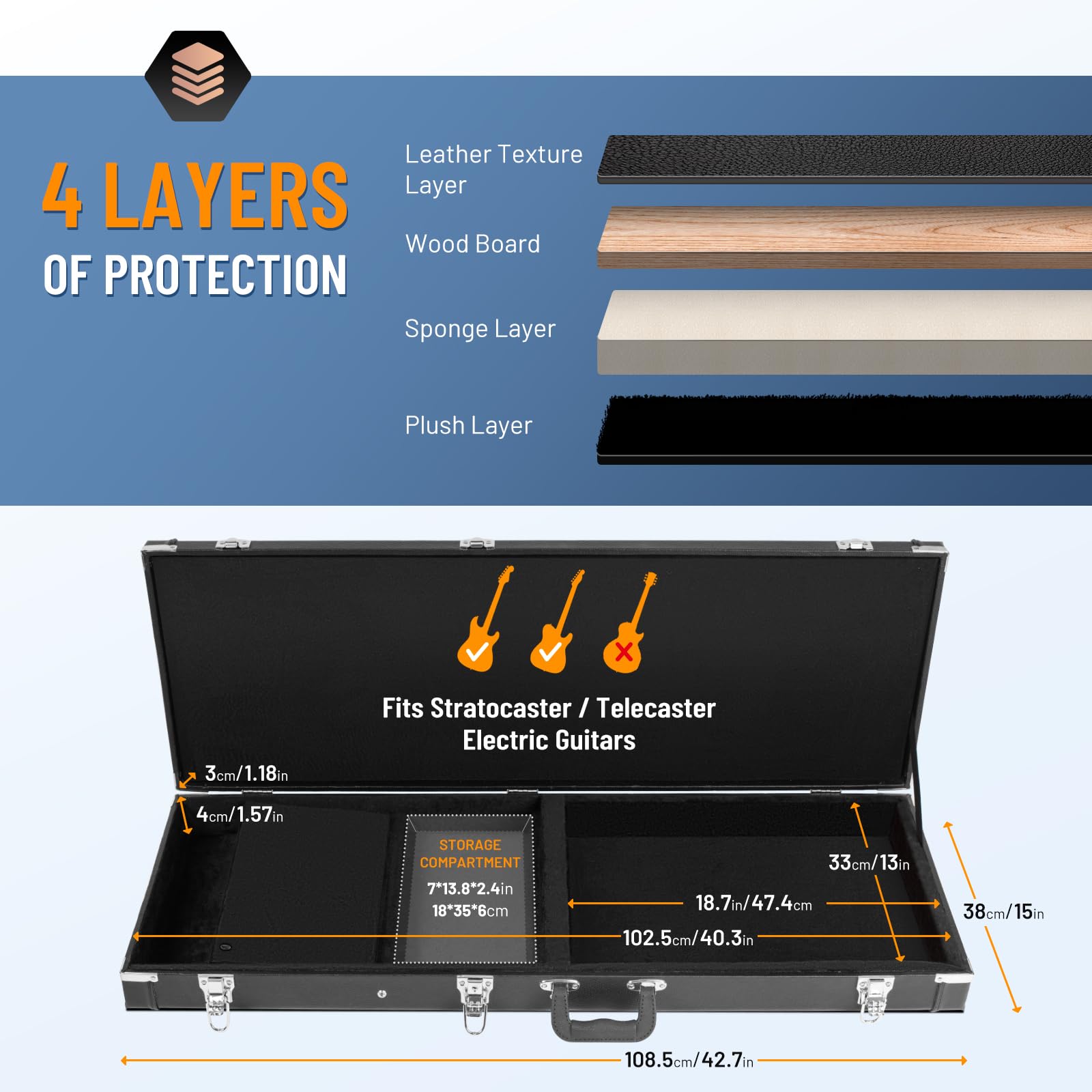 Hard Shell Electric Case: CAHAYA electric guitar case is crafted from 4 thickened layers. Waterproof PU leather exterior offers an elegant look and easy maintenance. No need to worry about getting your guitar wet when you go out. Thickened wood layer provides additional reliability. 1.06-in foam padding absorbs impact to protect your guitar when travelling. The plush lining ensures soft and comfort. Protect delicate strings and knobs, making it ideal for frequent travel.