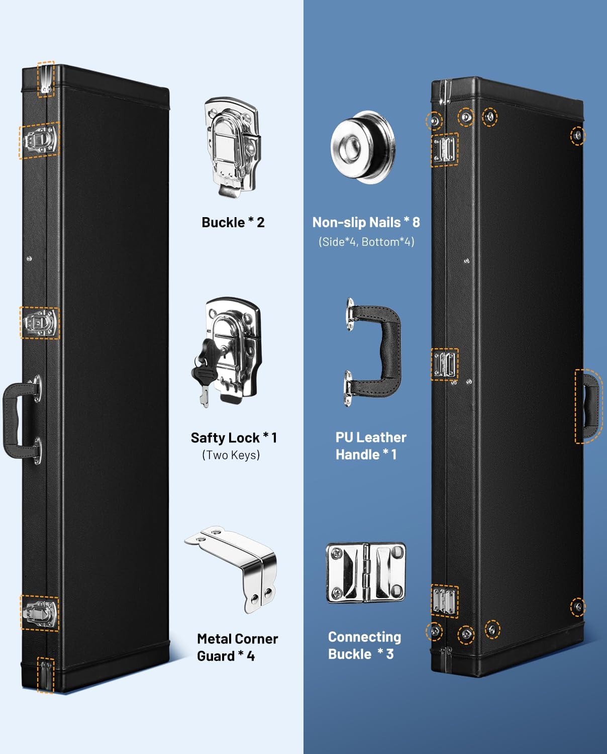 Secure Lock Design: CAHAYA hard guitar case is equipped with 3 metal latches, 8 anti-slip nails and 1 safety lock with 2 keys, offering additional safety and protection. You don't have to worry about losing your guitar. A strap to support the cover when opened, while the ergonomic handle ensures a comfortable, balanced grip.