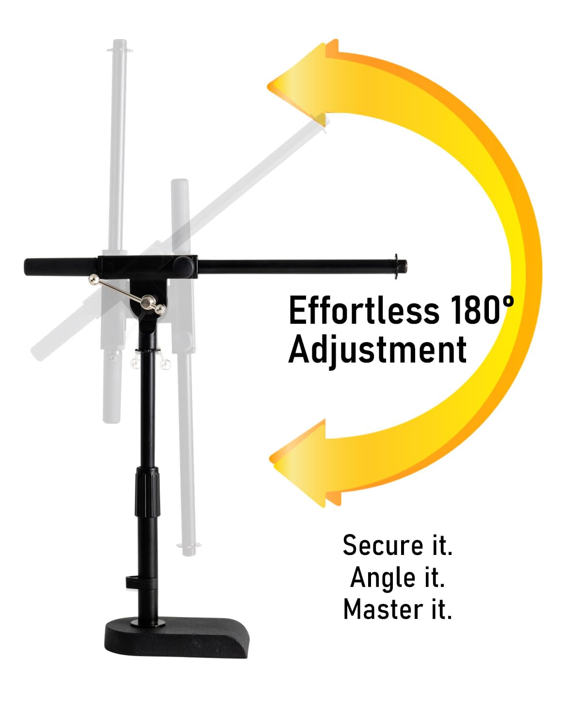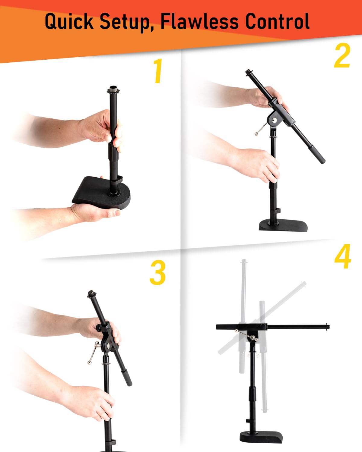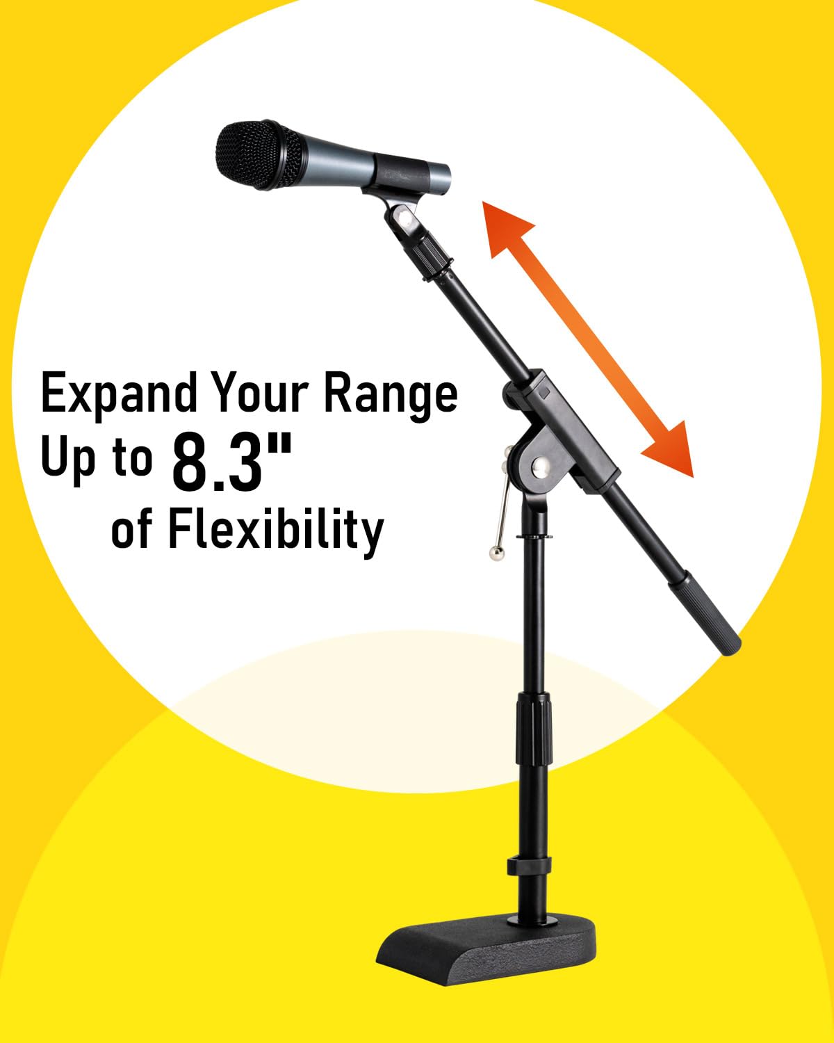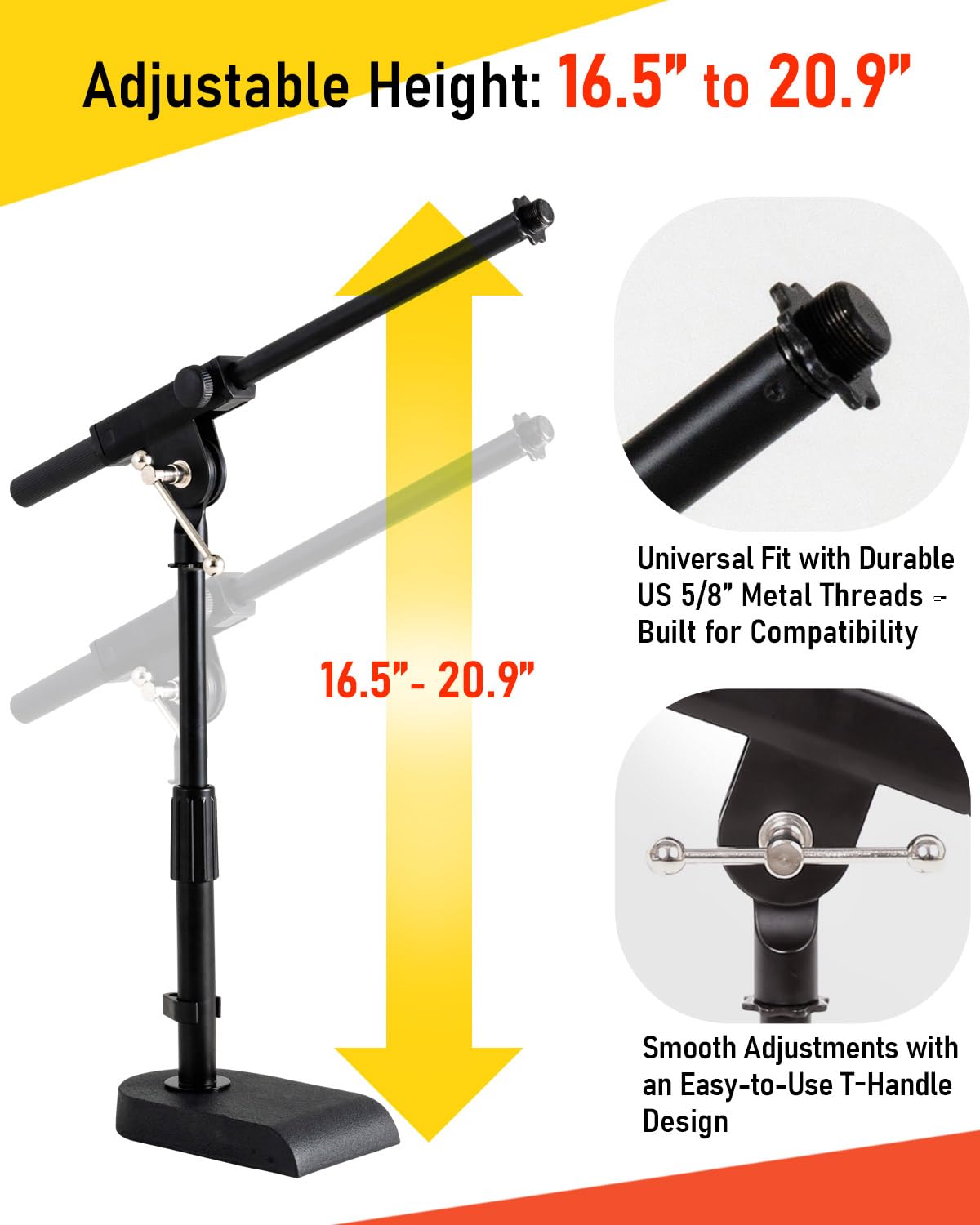 Adjustable Height - Stage Rocker tabletop boom mic stand is designed to raise or lower height for different purposes. T-handle adjustment mechanism allows you to adjust height from about 16.54 to 20.87 inch (from bottom leg to mic metal threads with a 45-degree angle). Comes with a reliable & quick releasing coated steel midpoint locking clutch. The ergonomic clutch design is for you to adjust and place it at the optimal height for maximum comfort while using.
