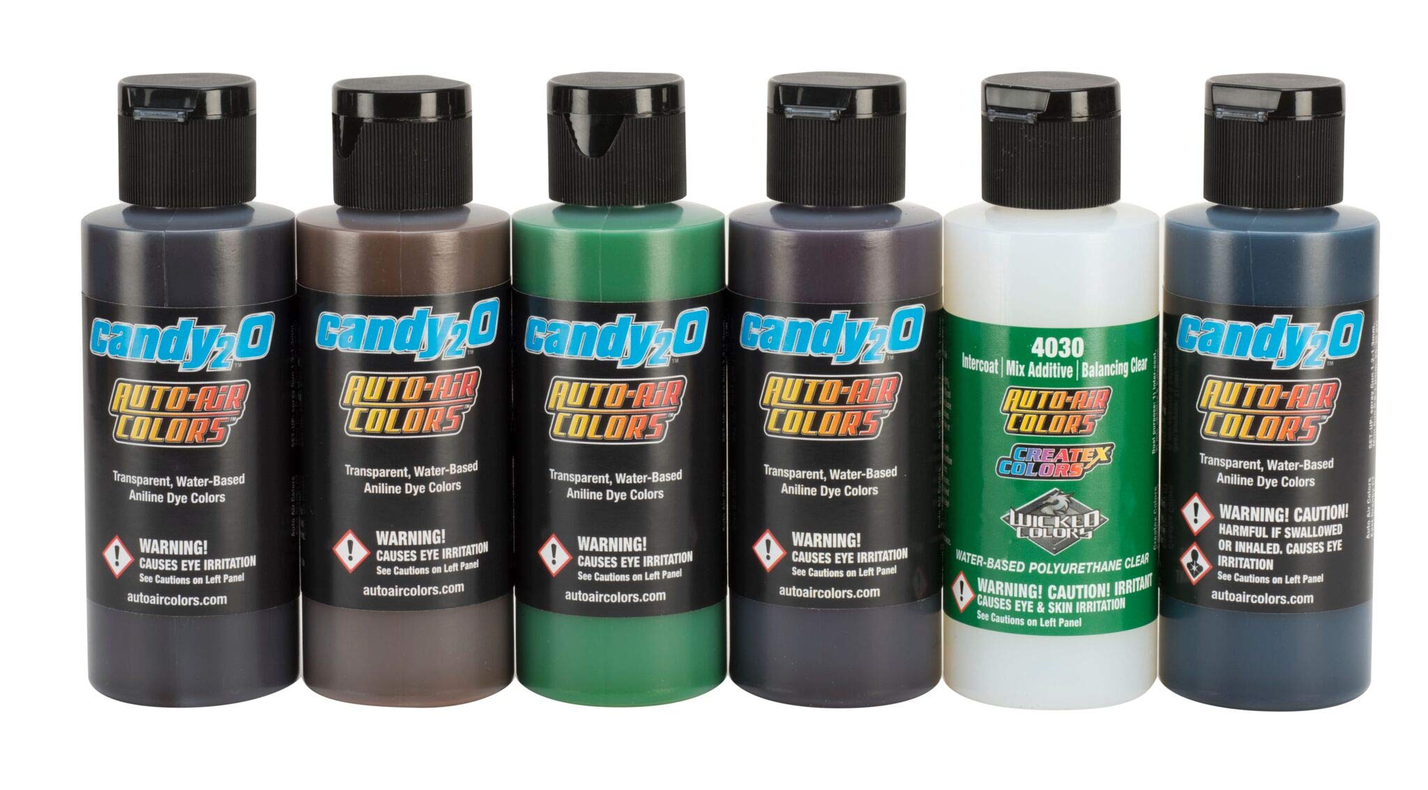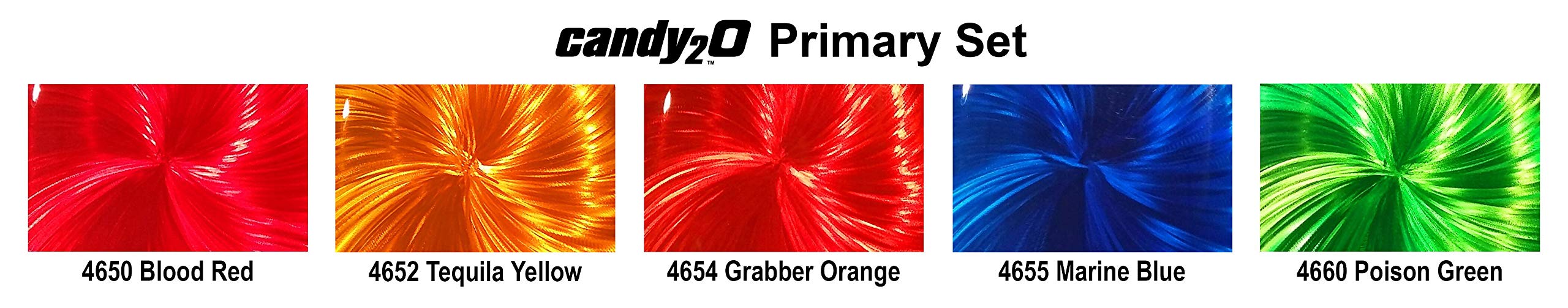 Auto-Air candy2o 2oz. Primary Set. Contains: candy2o - 2oz. of each: - 4650 Blood Red - 4652 Tequila Yellow - 4654 Grabber Orange - 4655 Marine Blue - 4660 Poison Green Additives - 2oz. each: - 4030 Balancing Clear