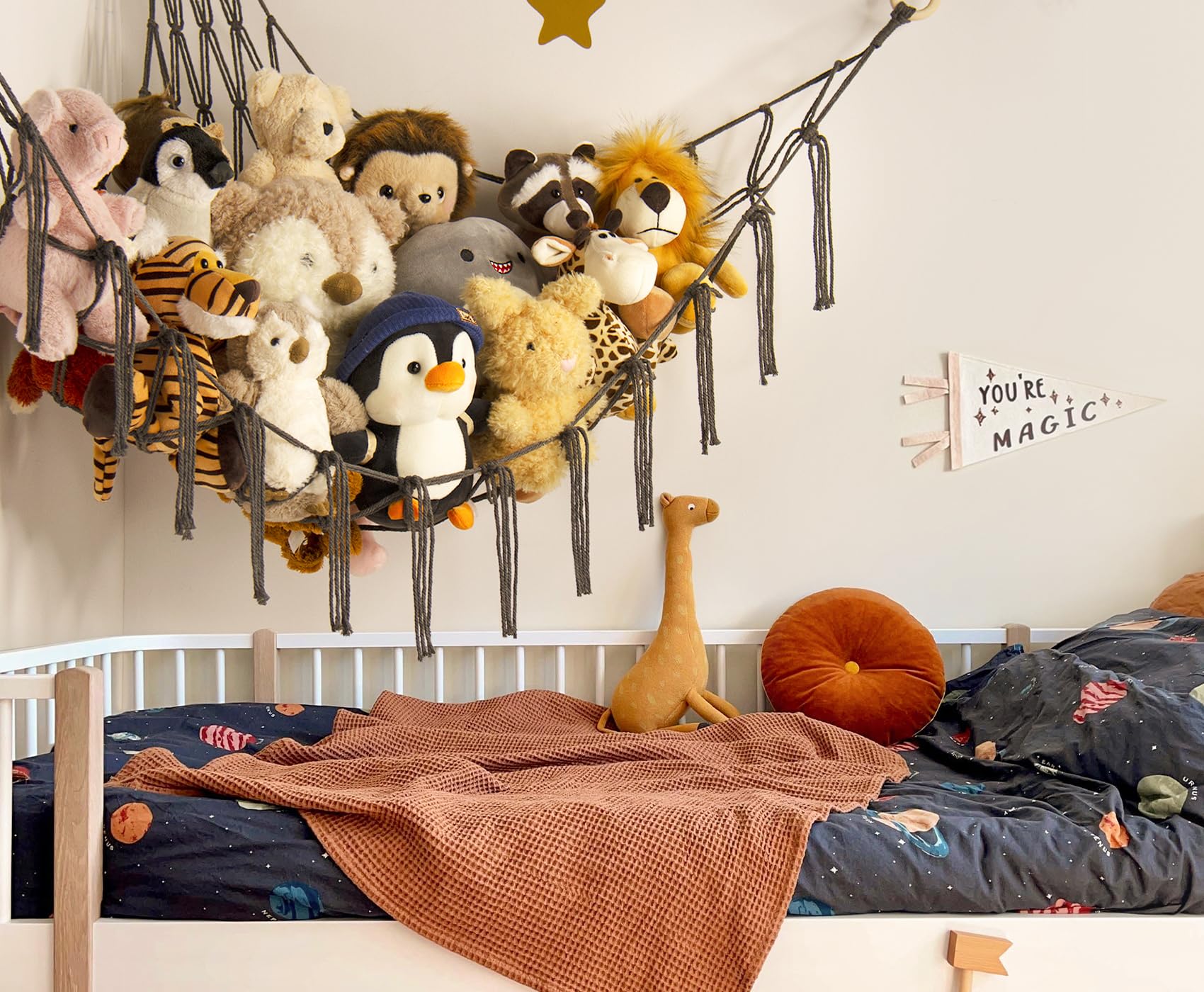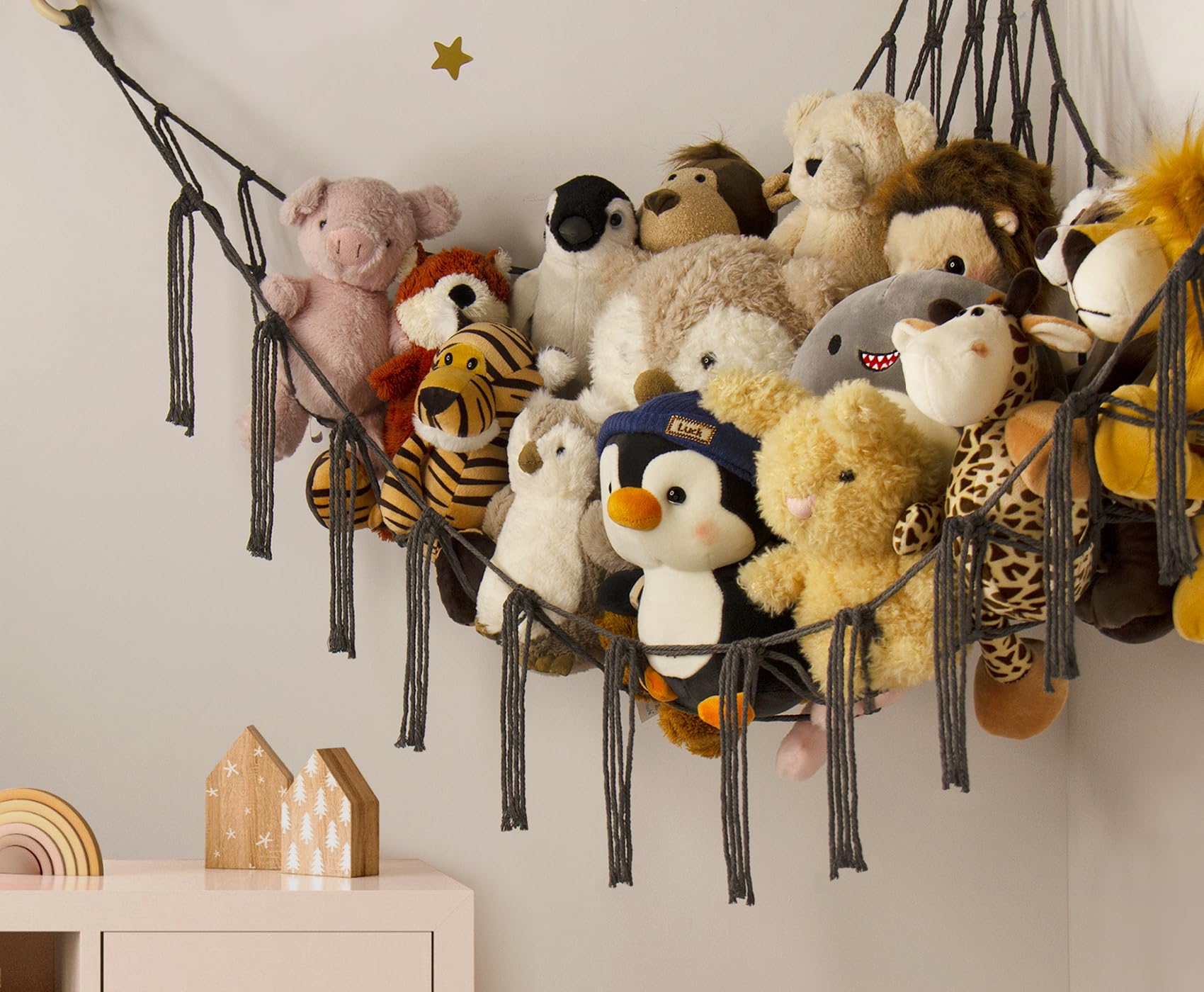 FSC-Certified & Easy To Install - The included wall mounting anchors and ring hooks(made of FSC-Certified wood) increase the sturdiness of the toy hammock to hold all the plushies well in place at any time. You can easily hang it up within 10 mins with the installation guide. No need to call a handyman!