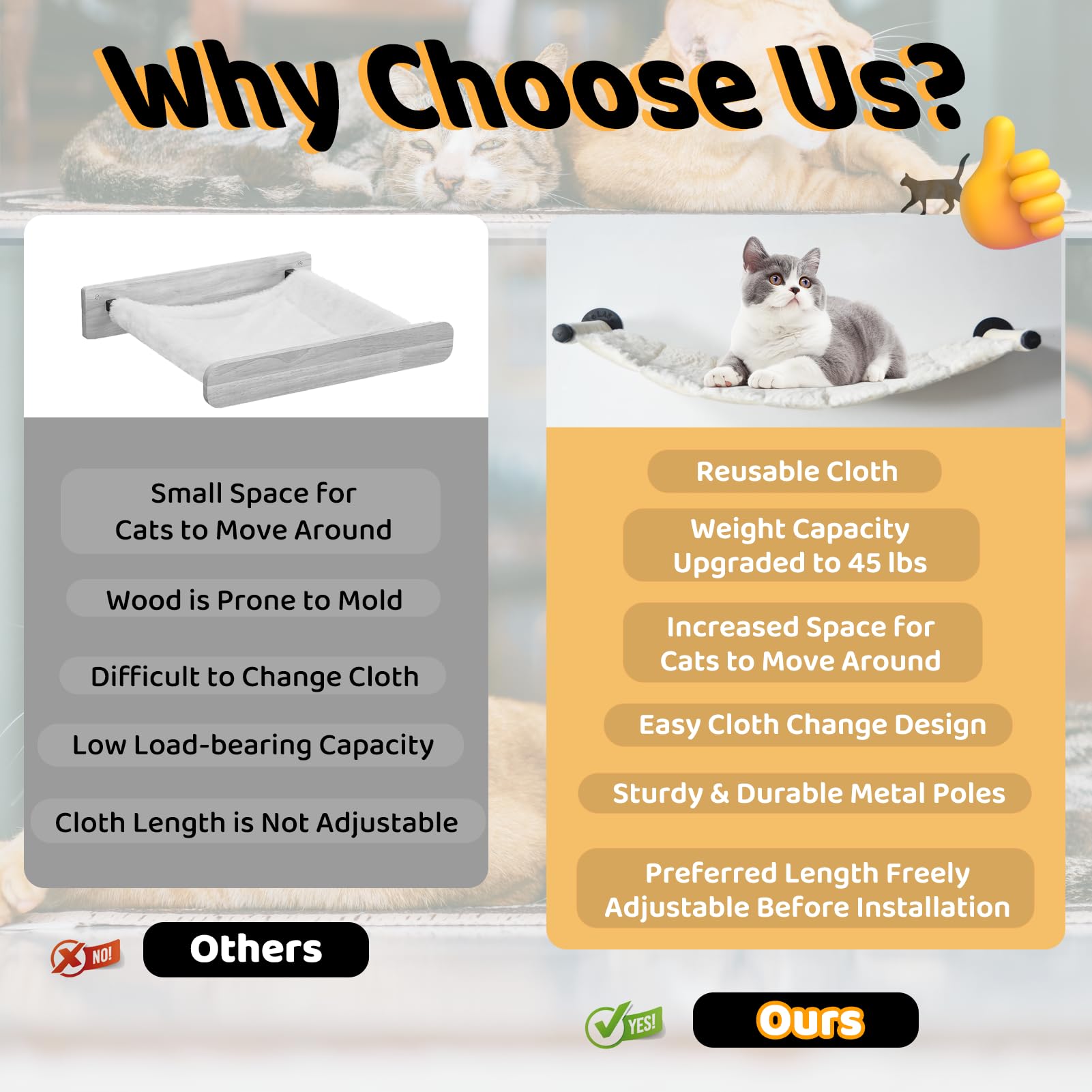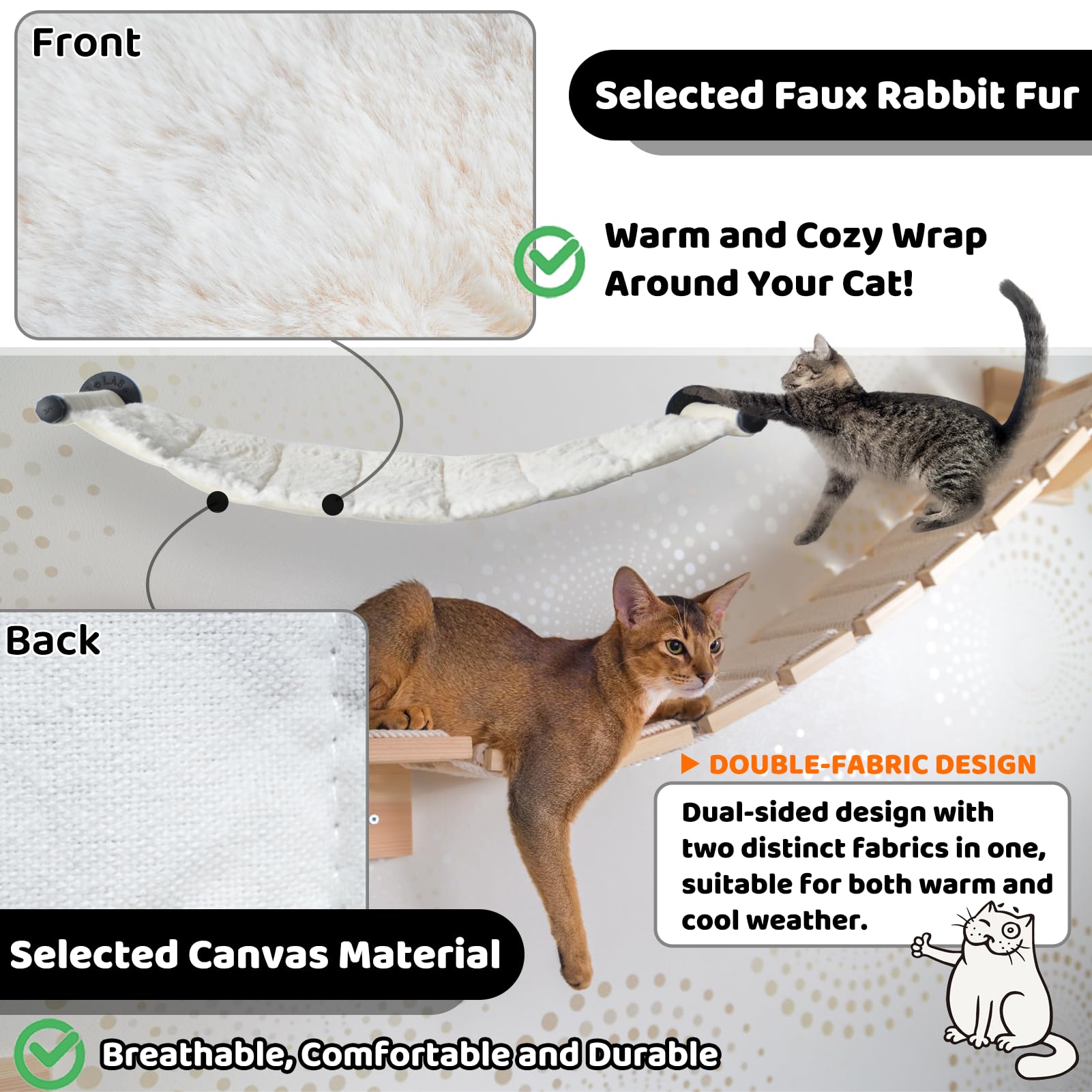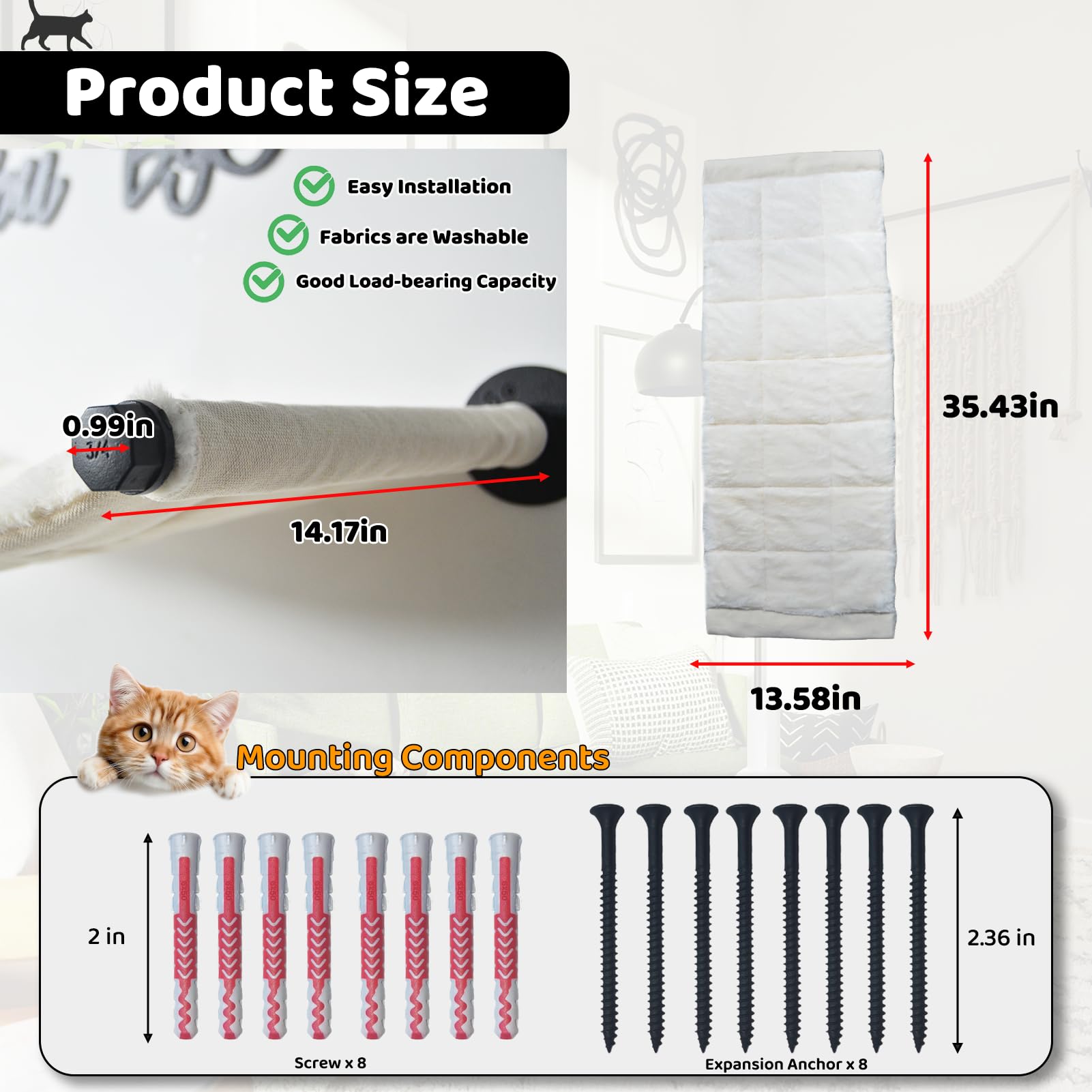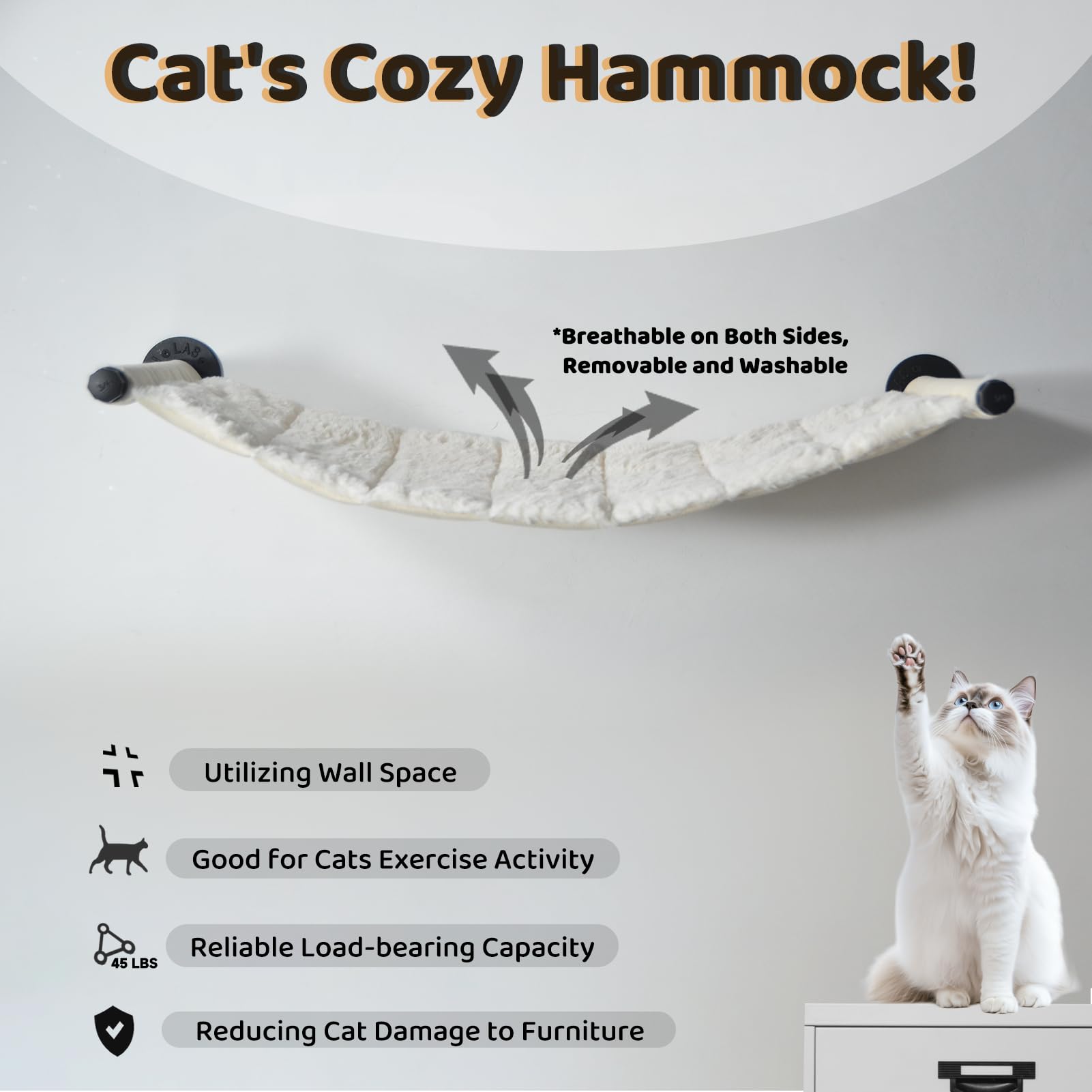 Solid and Sturdy Cat Climbing Shelves: Our solid cat wall frame is made with sturdy and durable metal brackets for added safety and stability of your cat bed. The cat hammock can hold up to 45 pounds, Cats can rest comfortably and safely in the hammock