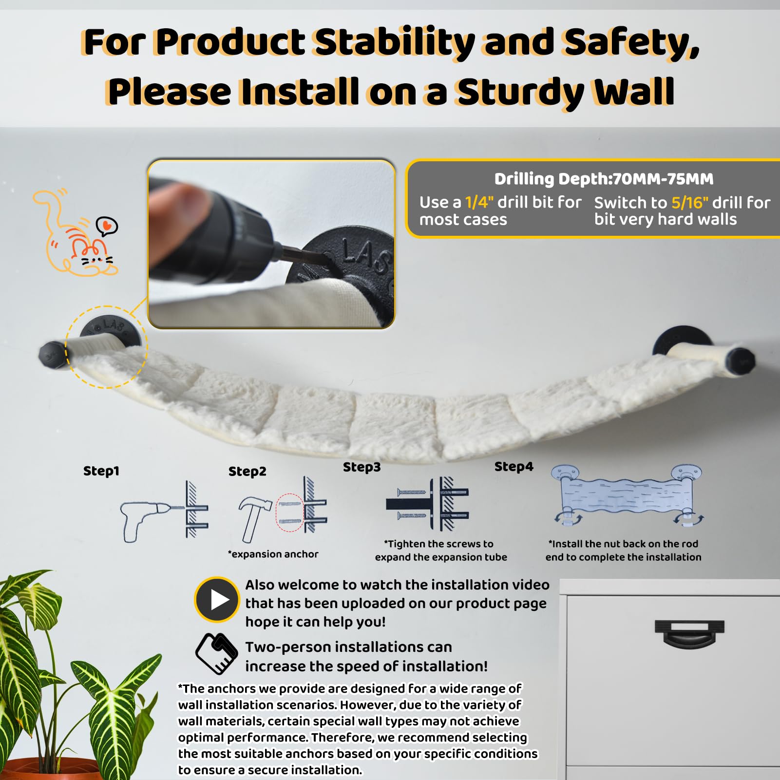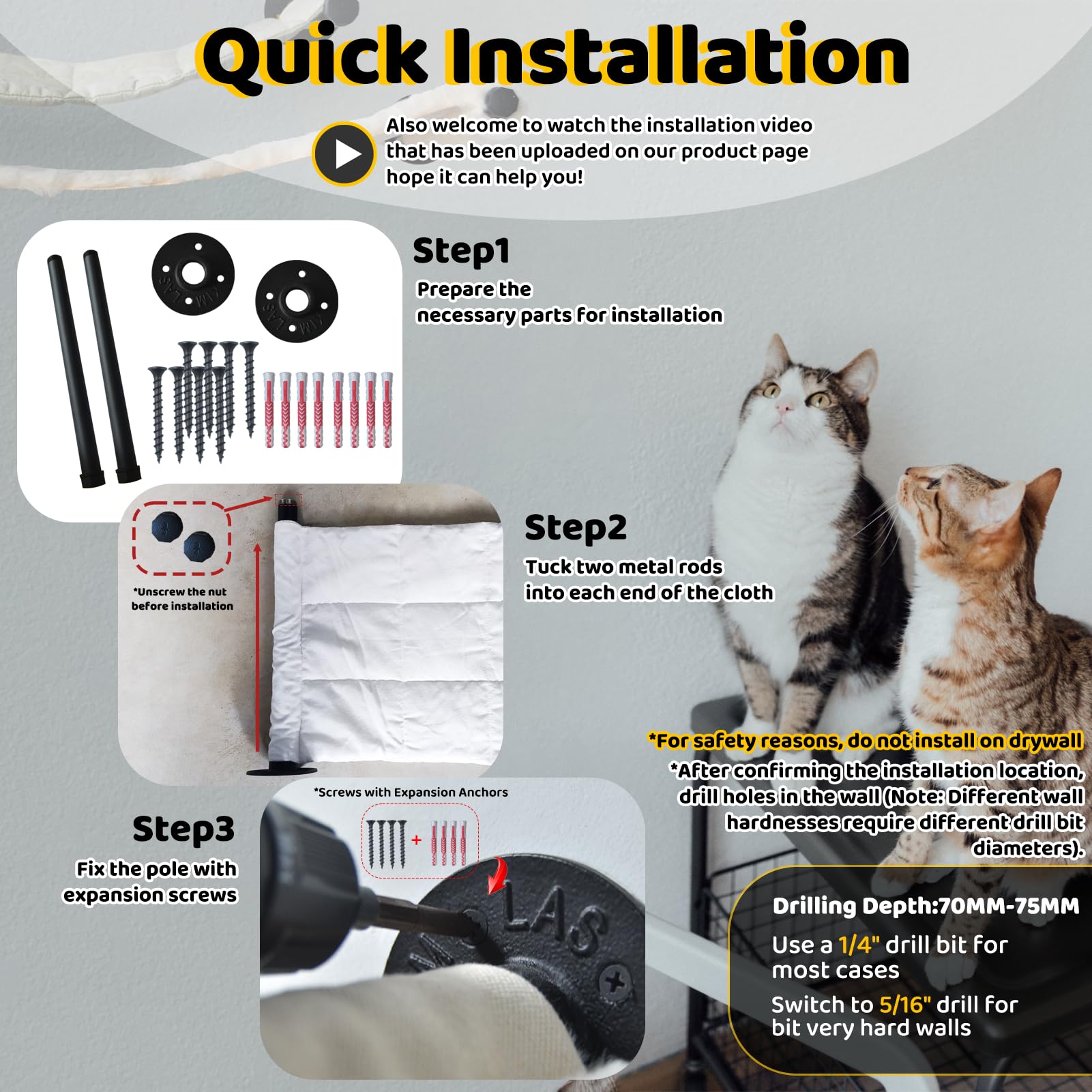Quick Installation: Only 8 screws are required to securely fasten the wall mounted cat rack. The expansion anchors are designed for solid concrete walls only. If installing on non-load-bearing decorative walls, you will need to provide appropriate mounting hardware yourself
