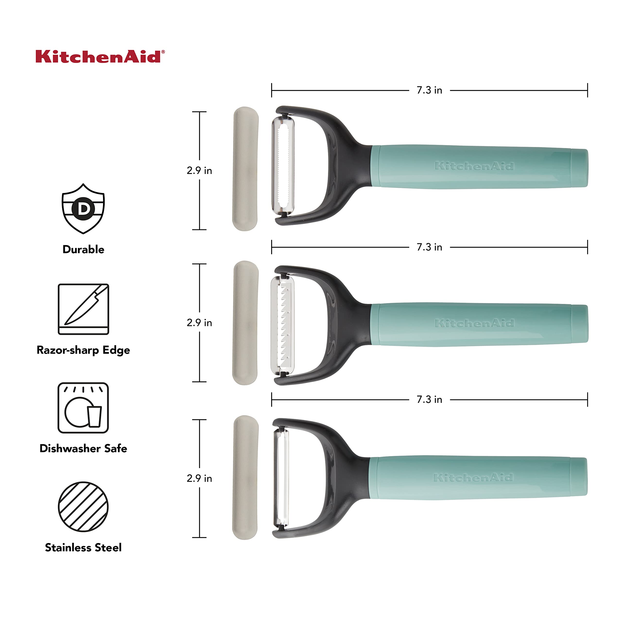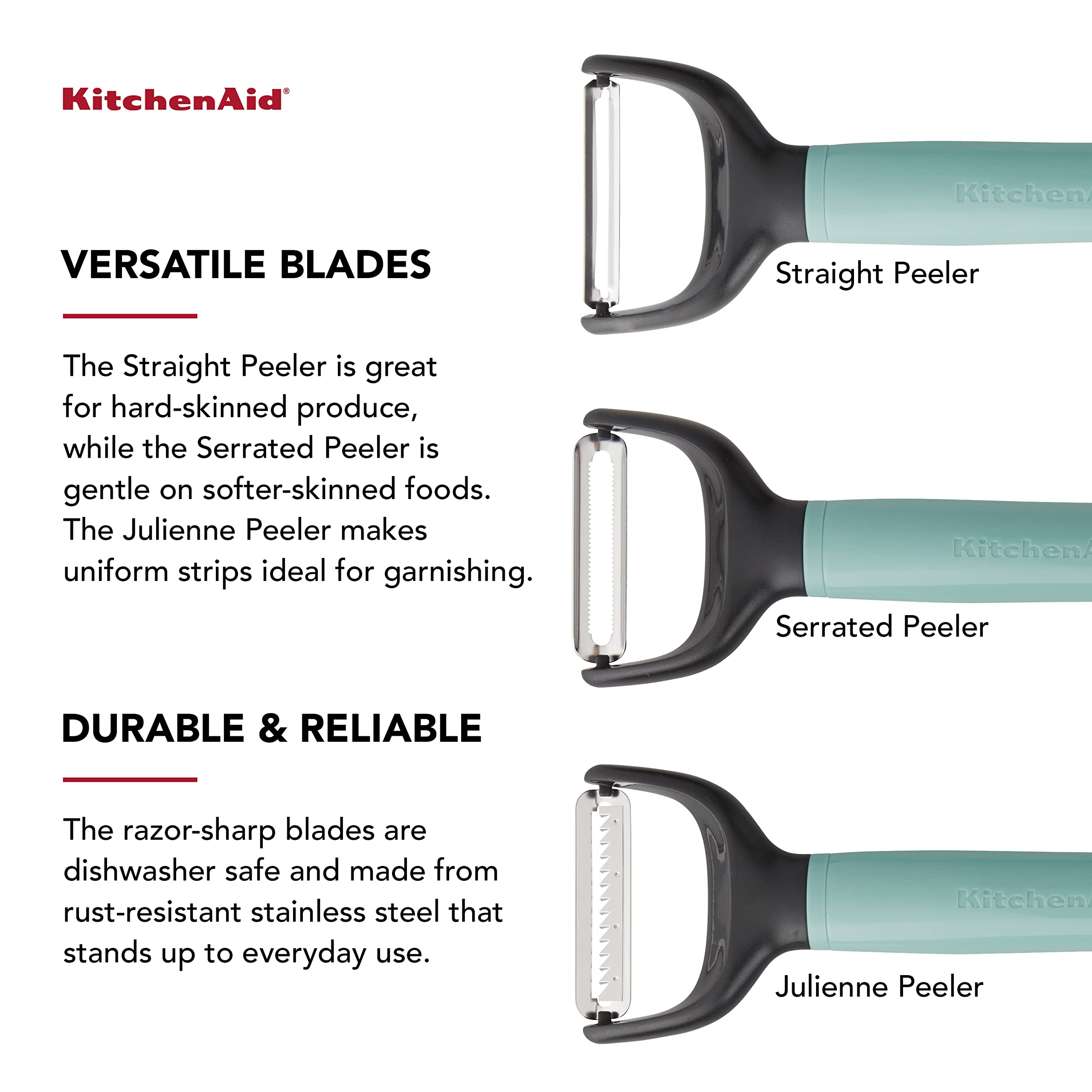 This KitchenAid 3-Piece Peeler Set is essential for every kitchen. The set features three blade types: straight blade, serrated blade, and julienne blade. These peelers are perfect for peeling all fruits and vegetables. Each comes with a protective blade cover for safe storage. Dishwasher safe. Lifetime Limited Warranty.