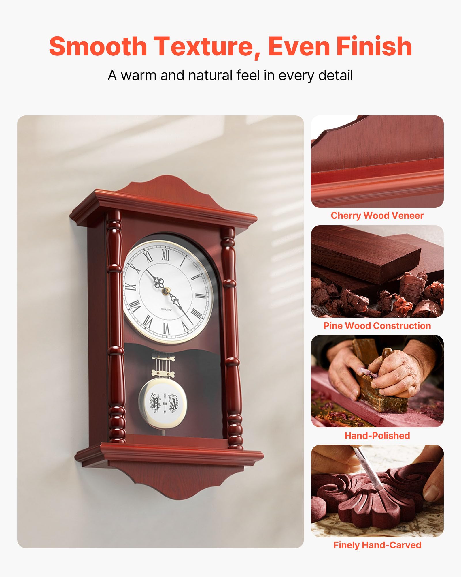 Premium Material: Our grandfather wall clock is made of pine wood with a cherry tone finish, is finely textured, is durable, and is long-lasting. Every detail is intricately handcrafted and carved, with a smooth, even surface that adds elegance and character to your home decor