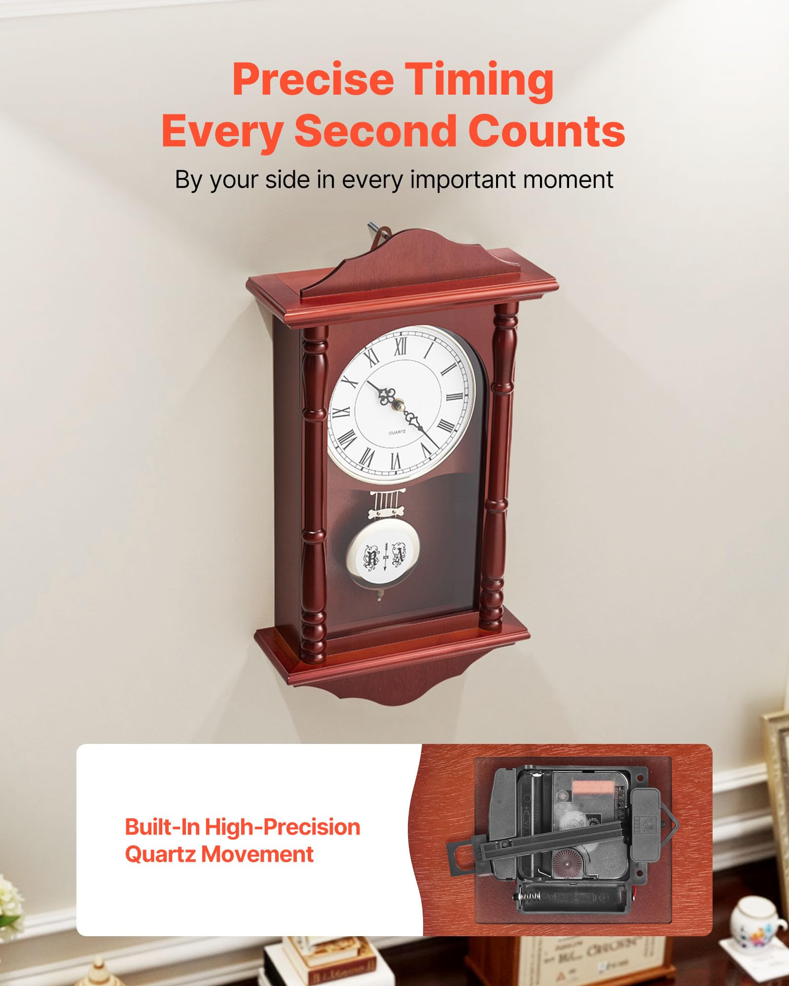 Precise Timekeeping: The wall clock with pendulum features a high-precision quartz movement, ensuring every second is accurately measured. It will accompany you through each important moment, whether for everyday use or special occasions
