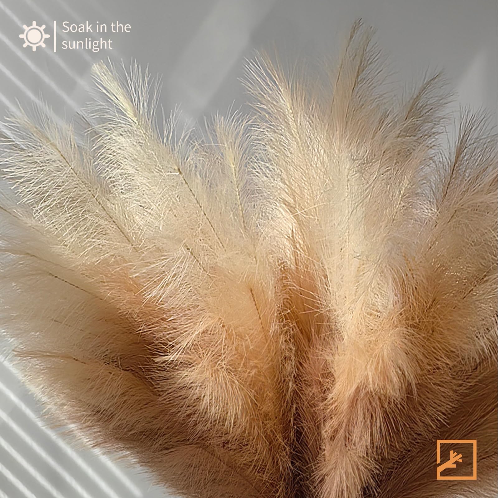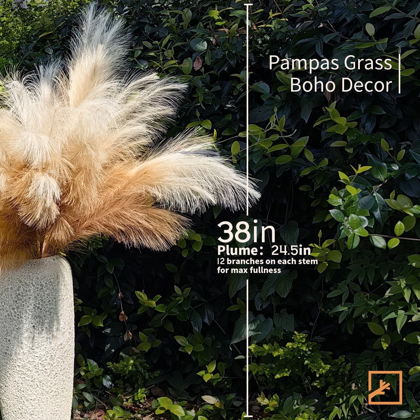 [Fluffy and Durable]: Each stem is full and elegant. The light and feathery plumes gives you the beauty of lush pampas. Simply fluff it up and put it in a vase to add some charm to your home decor. The pampas grass decor requires no maintenance or watering.