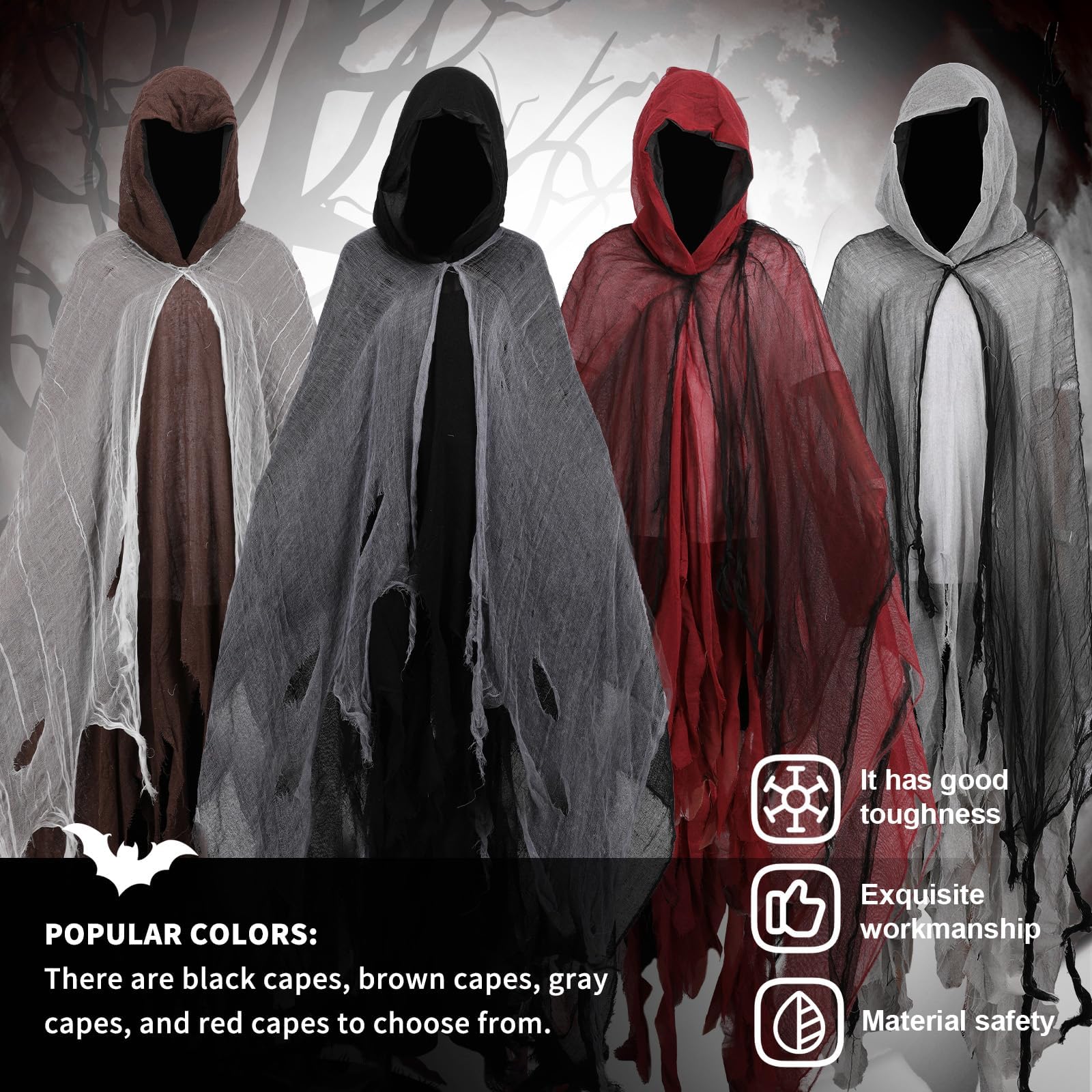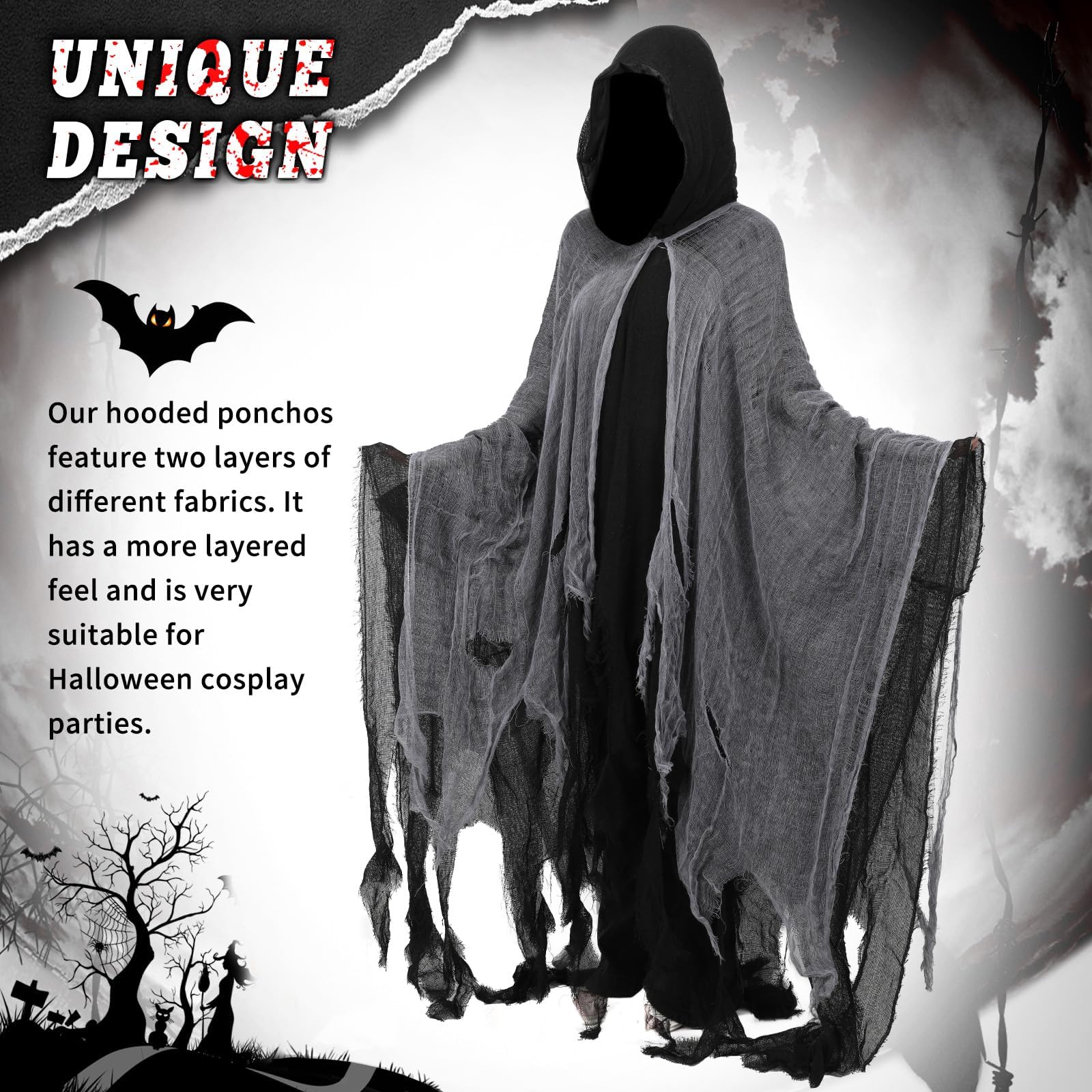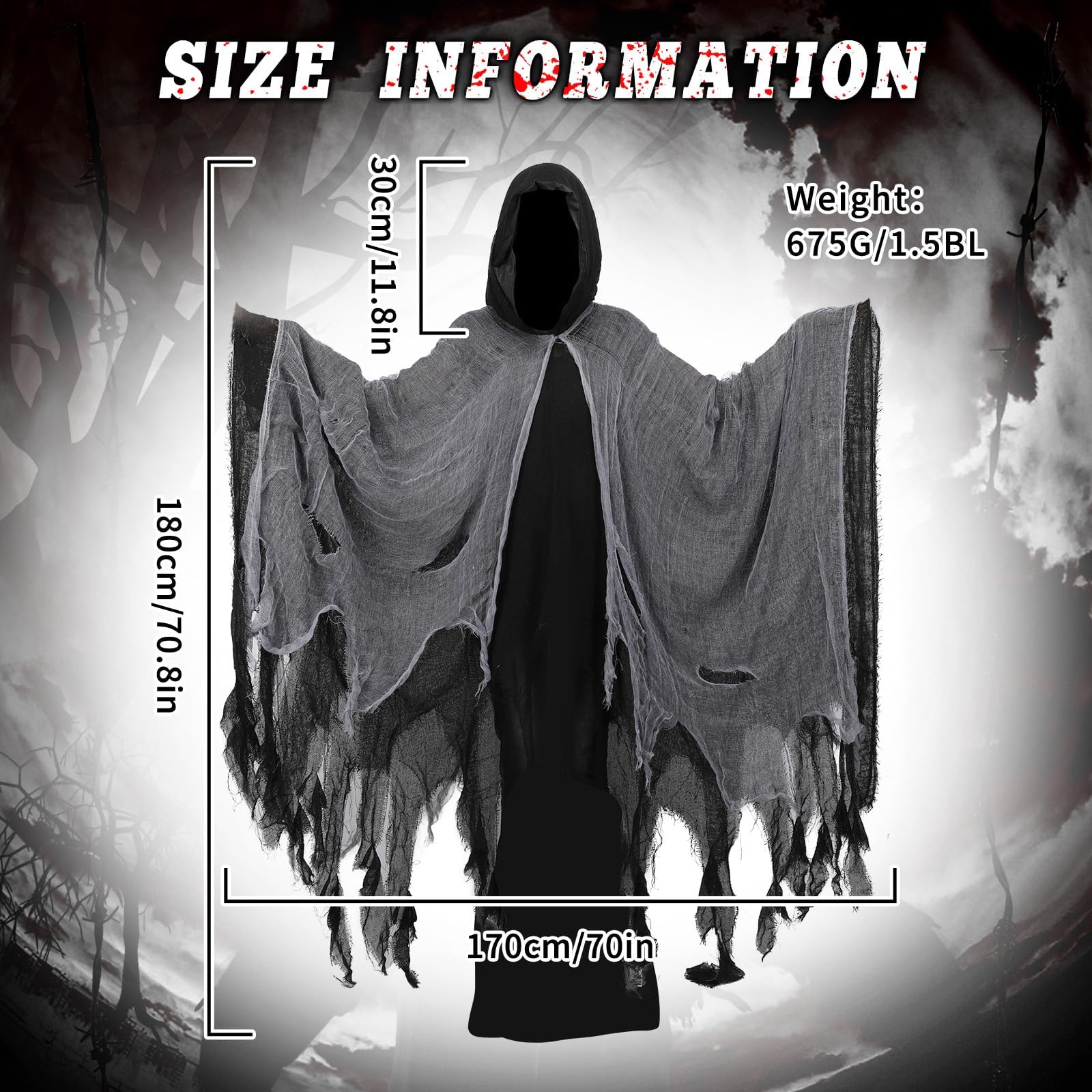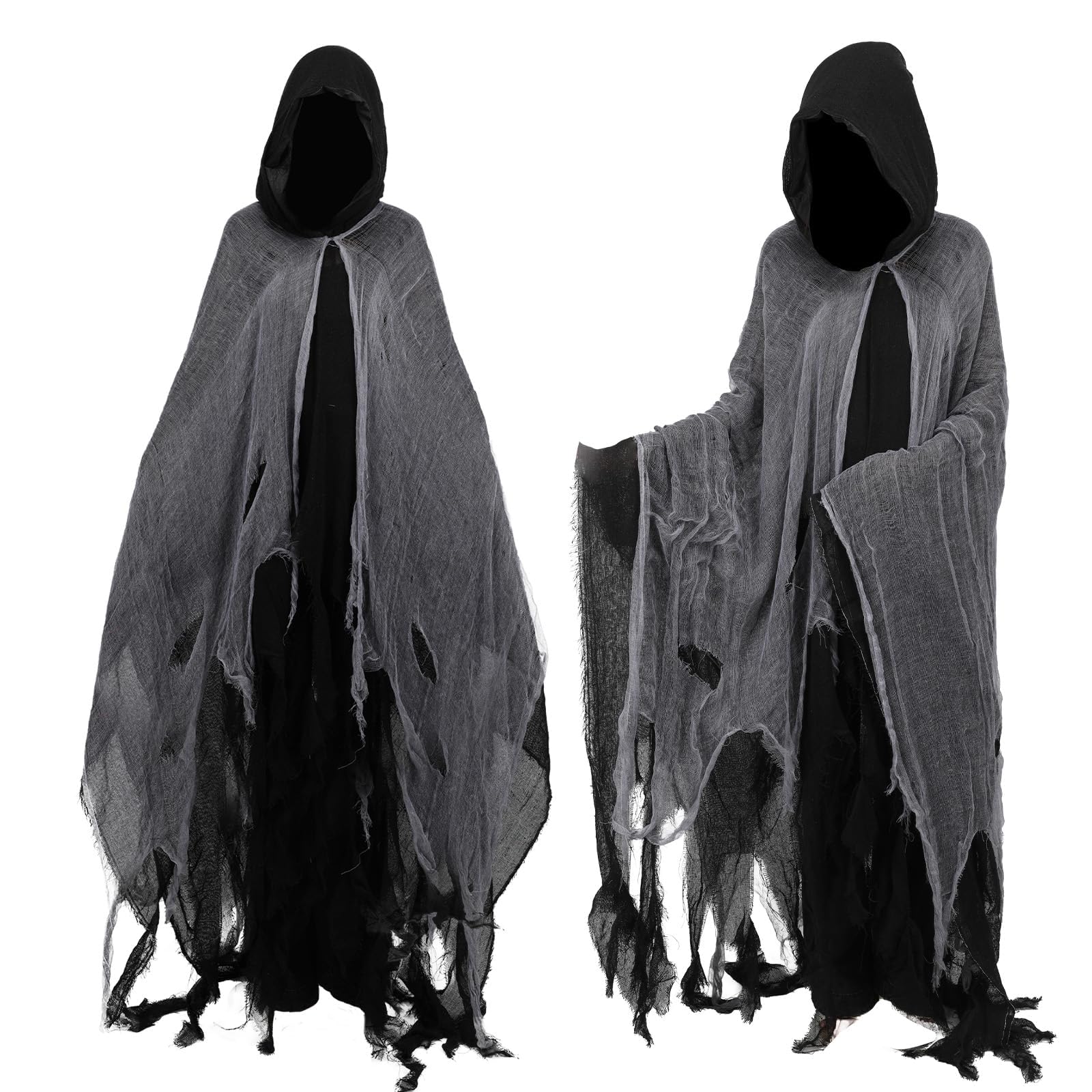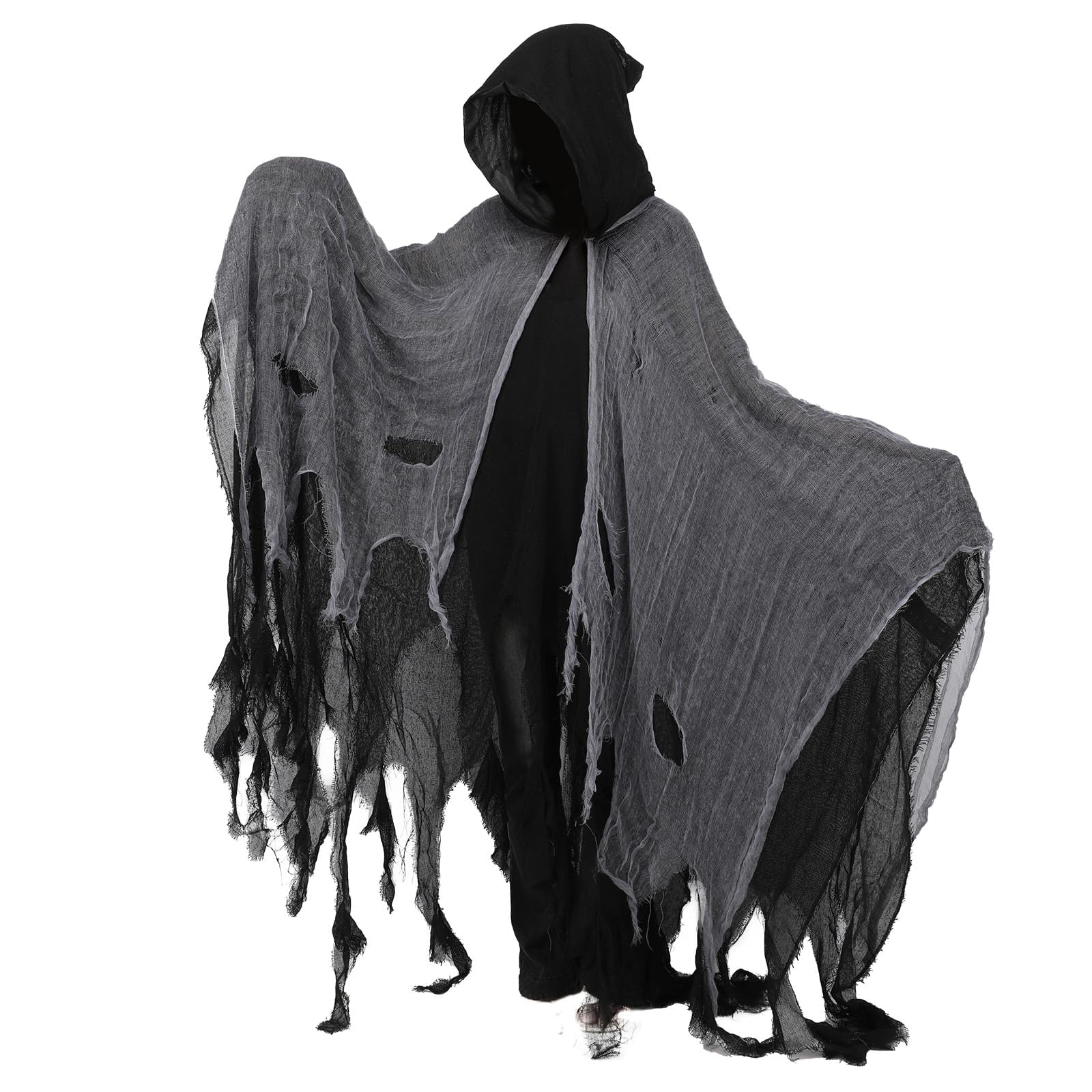 Design:This costume features a hooded design, mesh outer layer, and fragmented hem, creating a sense of horror, making it an excellent choice for Halloween costumes