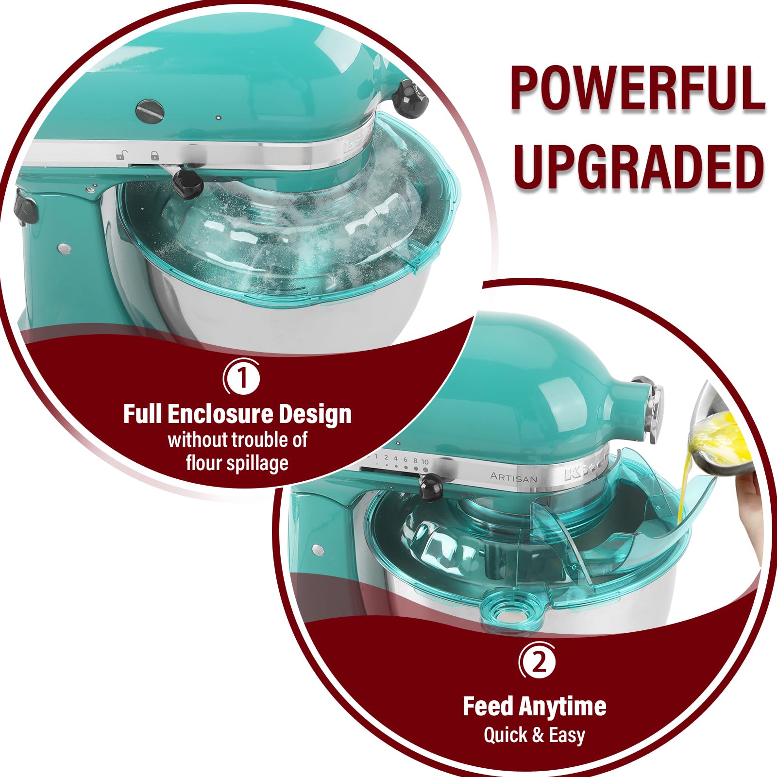 【Upgraded Design】The full wrap-around pouring shield and standard splatter shield chute dust cover perfectly retains the ingredients in the center for kitchenaid mixer bowl, and the mixing will be more efficient and thorough, effectively preventing splashes and spills when mixing lightweight ingredients such as flour. Upgraded dump hood with quick lock ,quickty installs ,removes reduce mess and save your time.