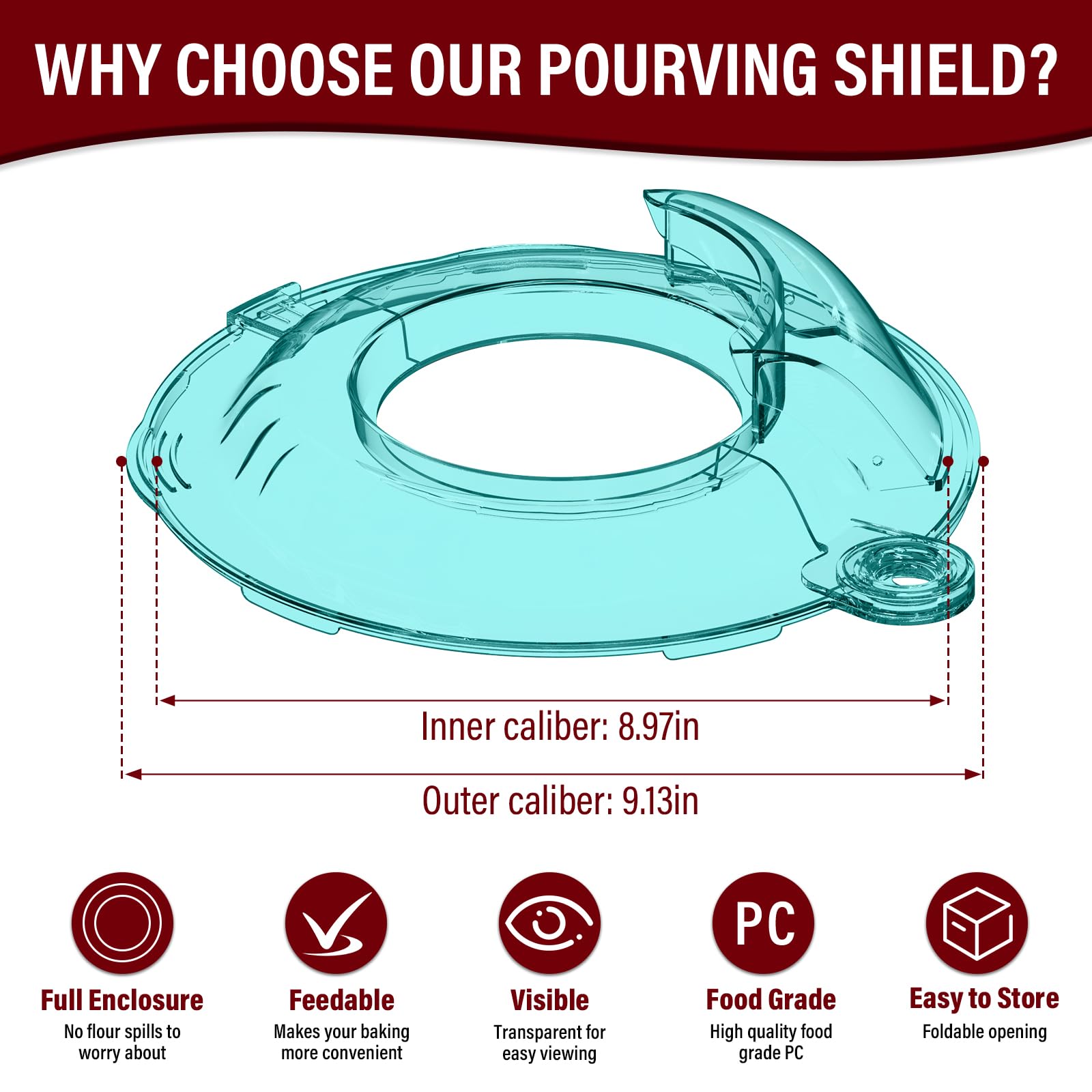 【Large angled pour chute】- Our kitchen aid accessories and attachments - pouring shield for kitchen aid 4.5-5 quart features a large angled ingredient slide, helping you easily add ingredients to the kitchen aid stainless steel mixing bowl without wasting your raw materials.