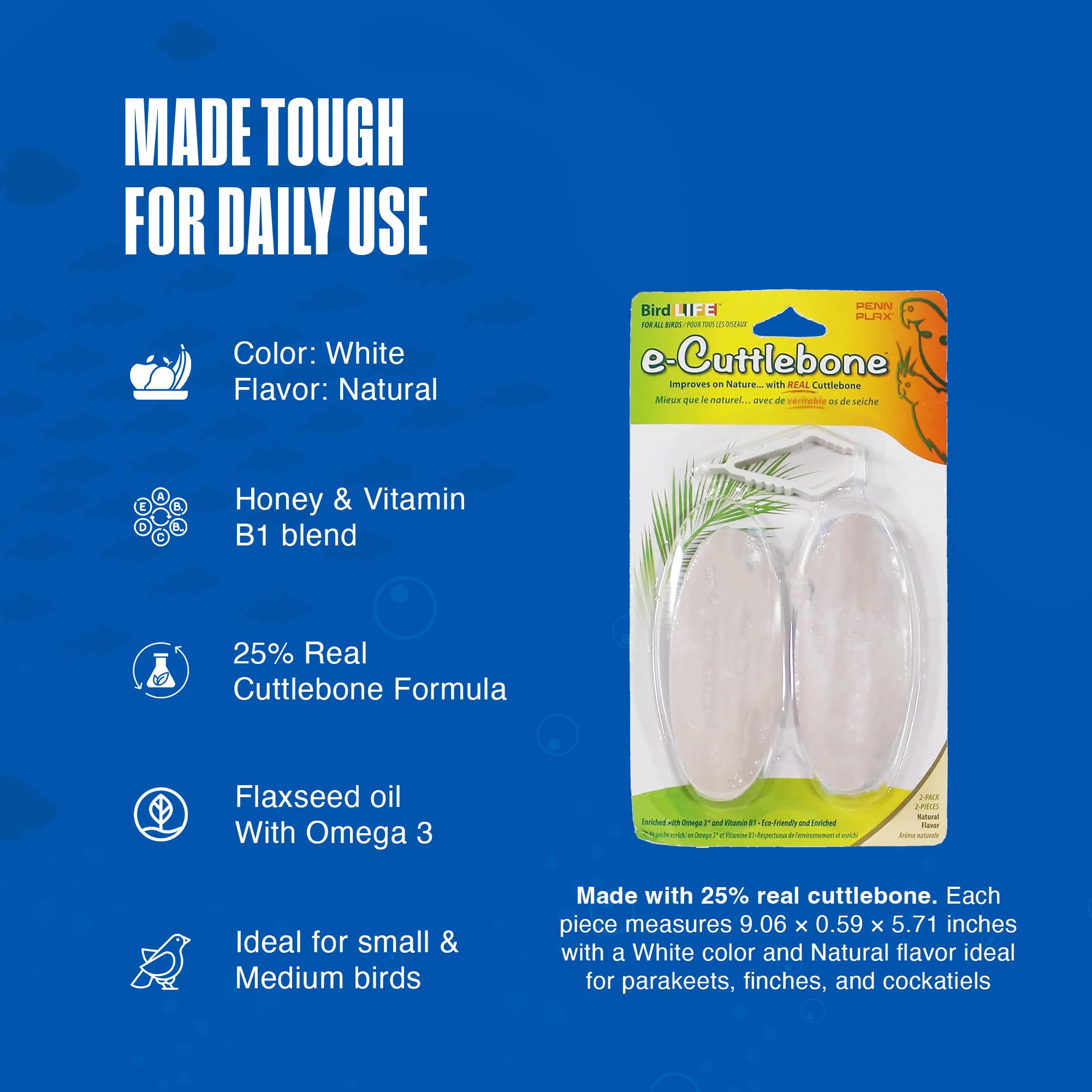 Bird Life presents the Natural E Cuttlebones by PENN-PLAX. Change things up for your pet with our 2-Pack of Natural E Cuttlebones ! Along with providing additional vitamins and minerals, our Natural E Cuttlebones allow for a subtle and stimulating change in your pet’s daily life. Enriched with Vitamins & Minerals: Our Natural E Cuttlebones are enriched with Omega 3 Fatty Acids, Honey, and Vitamin B1. All of these nutrients are necessary for maintaining healthy bones and plumage (feathers), as well as avian energy needs and egg production. Durable & Less Brittle: These cuttlebones are made to be less brittle compared to the competition, and are free from artificial ingredients or colorings. Furthermore, to help prevent Cuttlefish population from becoming decimated, this product is made with 40% cuttlebone. Clip Included: To make for simple and easy mounting, our Natural E Cuttlebones include a clip for hanging on a wire cage. Ingredients: Calcium Carbonate Cuttlefish Bone Powder Flaxseed Oil (Source of Omega 3 Fatty Acids) Thiamine Hydrochloride (B1) Natural Flavor Shop PENN-PLAX for All Your Pet’s Needs: PENN-PLAX is a manufacturer and distributor of top quality pet supplies, who specialize in creating excellent pet products for animals, both great and small.