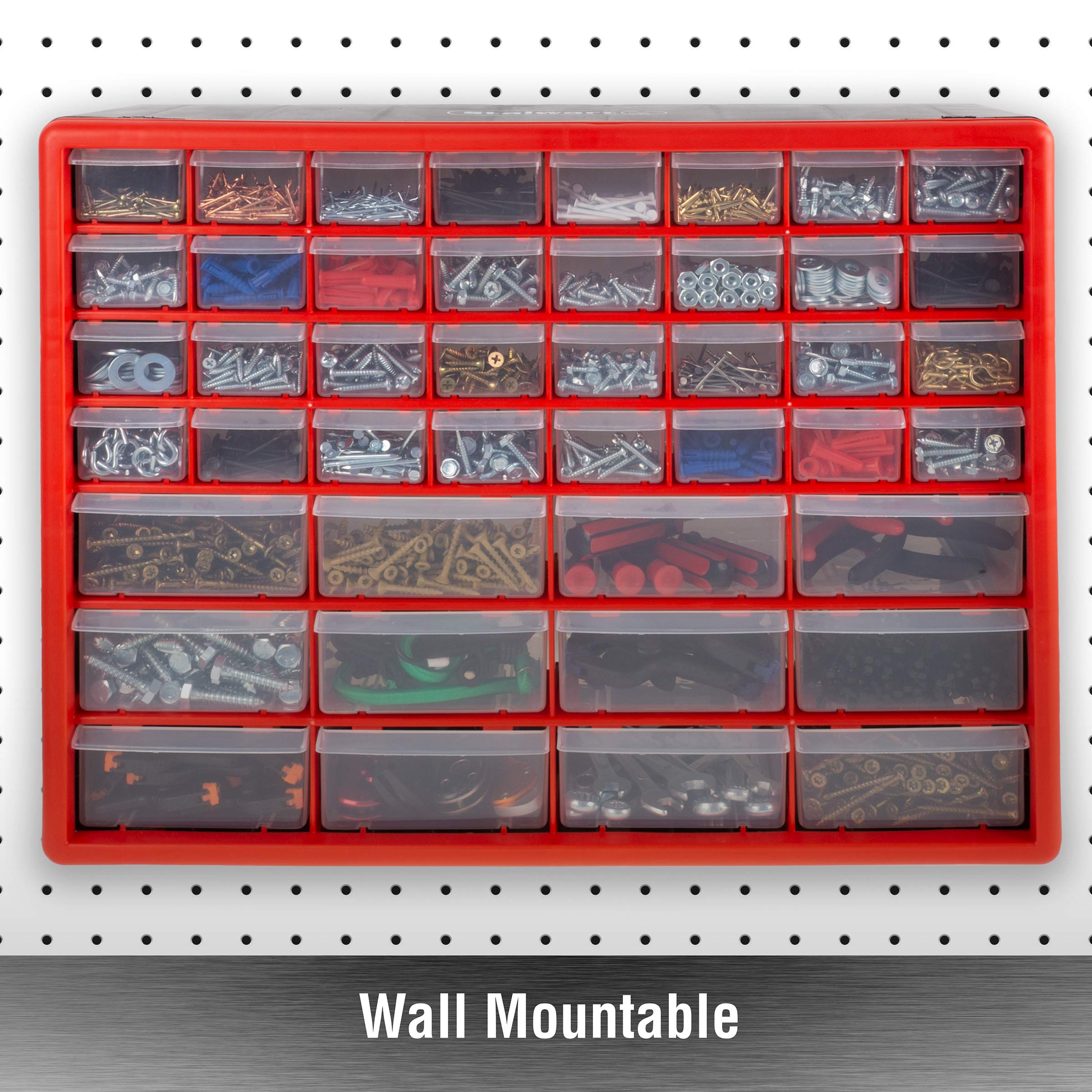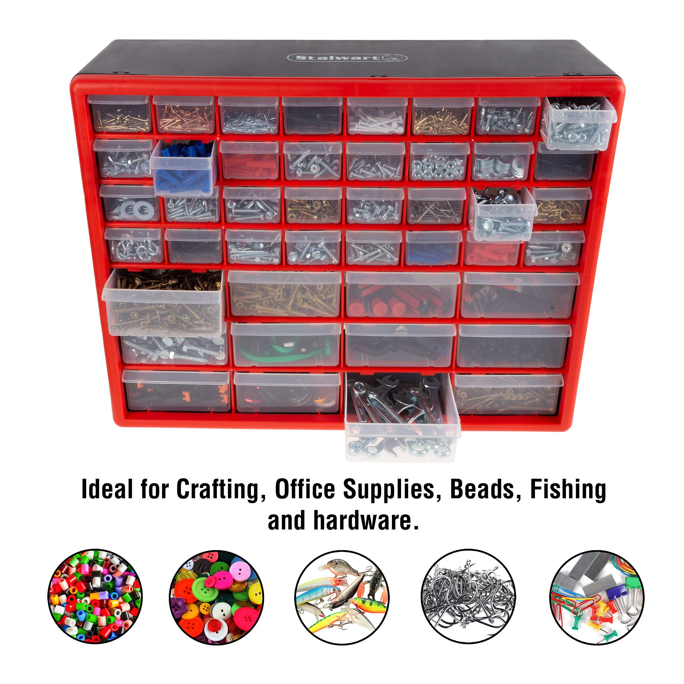 The 44 Drawer Storage Cabinet by Stalwart is an excellent organizational solution for your garage, home, or office. Constructed from strong and durable polypropylene, these see-through storage drawers are made to last. The container is portable and can be used on tables, countertops or desks, and is also wall mountable. With 12 large and 32 small compartments, you can easily store and organize anything from parts, hardware, office supplies, fishing tackle, crafting materials, beads, makeup, jewelry and more! It's the perfect option to keep your gear or accessories neatly sorted and tidy. SATISFACTION GUARANTEED- Stalwart is committed to providing the consumer with the absolute best price and value on all of our products, which we ensure by applying a rigorous quality control process. NOTE: This is an exclusive product of Stalwart and ONLY 44 Drawer Storage Cabinets by Stalwart are GUARANTEED to be genuine. IMPORTANT: Avoid buying counterfeit products and transacting with unauthorized sellers. Look for our logo on the packaging for every one of our products.Stalwart is a registered trademark protected by U.S. Trademark law and will be vigorously defended.