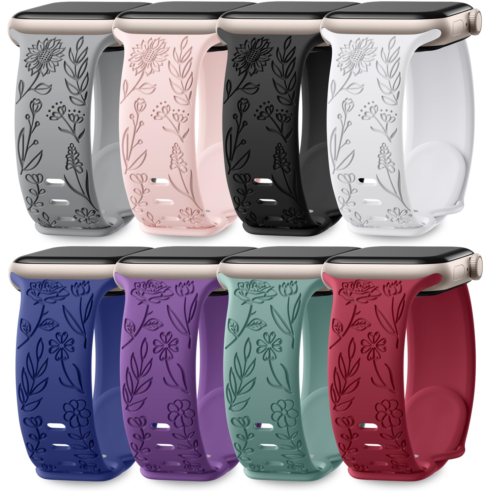✅ Floral Elegance for Your Apple Watch: Elevate your Apple watch style with our 8 pack floral engraved iWatch bands. Featuring intricate rose and cheerful sunflowers, they combine expert craftsmanship with trendy colors. Perfect for formal elegance and a touch of modern flair for casual wear