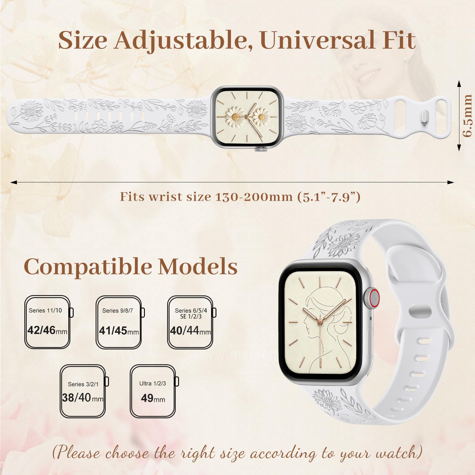 ✅ Soft & Smooth Silicone Comfort: Our floral bands are crafted from high-quality silicone, offering skin-friendly and exceptionally comfortable wear during workdays, workouts, and overnight sleep. These waterproof, lightweight, and durable straps provide an affordable yet premium accessory option for your Apple watch