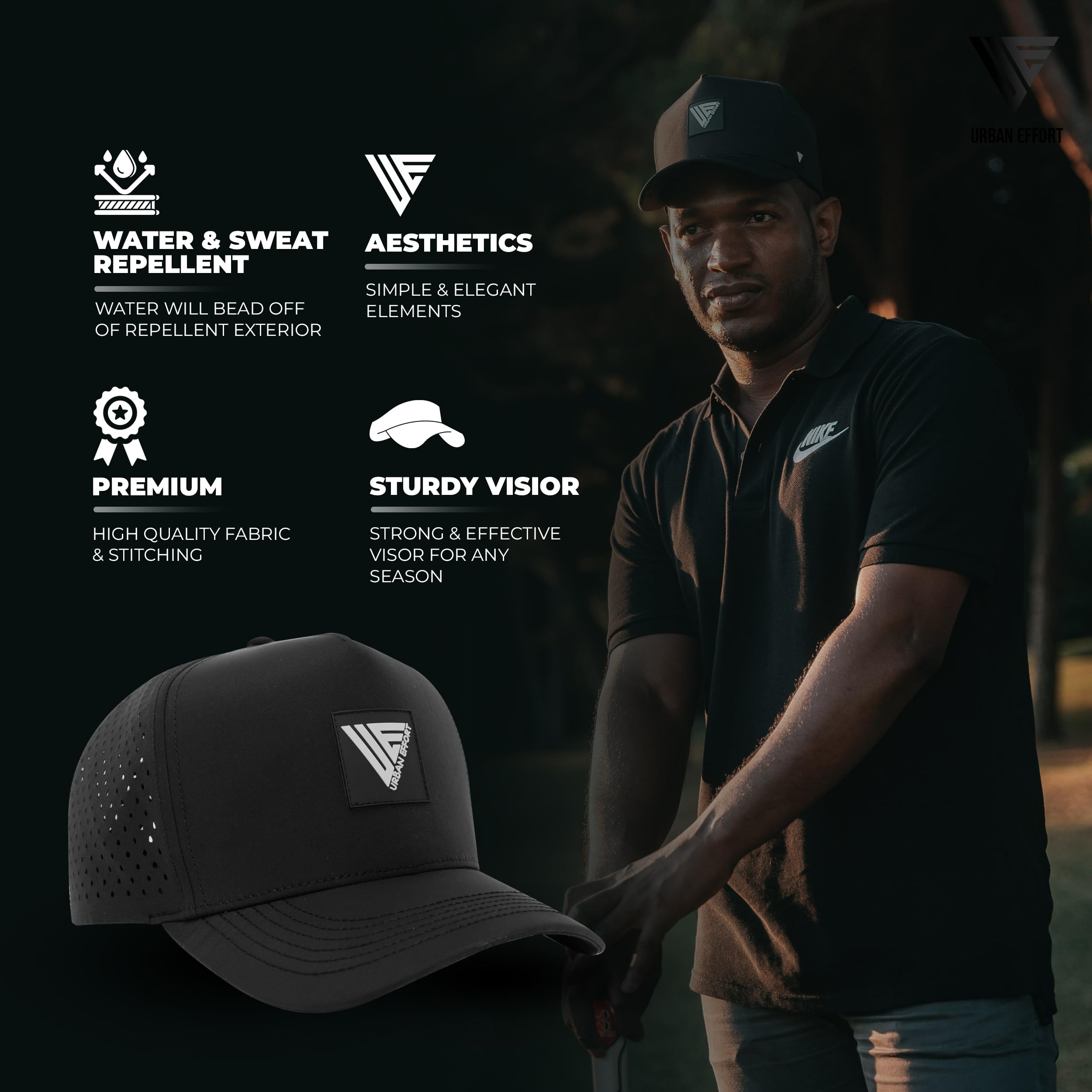 Urban Effort Hydro Performance Hat-Water-Resistant Baseball Cap-Men and Women-Great Snapback for Golf, Adventure,Lake,Workout (Black, Curved Bill)