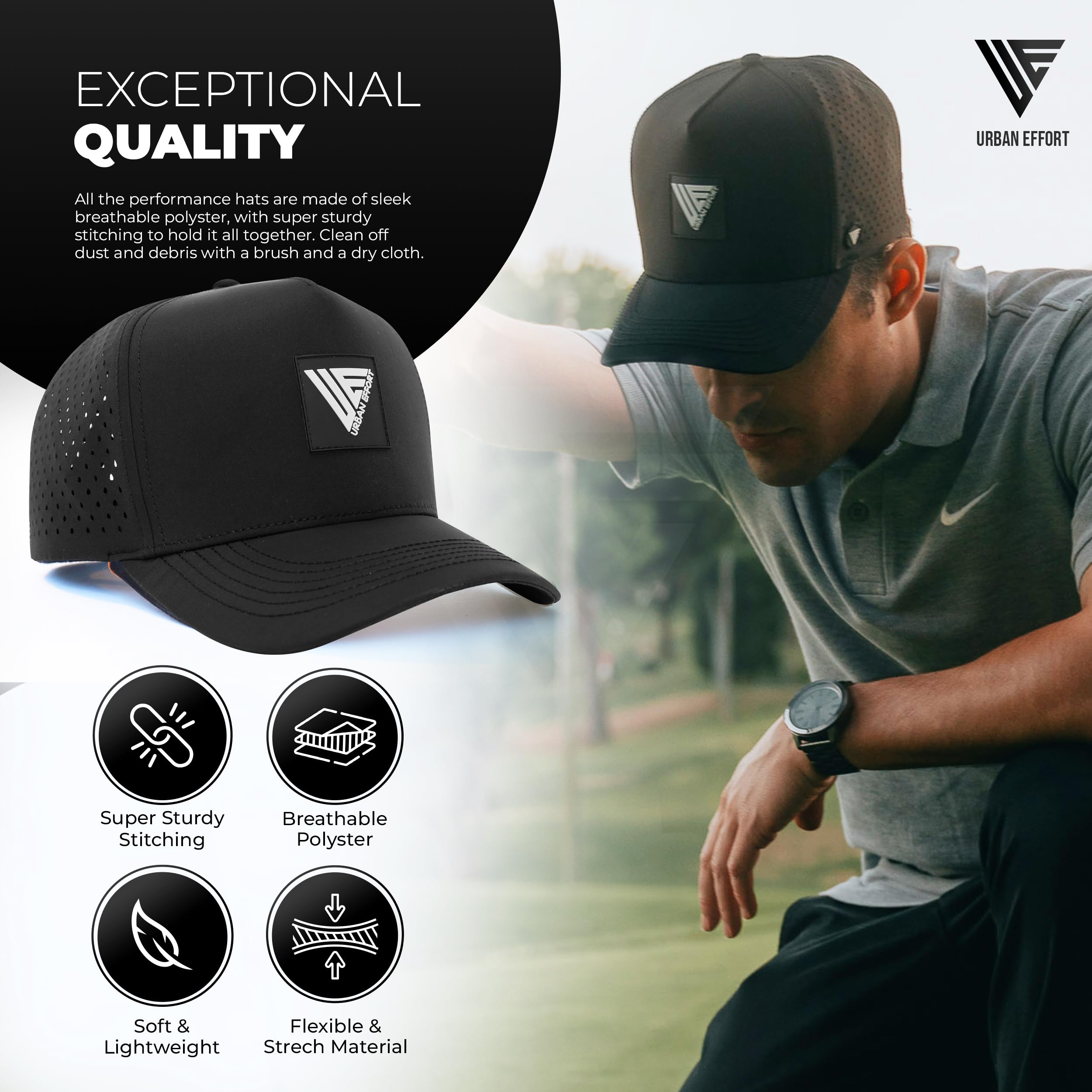 Water & Sweat Repellent: The Urban Effort Performance Hydro unisex hat is your go-to choice, featuring a rugged, well-ventilated design with hydrophobic capabilities for water resistance and a moisture-wicking lining that guarantees a dry hat and a cool head