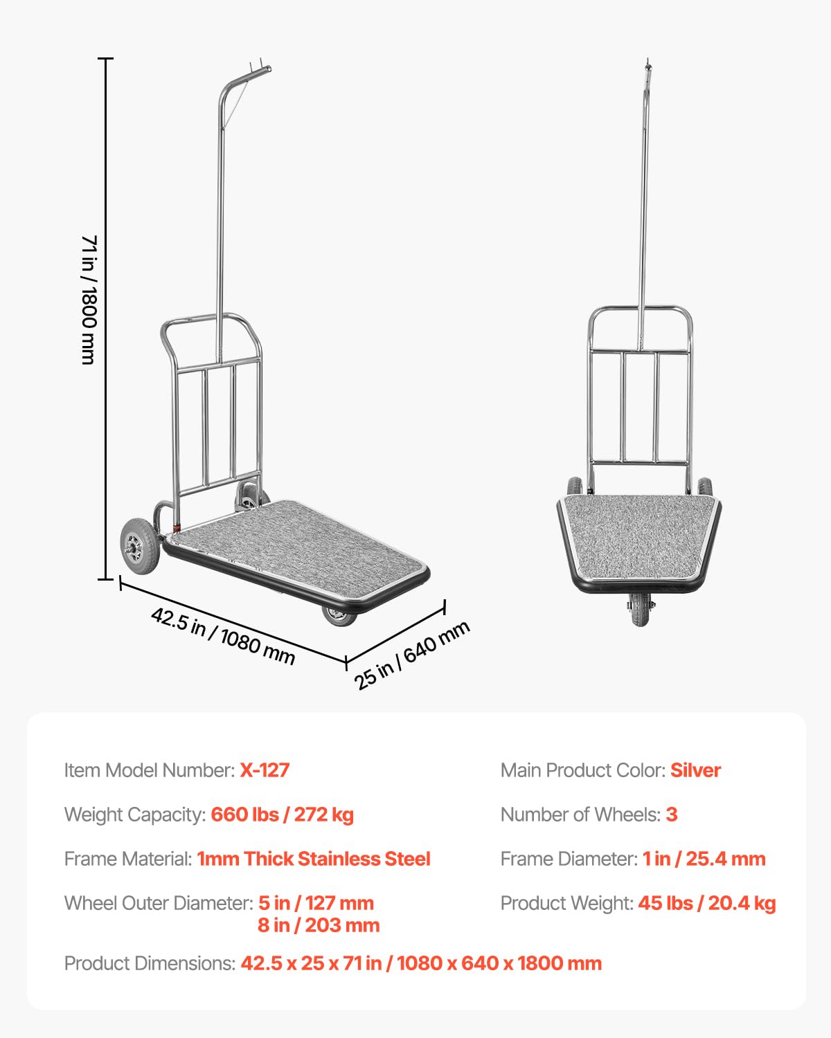 Heavy-Duty Capacity: This durable bellman cart measures 42.5 × 25 × 71 inches (108 × 64 × 180 cm) and holds up to 600 lbs! Its spacious base and top-mounted hanging rod make it easy to move multiple pieces of luggage, ideal for busy hotels, resorts, and apartments.