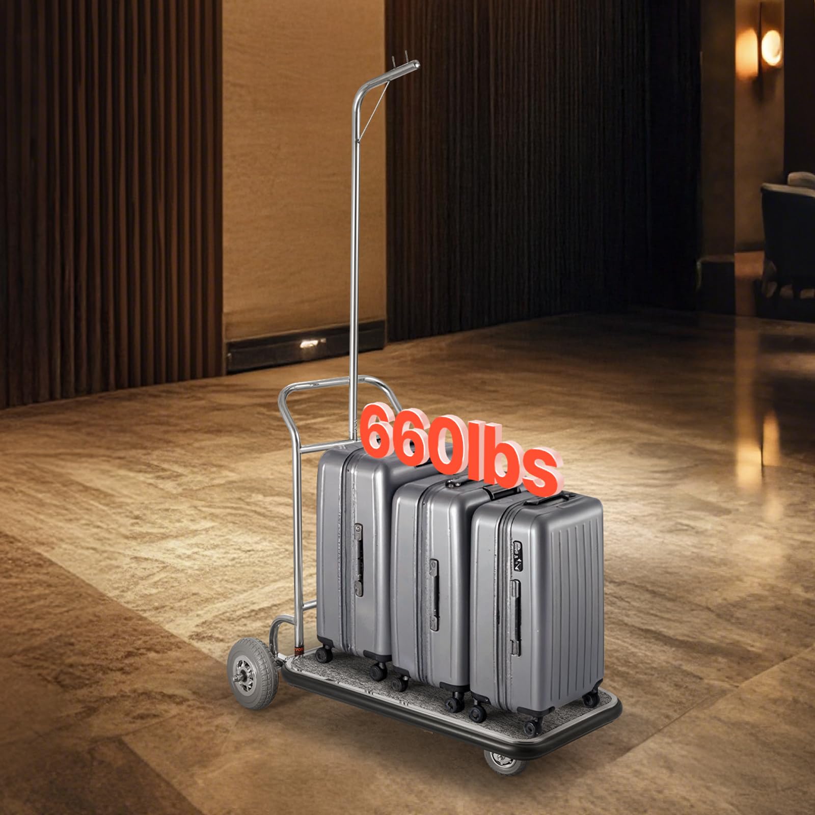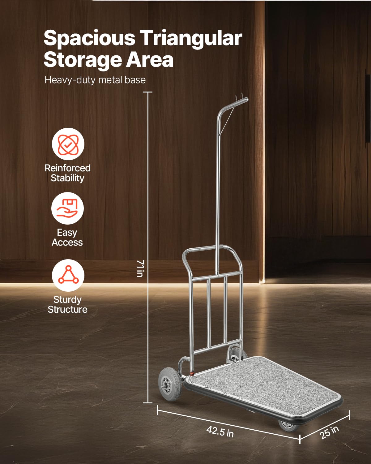 Smooth & Silent Rolling: With 3 heavy-duty rubber wheels—1 directional 5-inch and 2 swivel 8-inch wheels—this hotel luggage cart glides effortlessly over carpets, tiles, and wood floors. Low-noise wheels make transportation discreet and smooth, even when fully loaded.