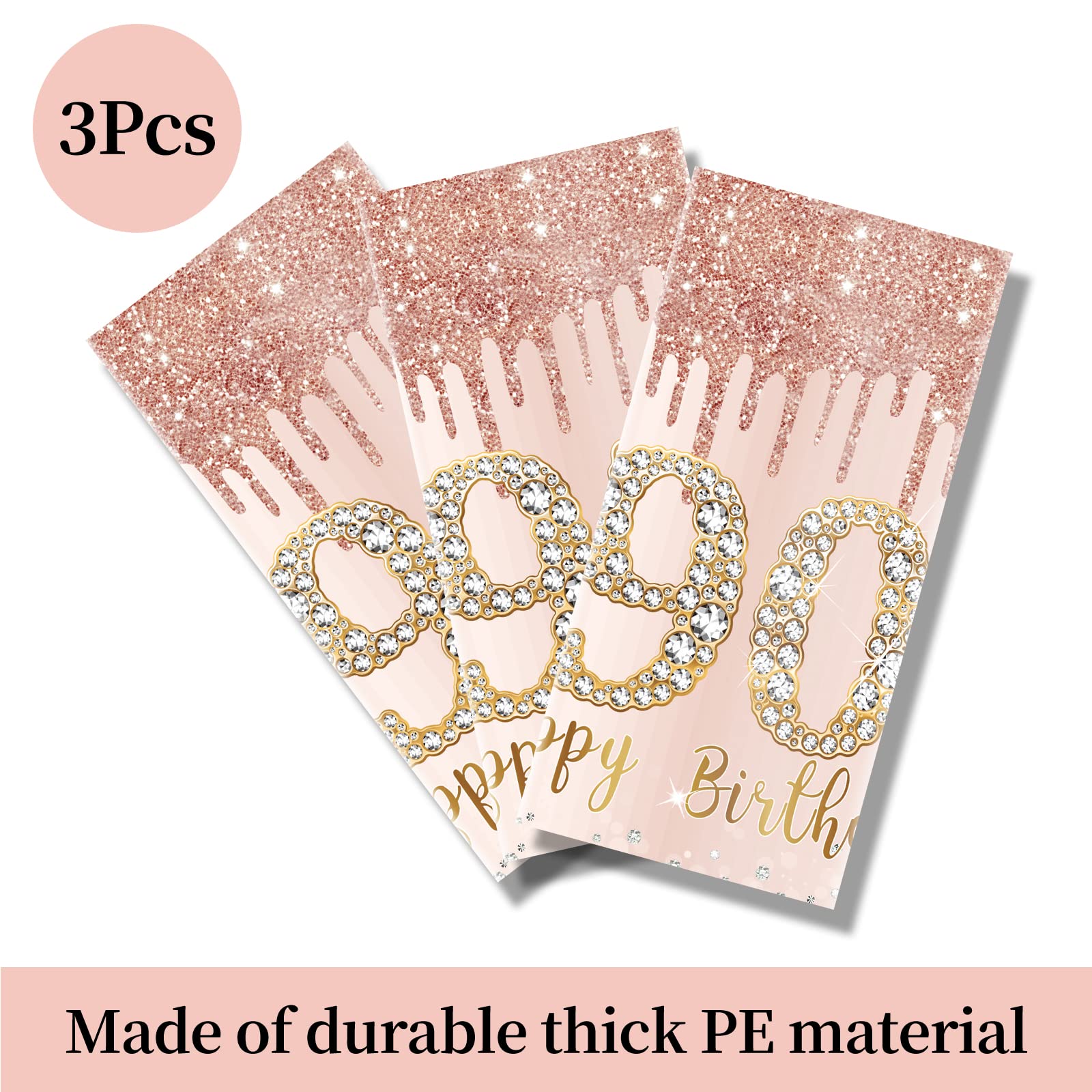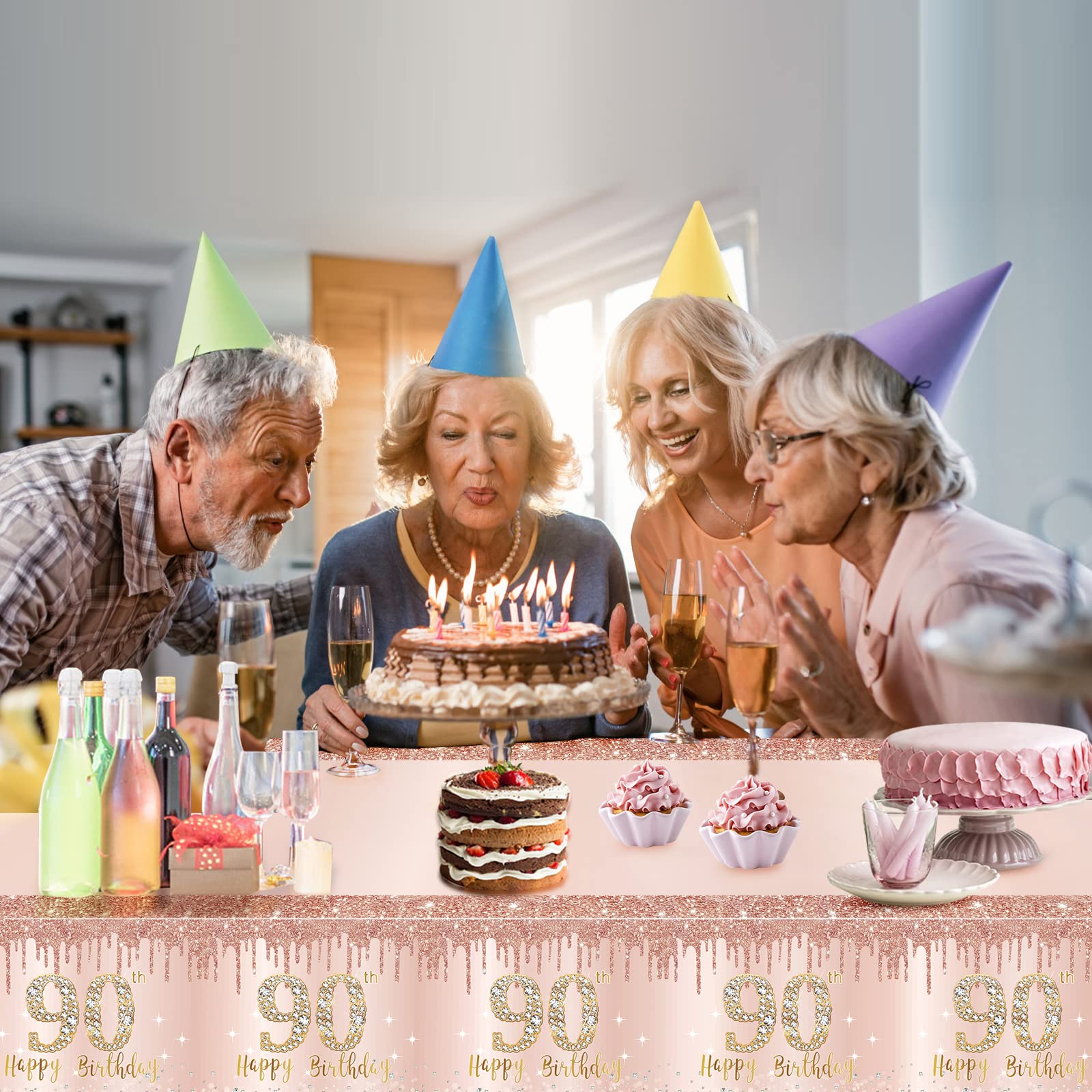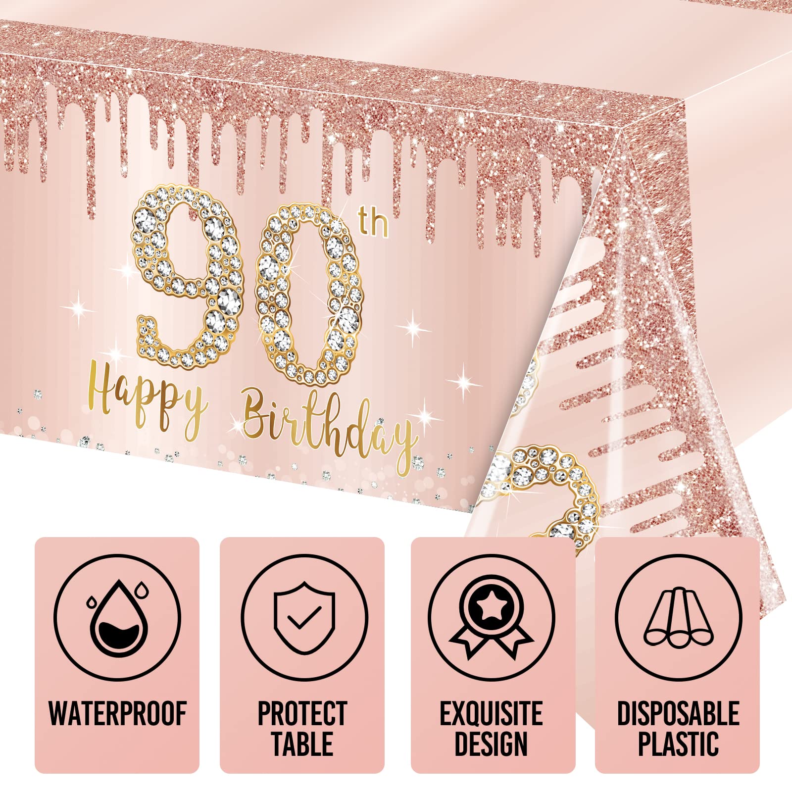 [You will get] - 3pcs pink rose gold 90th birthday tablecloth decorations for women. 54 x 108 inches, suitable to cover most rectangular table tops. [Note: Please measure table size before purchasing]