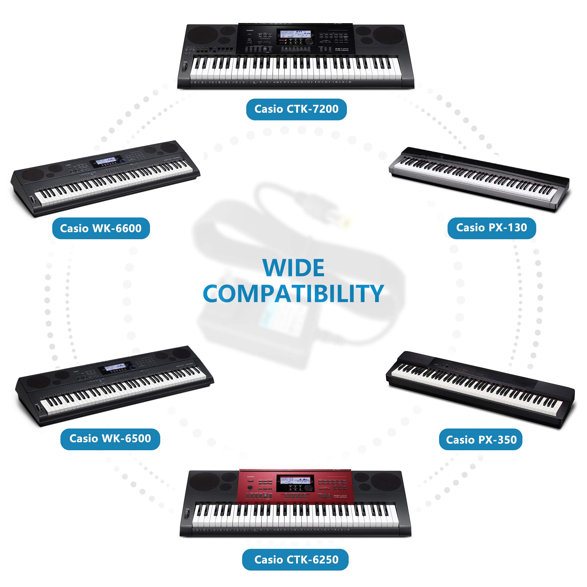 COMPATIBILITY: Casio CTK-6000 / CTK-6250 / CTK-6300 / CTK-6320 / CTK-7000 / CTK-7200 / CTK-7300 / CTK-7320 / WK-6500 / WK-6600 / WK-7500 / WK-7600 / PX-130 / PX-135 / PX-150 / PX-160 / PX-330 / PX-350 / PX-358 / PX-735 / PX-750 / PX-760 / PX-A100RD / PX-3S / PX-5SPRO / PX-7WE / AP-220 / AP-250 / AP-260 / AP-220BK / AP-250BK / CDP-120 / CDP-130 / CDP-135 / CDP-220 / CDP-230 / AT-3 / AT-5D. Replacement power supply for Casio Piano Keyboard P/N: ADA12150LW / AD-A12150LW.