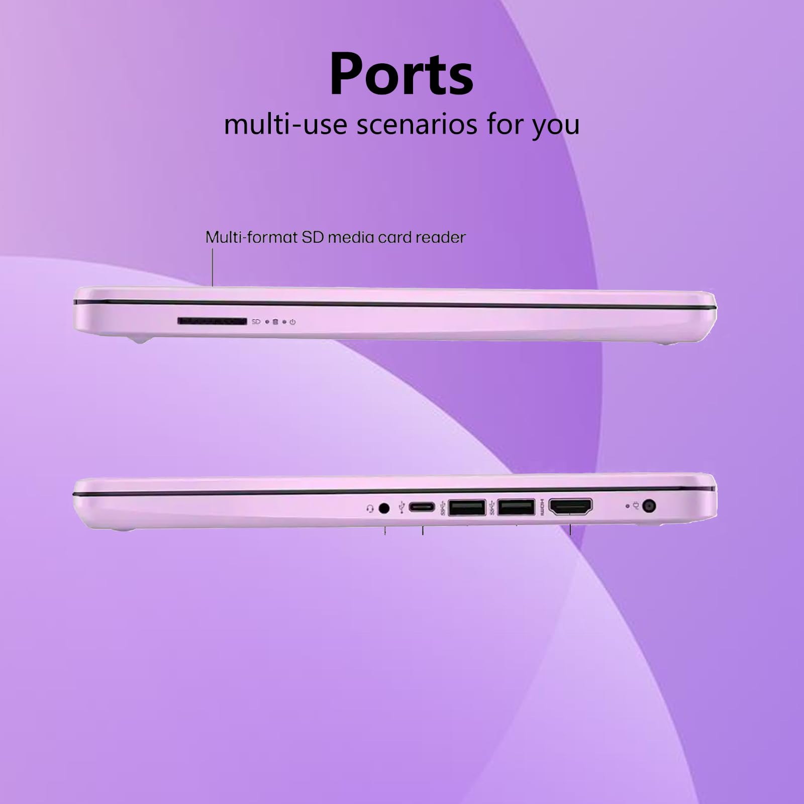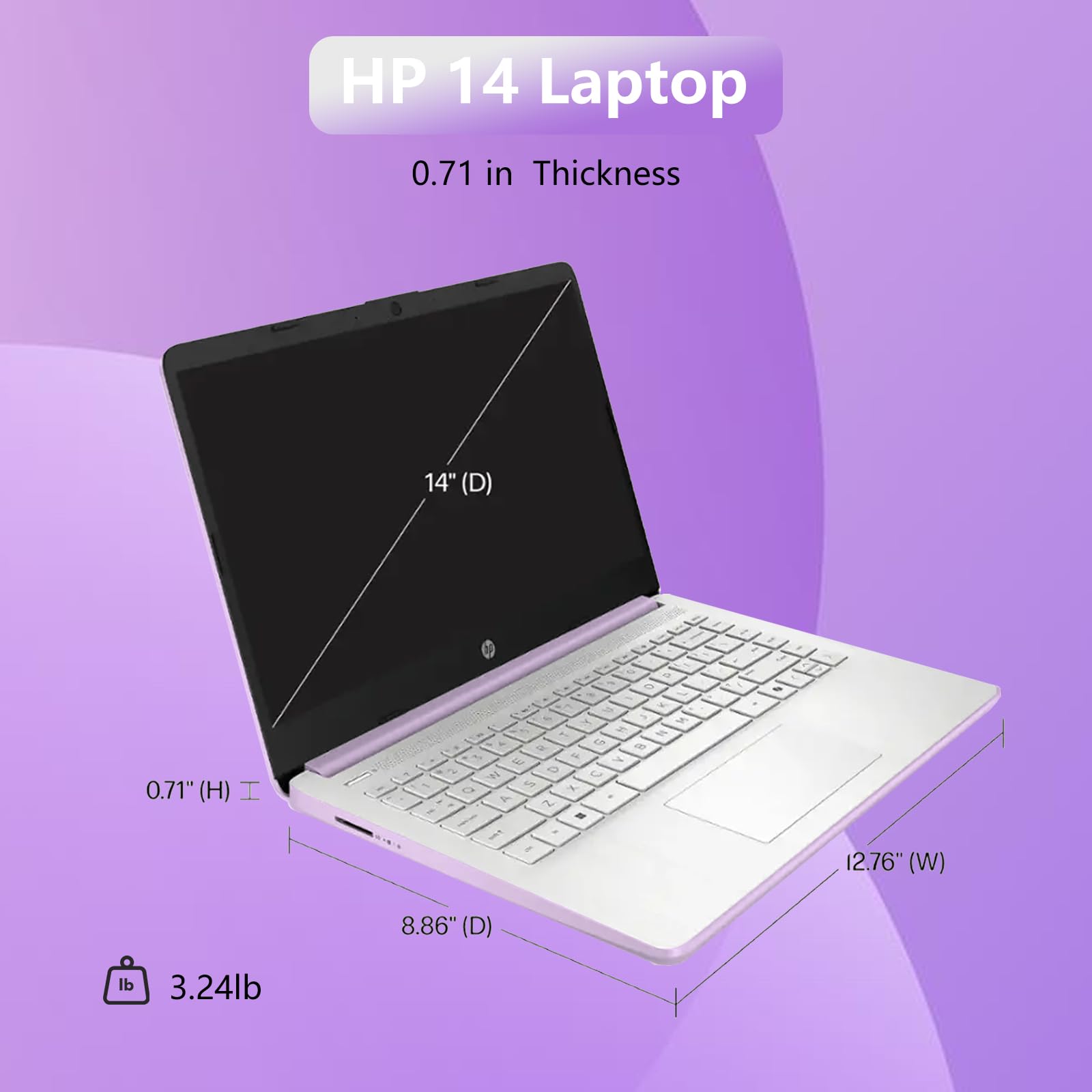 HP 14 Laptop The most suitable ultra-lightweight and cost-effective laptop for work and study. Processor: Intel Celeron N150, 4 Cores, 4 Threads, Up to 3.60 GHz Burst Frequency, 6 MB Cahce. Graphics: Intel Graphics Operating system: Windows 11 Pro Software: Free 1-year Microsoft Office 365 Subscription Memory: 16GB DDR4 Storage: 1.2TB Storage (128GB UFS+ 64GB MSD+1TB Cloud) Display: 14-inch diagonal, HD (1366 x 768), micro-edge, anti-glare, 250 nits Connectivity: Wi-Fi 6 and Bluetooth 5.4 combo Audio: HD Audio with stereo speakers Webcam: HP True Vision 720p HD camera with temporal noise reduction and integrated dual array digital microphones Ports: 1x USB Type-C 2x USB Type-A 1x Headphone/microphone combo 1x AC Smart pin 1x HDMI 1.4b Battery: 3-cell, 45 Wh battery, Up to 11.5 hours Dimensions (W x D x H): 12.76 x 8.86 x 0.71 in Weight: 3.24 lbs