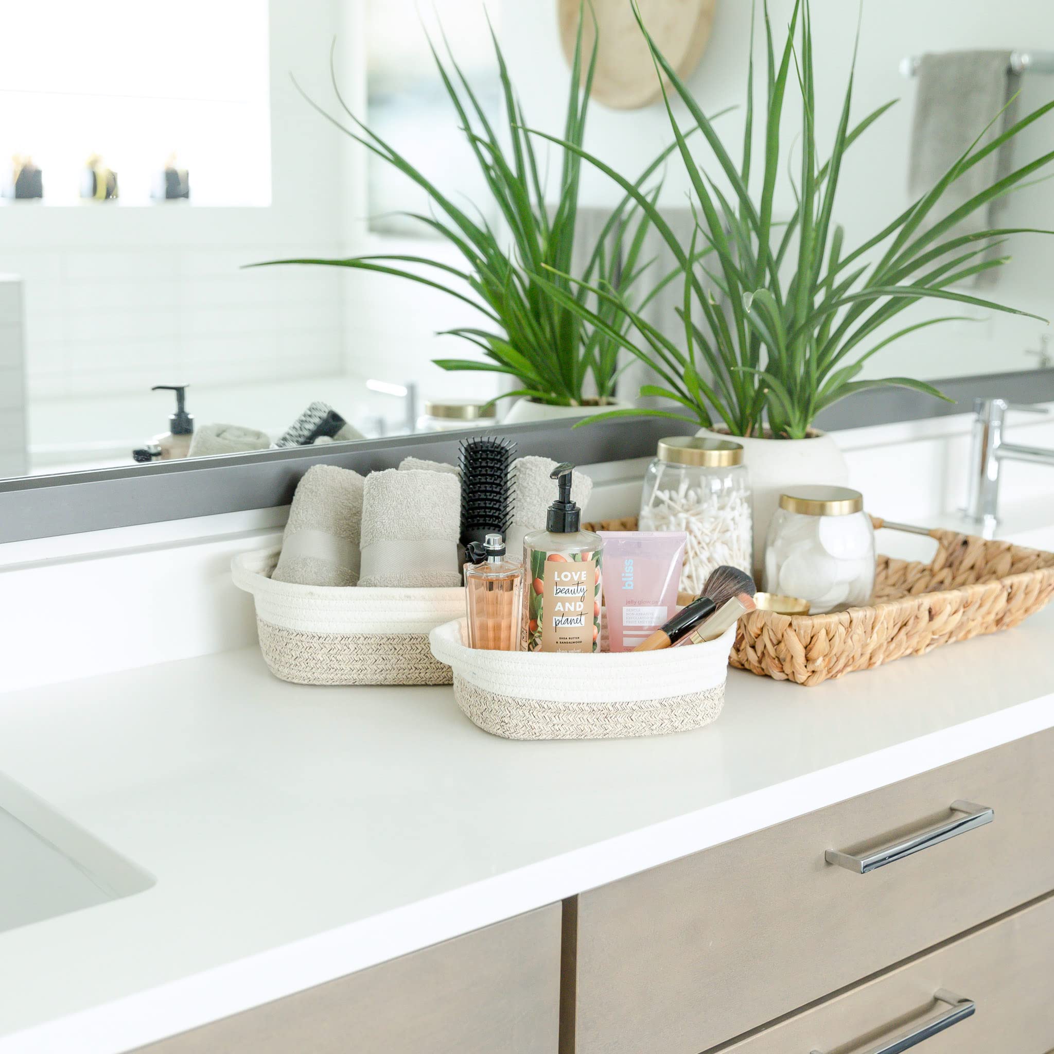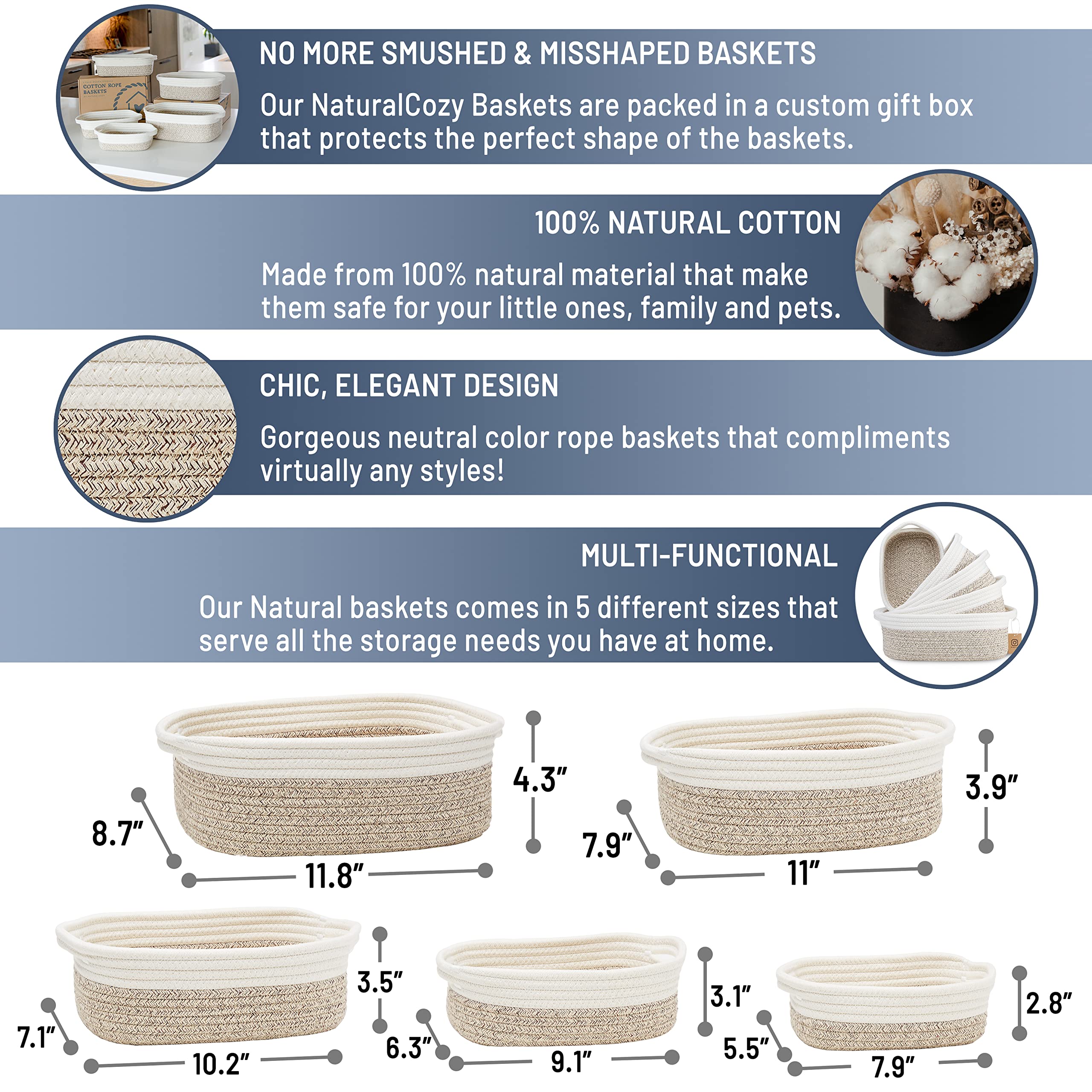 5 BASKETS FOR 5X THE ORGANIZING POWER: Life is messy...but your house doesn’t have to be! With 5 beautiful rope baskets for organizing, you’ll defeat messy rooms like a true supermom! Use the largest baskets for Montessori displays or countertop fruits holder, create the cutest dog toy storage or bathroom hand towel holder with the medium ones and stash jewelry or keys in the smallest. Biggest (11.8"x8.7"x4.3"), (11"x7.9"x3.9"), (10.2"x7.1"x3.5"), (9.1"x6.3"x3.1"), Smallest (7.9x5.5"x2.8")
