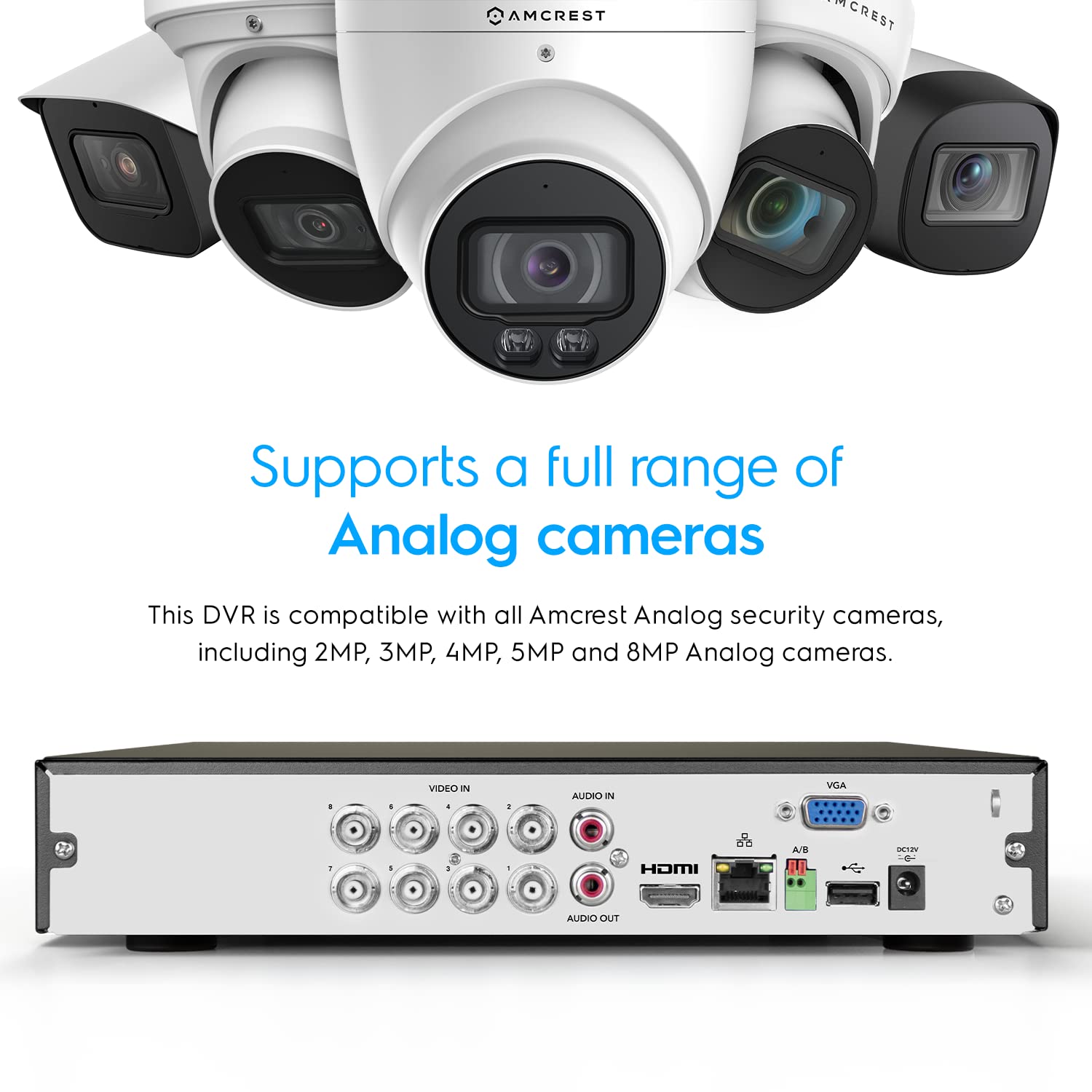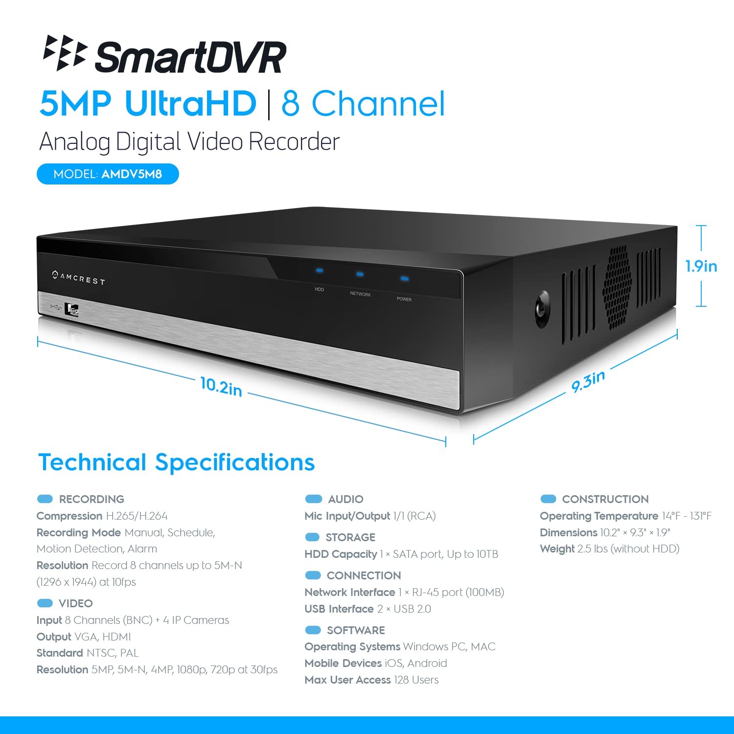 AMCREST MODEL : AMDV10818-1TB DVR FEATURES : View and Record in Widescreen with Remote Viewing on iPhone, iPad, and Android devices (with included Amcrest View Pro app). Supports Pentabrid AHD, TVI, CVI, 960H Analog and Amcrest IP Cameras (2CH). Pre-Installed 1TB Hard Drive (Supports up to 10TB Storage) for Continuous Recording at 8CH 1080p @30fps. Supports Long Distance Signal Transmission up to 984ft. Intelligent Video Footage Search and Playback. USB Backup Feature for Peace of Mind. DVR Dimensions: 10. 25 x 9. 25 x 1. 8 in. DVR Weight: 1. 9lbs. PACKAGE INCLUDES : 1 x 1080P 8-Channel Pentabrid DVR with Pre-Installed 1TB Hard Drive (AMDV10818-H5). 1 x DVR Power Adapter. 1 x Mouse. Quick Start Guide. 1 Year When Purchased from Amcrest. *Camera Power Supply and Coaxial Video Cables are NOT INCLUDED but are Required and SOLD SEPARATELY. *