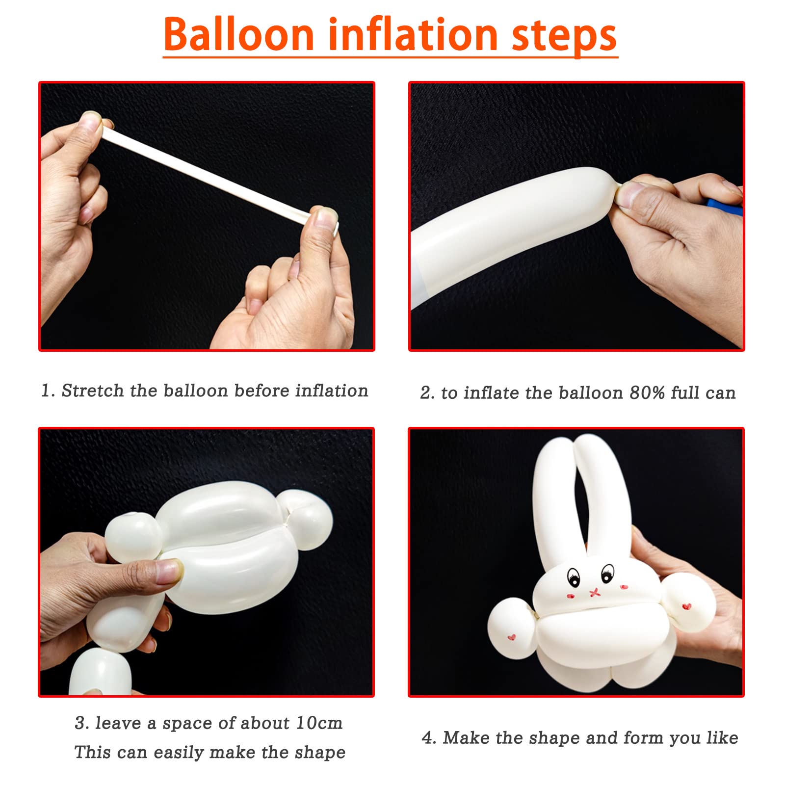 ✮【ATTENTION & WARNING】It is recommended to use hand-held balloon pump to inflate at a constant speed, Pull back and forth 5-7 times with appropriate force before inflation, Make long white balloons more flexible and convenient for DIY animal balloons, Please DO NOT overfill the twisty balloons and also avoid sunburn, overheat, pointed object and excessive friction.