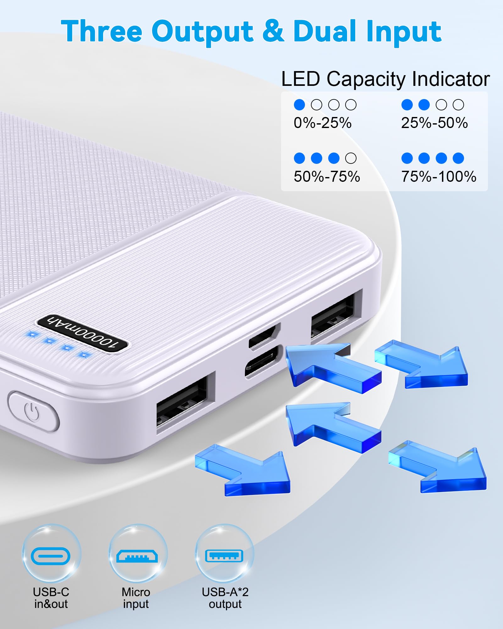 [USB C Input & Output] Upgrade portable battery charger has a USB-C In & Out port to perfectly fit your new iPhones, iPad and all upcoming USB-C devices. Also configured two USB-A output ports that recognize all connected devices and distribute load up to 5V 2.4A effectively. Therefore our usb c portable charger can work with not only all the phones, tablets but your smaller devices like AirPods, Bluetooth headphones, fitness trackers, smart watches, et