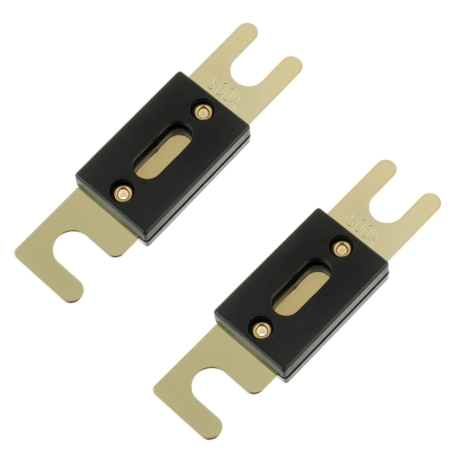 BOJACK 2 Pcs ANL Fuse Holder with 2 Pcs 500 Amp Fuses High-quality products, strong conductivity, waterproof and dustproof, durable and reliable. Fuse Size: 80x22.5x9 mm/ 3.15x0.9x0.35 inch (L*W*T); Fuse Holder Size: 123 x 37 x 40mm / 4.8 x 1.5 x 1.6 inch (L*W*H). Rated voltage: 32VDC Reach 100% of rated voltage and melt in 4 hours at the fastest. Reaching 200% of the rated voltage, melting is the slowest 10 seconds. It reaches 350% of the rated voltage and melts in 0.5 seconds at the slowest. Material: copper alloy, gold plating and PVC material Gold plating metal sheet construction with a clear protective non-conductive resistant cover Package Content: 2 * ANL fuse holder 2 * 500A ANL fuse