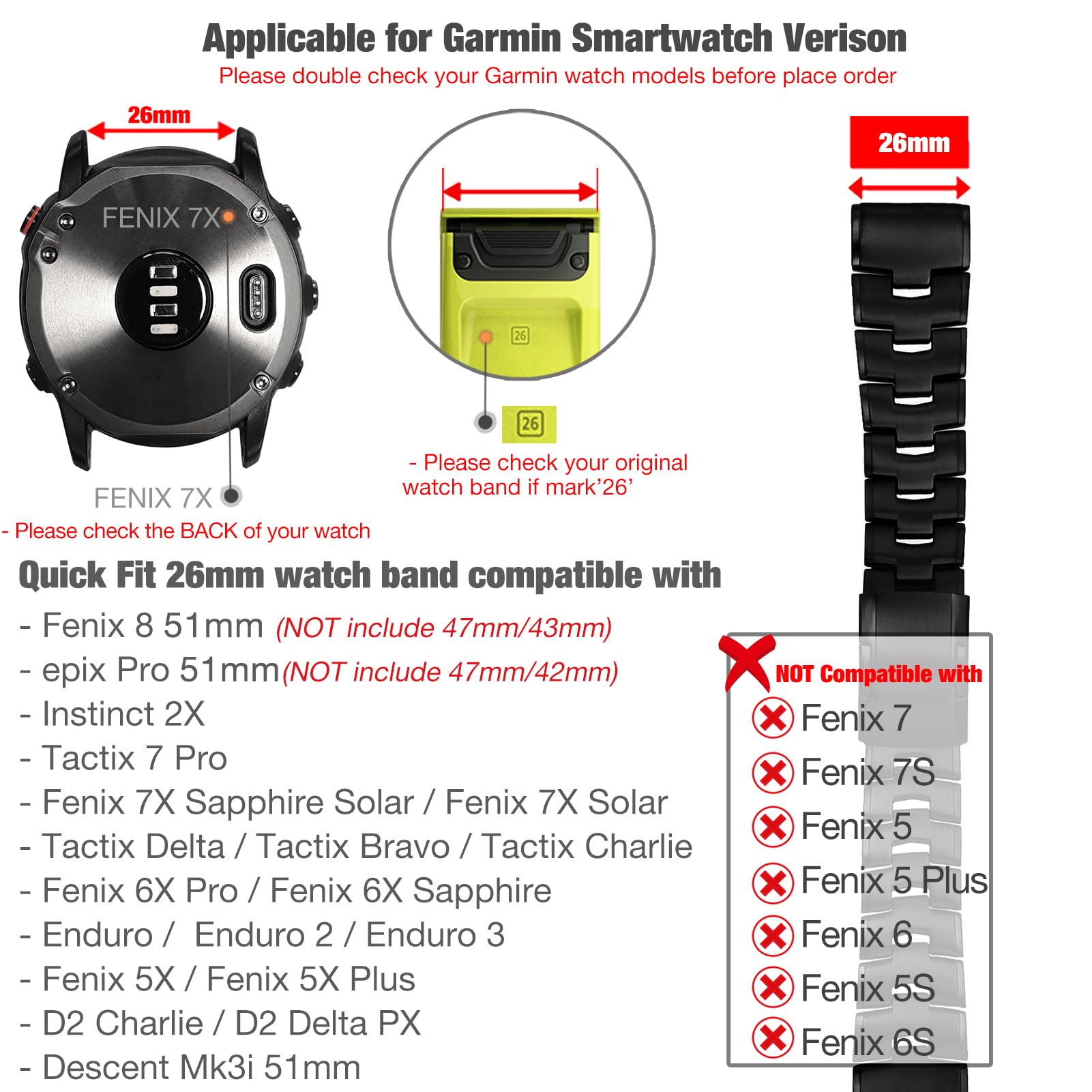 Compatible with Garmin Fenix 7X Sapphire Solar / Fenix 7X Solar, Fenix 5X/Fenix 5X Plus,Fenix 6X Pro/Fenix 6X Sapphire, Enduro, D2 Charlie/D2 Delta PXQuatix 3, Tactix Bravo/Tactix Charlie/Tactix Delta !!! NOT NOT NOT for 22mm Fenix 5/6/7 or 20mm Fenix 5S/6S/7S,Watch NOT included.