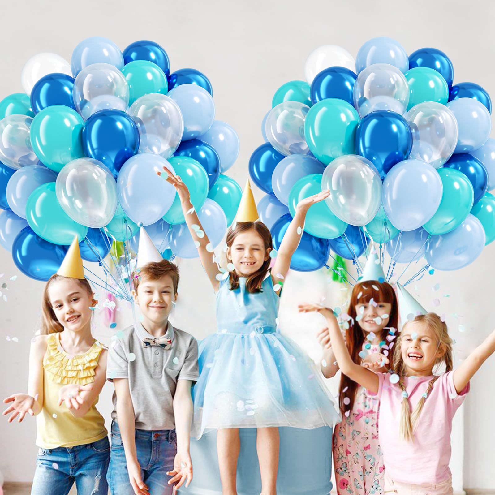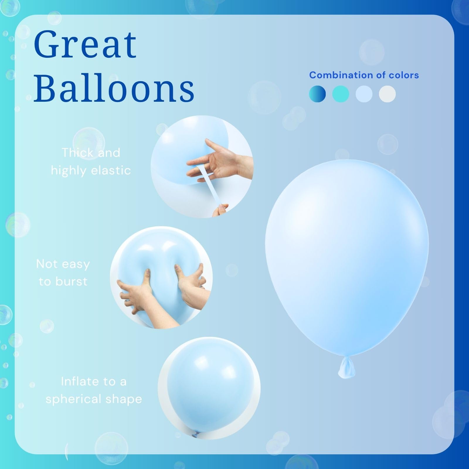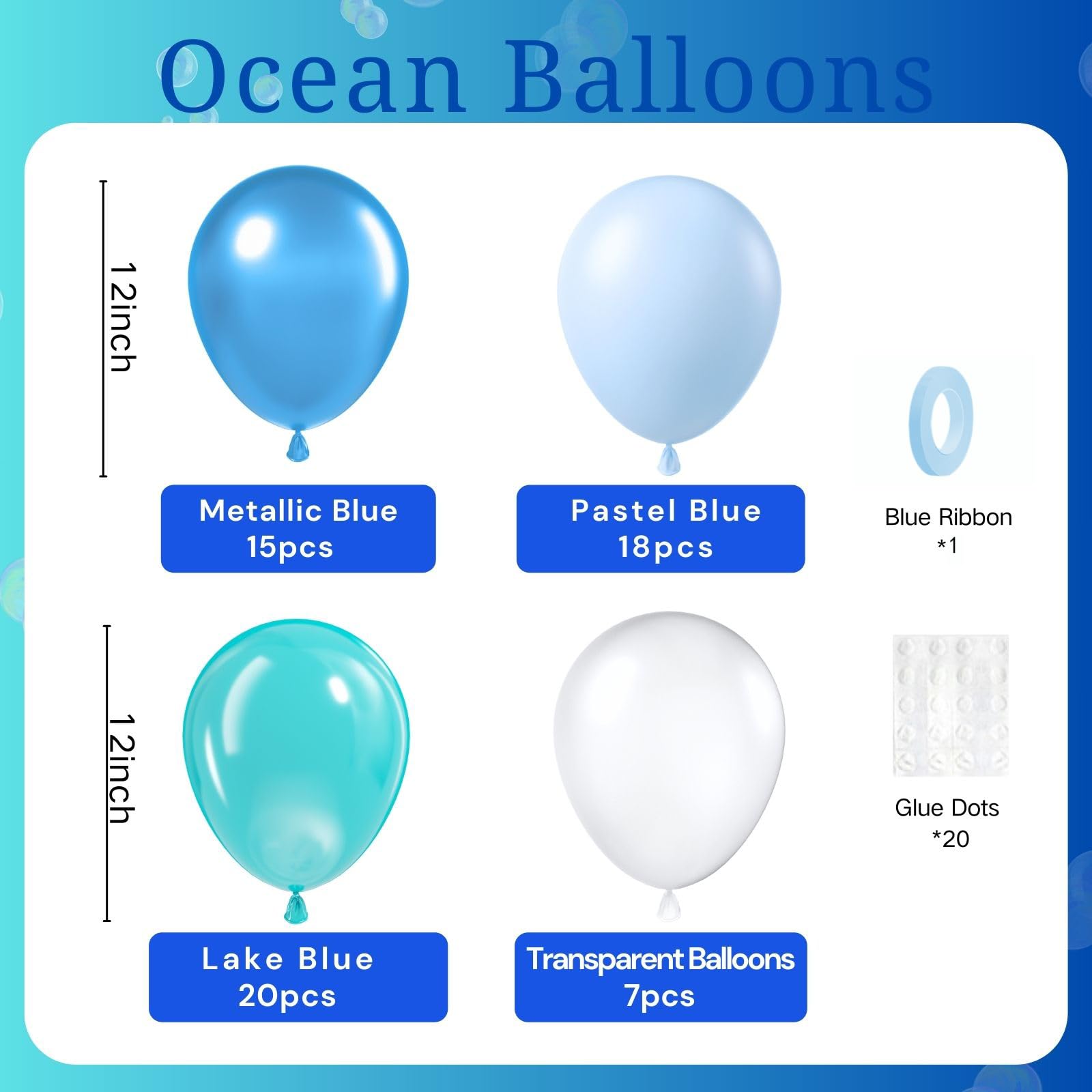 Package Include: 60pcs 12 inch ocean balloons (metallic blue balloonsx15, teal blue balloonsx20, pastel blue balloonsx18, clear balloonsx7 ), 1pcs glue dots, 1pcs blue ribbons