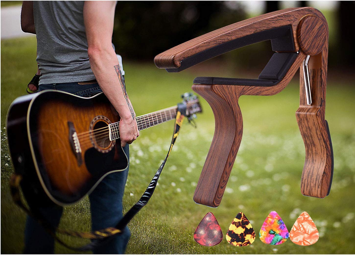 Package Content: 1 * Capo and 4 * pick PROFESSIONAL CAPO-Comes with a lifetime warranty.