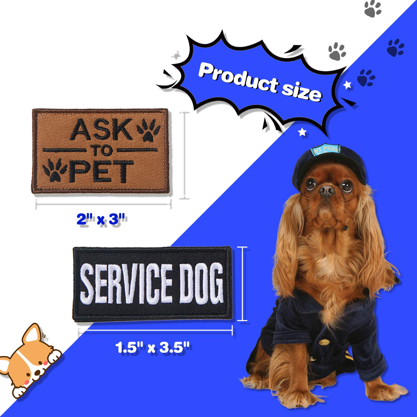 Size Details: there are 2 sizes of service dog patches, 5 of which are 2 inch x 3 inch, suitable for vest, and the other 5 patches are 1.5 inch x 3.5 inch, suitable for both harness and vest