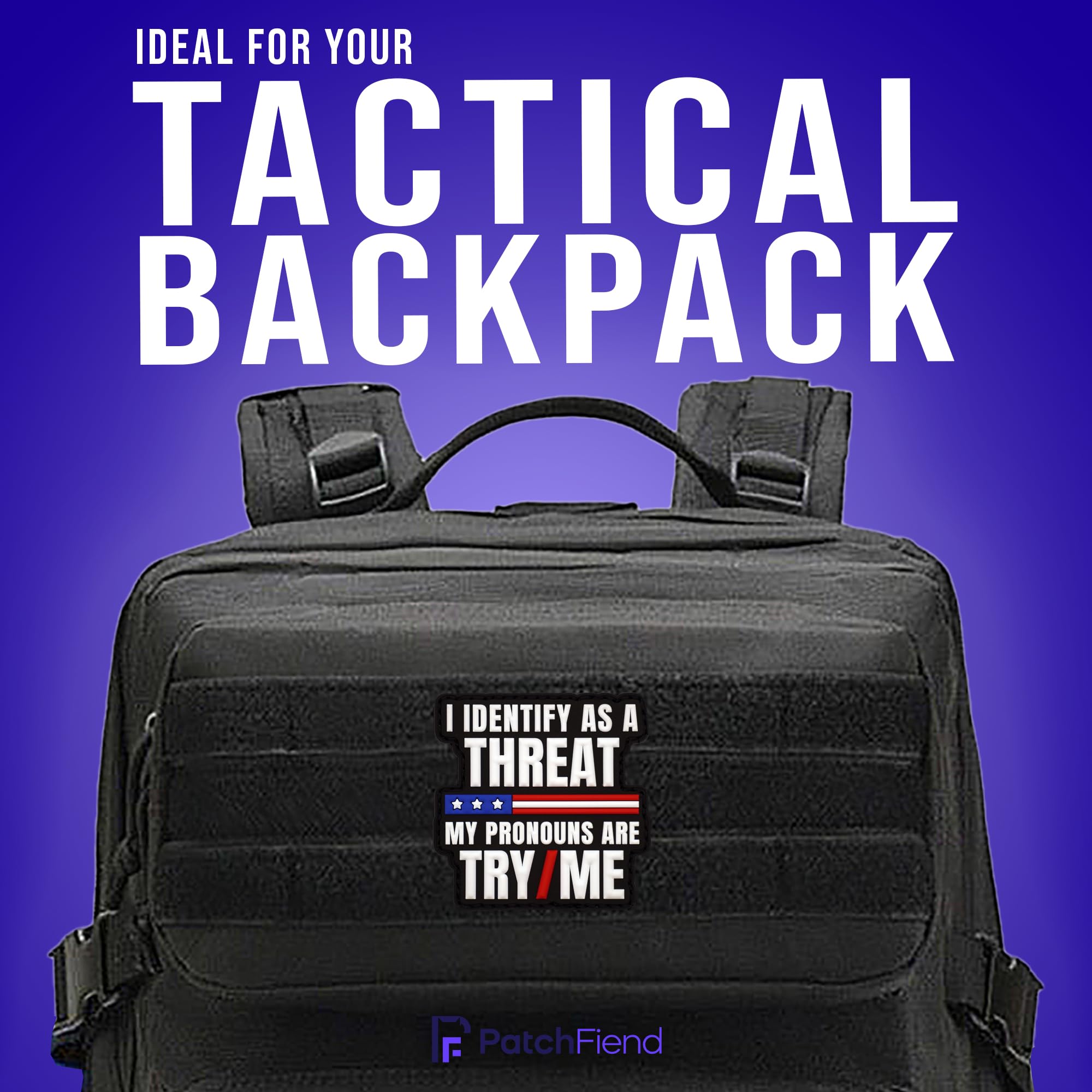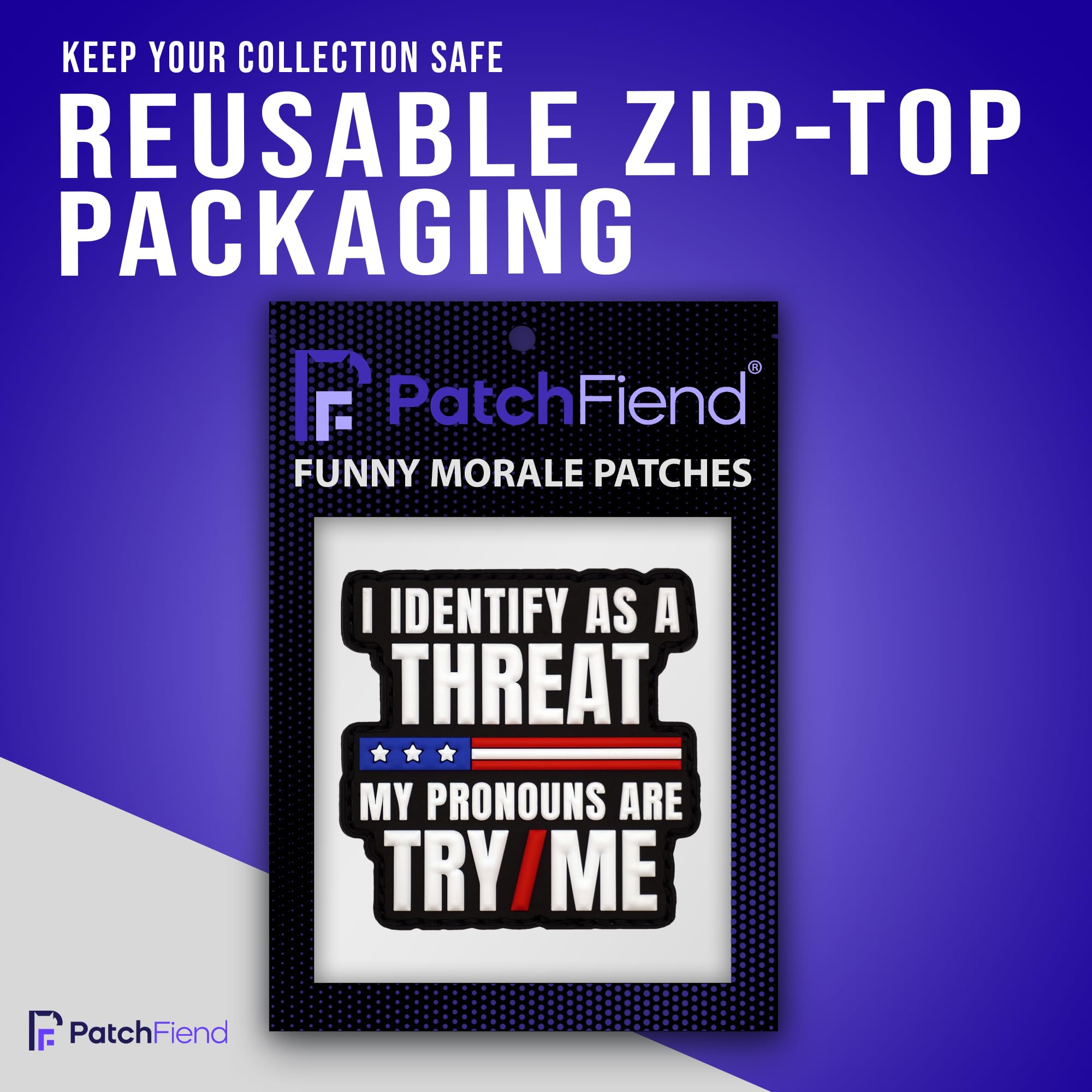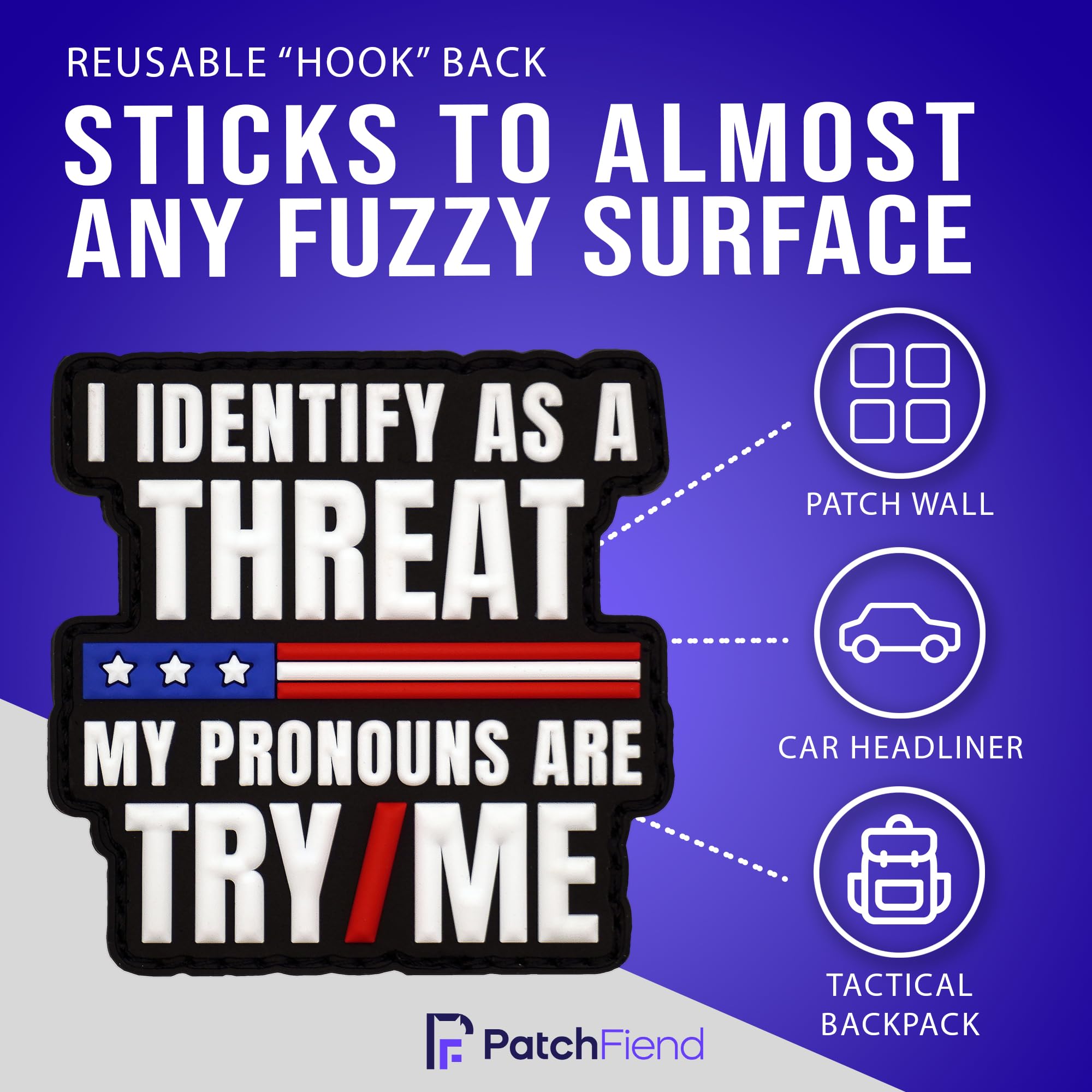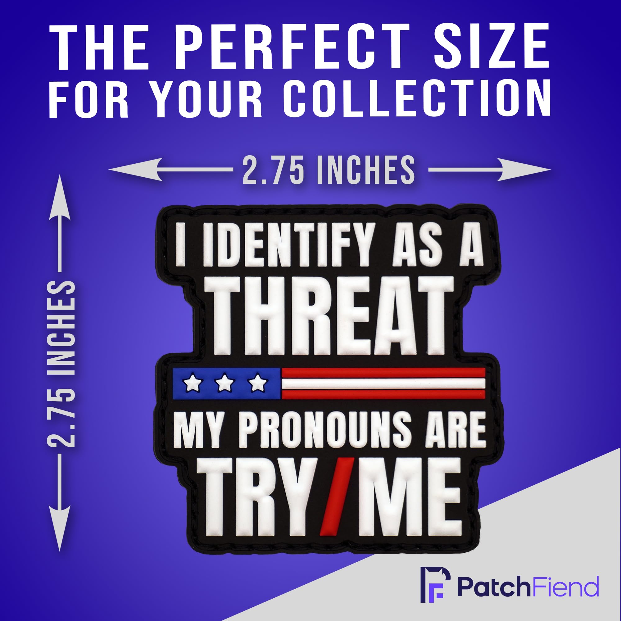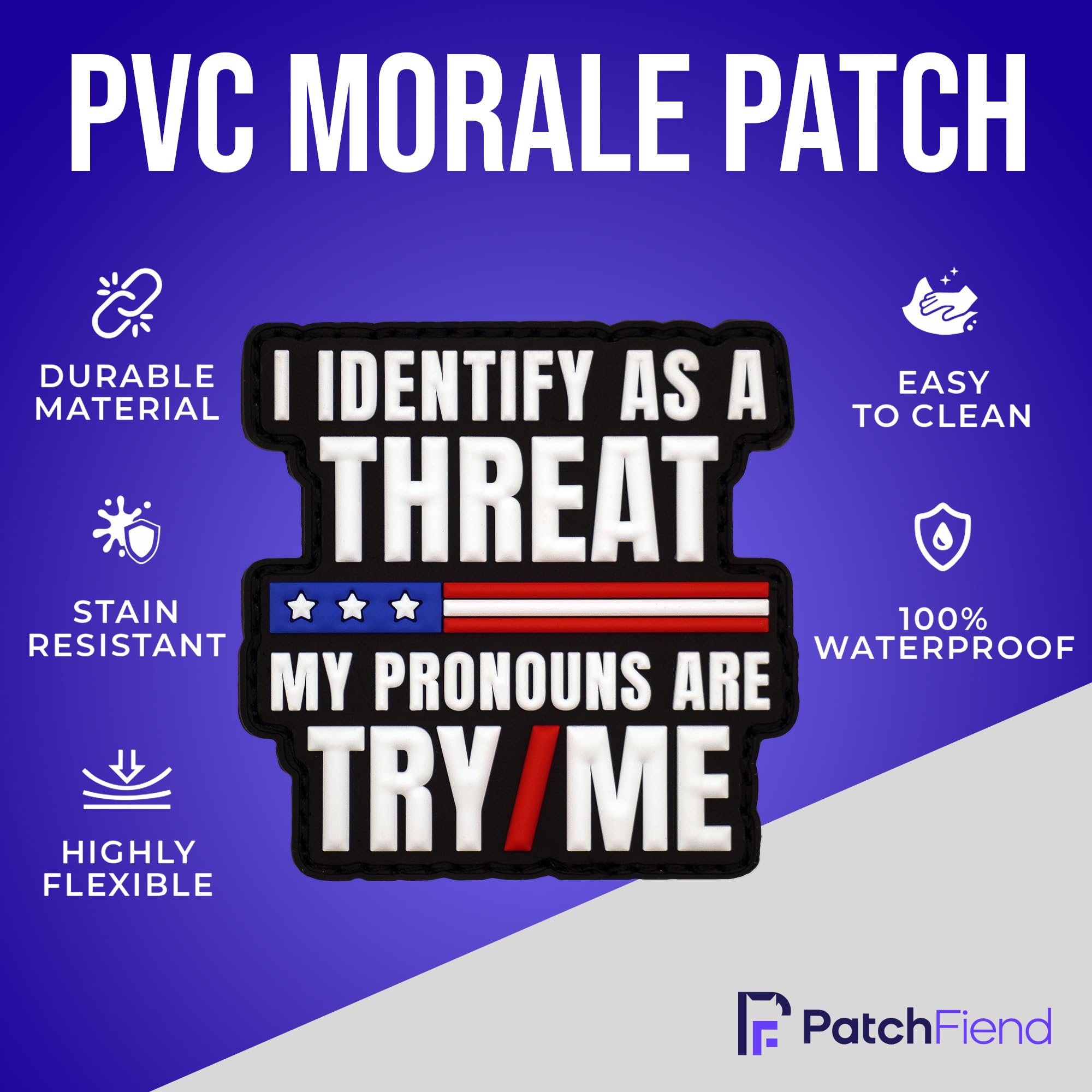 Introducing the My Pronouns are Try / Me PVC Morale Patch, a morale patch that speaks volumes without saying a word! This morale patch is more than just a decoration - it's a statement. Our PVC morale patch is the perfect addition to your military backpack or tactical bag, adding a touch of fun and personality. It's the ideal accessory for your tactical gear, or even to stick on your dog's harness! Crafted from durable PVC, this morale patch is built to withstand rough and tumble situations. The hook backing ensures it stays put, whether you're out in the field or just hanging out. It's like a military patch with a sense of humor. Our Try Me morale patch is inspired by woke culture. But we've given it a fun twist, presenting it in a cheeky patriotic style. It’s a cool patch with a big attitude. This custom patch is perfect for all you meme aficionados, based thinkers, and fans of funny patches. This morale patch is also hook backed, making it easy to attach and remove from your gear. Whether it’s your tactical backpack, tactical bag, or even your service dog’s harness, this patch adds a fun and humorous touch. And for you airsoft and anime fans, this patch will definitely give your gear a unique look. The Try Me PVC Morale Patch is the perfect size (2.8 x 2.8) to fit on most tactical patches hook spaces. It's not too big to be overwhelming ( the morale patch is 2.8 x 2.8 inches), and not too small to go unnoticed. It's just the right size to catch the eye and spark a conversation. Whether you're a fan of the 'no step on snek' meme, ghost mask cod, star wars, or just love cool patches, this morale patch is sure to bring a smile to your face. It's a little piece of humor you can take with you wherever you go. So why wait? Add a dash of fun to your military gear, tactical gear, or even your dog's harness, with the Try Me Pronouns PVC Morale Patch. Because sometimes, you just gotta say it how it is!