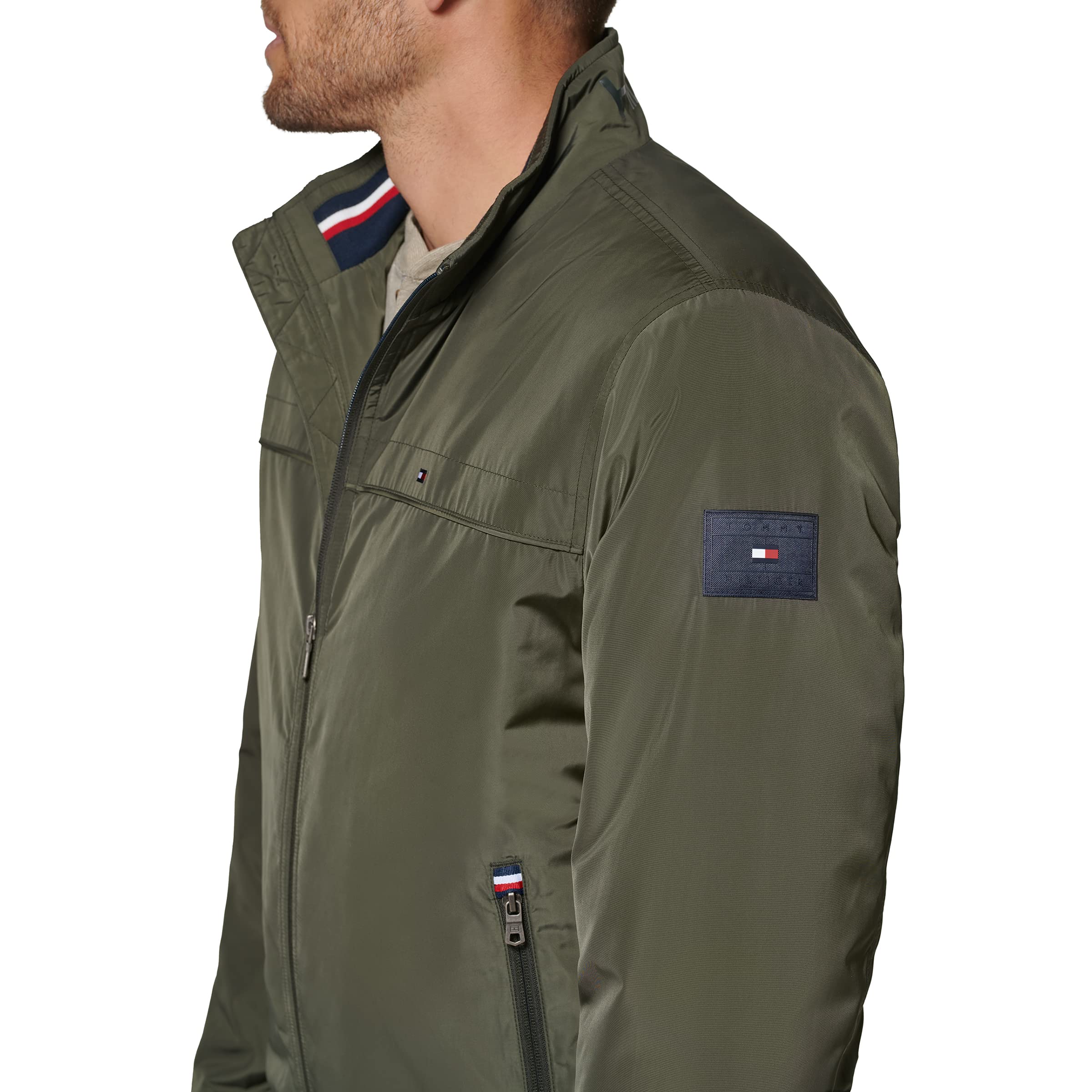 STYLISH FEATURES: Hilfiger printed contrast branded logo on back neck, signature Tommy flag at left chest and rubber logo patch on left arm; Piping across chest and back for added detail; Quilted interior lining
