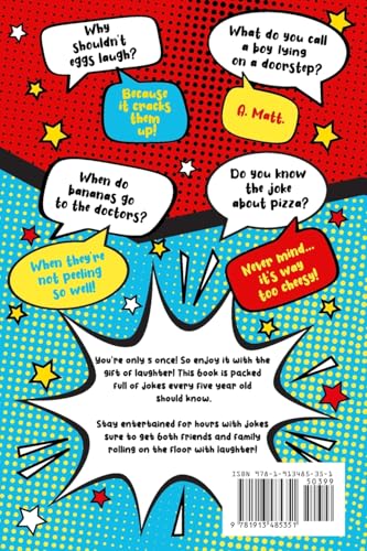 Q. What do you call a boy lying on a doorstep? A. Matt Q. When do bananas go to the doctors? Q. When they’re not peeling so well! An awesome collection of jokes every 5 year old should know. These side-splitting jokes will tickle your funny bone and effortlessly improve your reading skills. Perfect to get both friends and family rolling on the floor with laughter! Featuring: Share laughter ― This powerpack of punchlines is perfect for the whole family to enjoy. Fun skill-building ― Giggling at jokes keeps children engaged, which helps boost reading comprehension and enjoyment. You’re only 5 once! So enjoy it with the gift of laughter! Keep any 5 year old entertained for hours - with this perfect combination of laughter and learning. An ideal birthday or Christmas gift for every 5 year old. This must-have book is a guaranteed winner for all 5 year olds Click “Add to Cart” now and put a smile on their face!